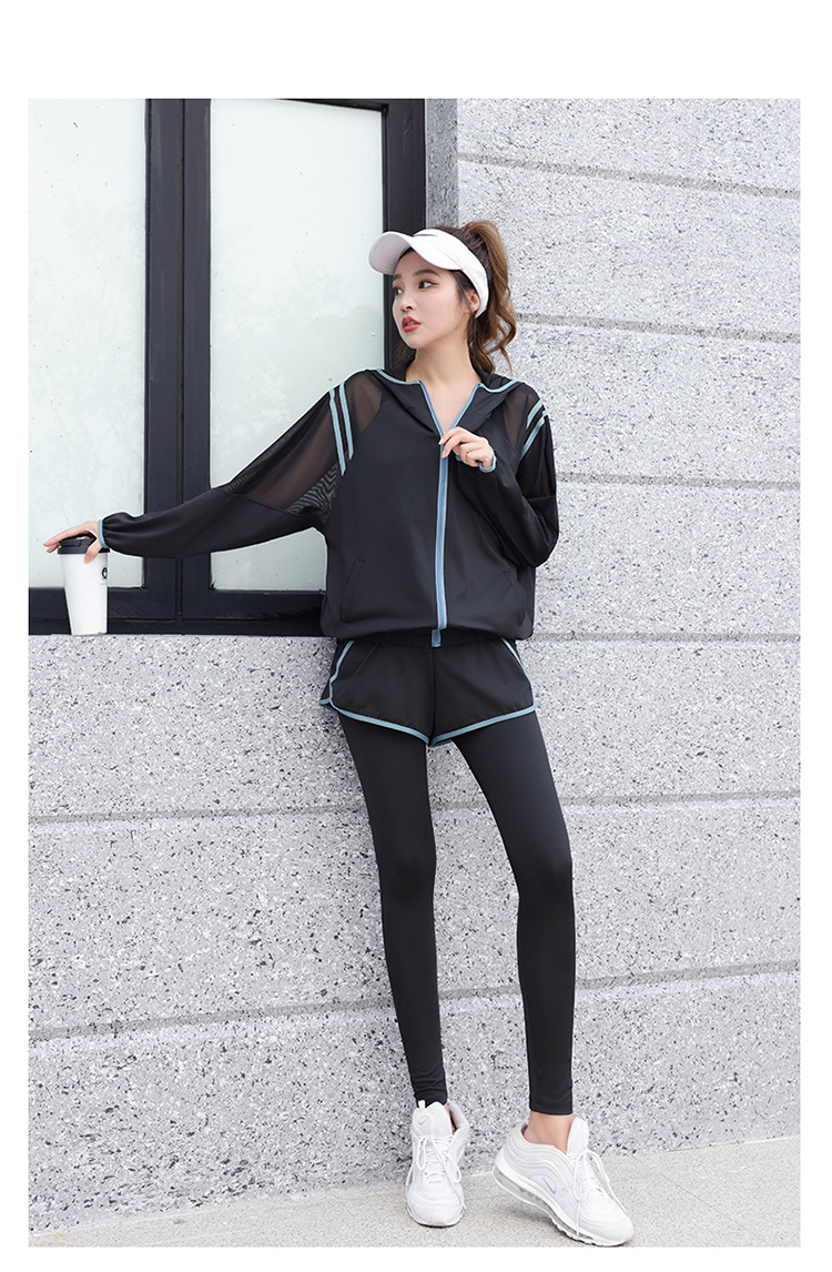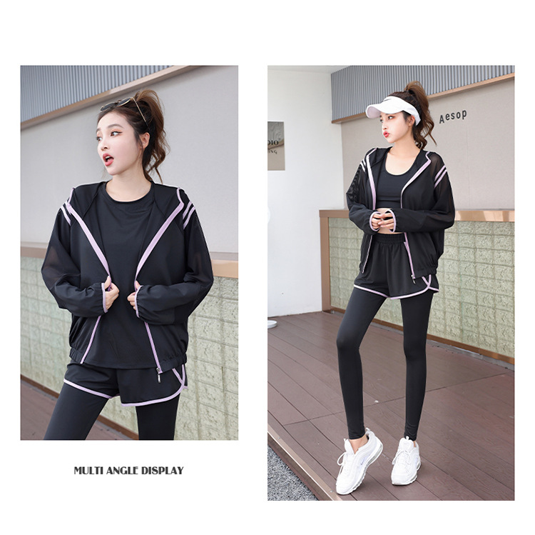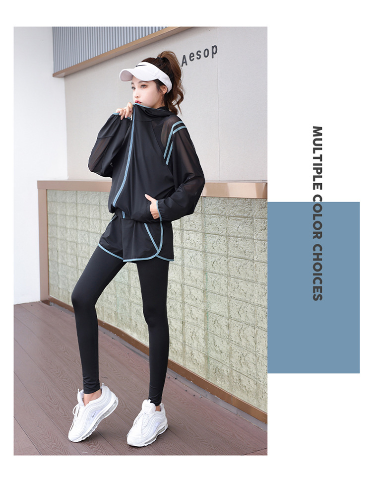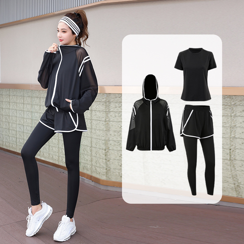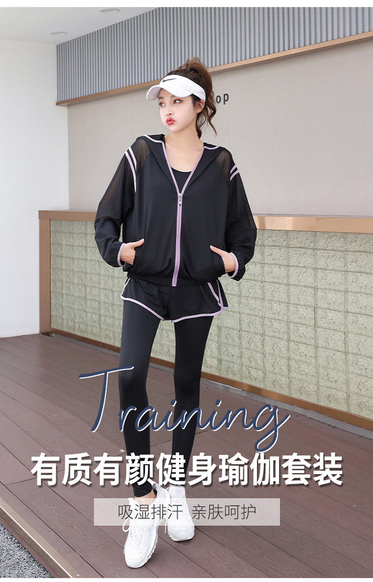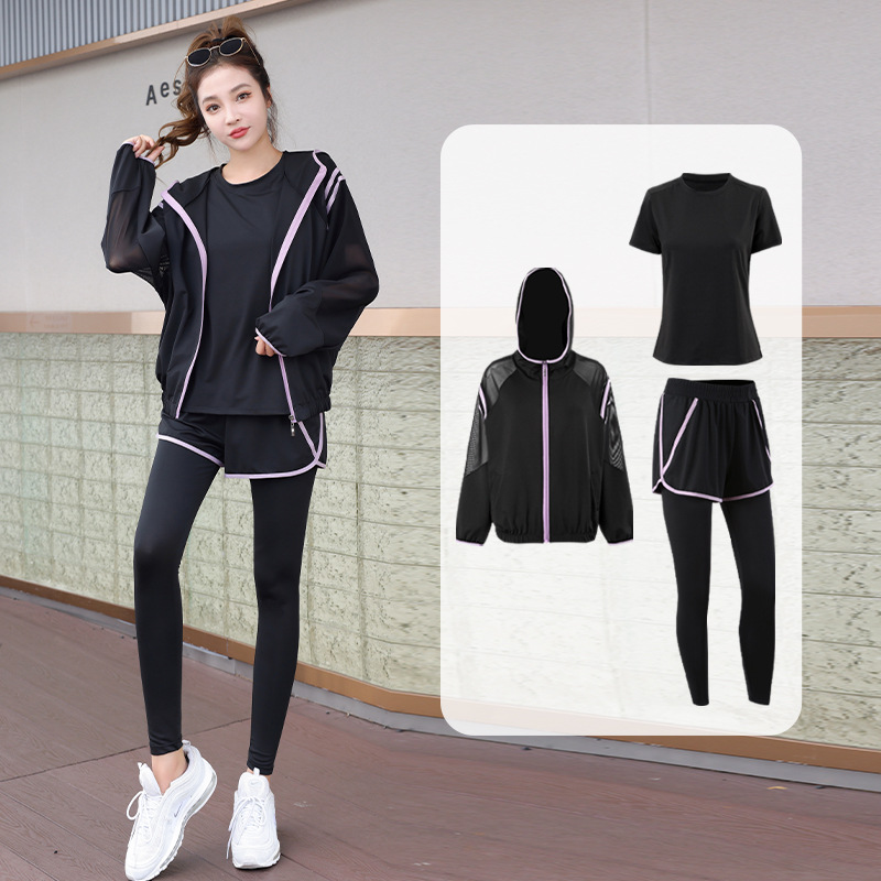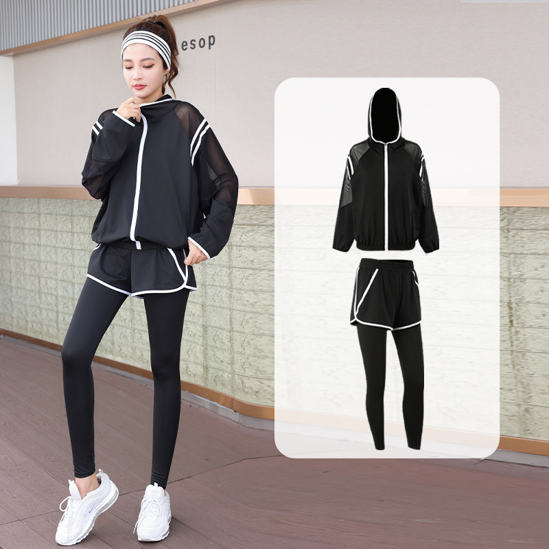 요가 의류 세트 2023 새로운 메쉬 스티치 가짜 투피스 바지와 휴대 전화 빠른 건조 달리기 운동복