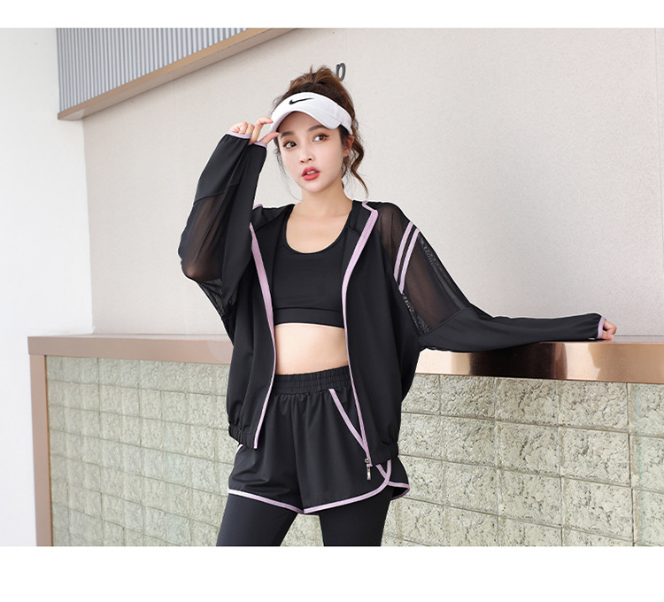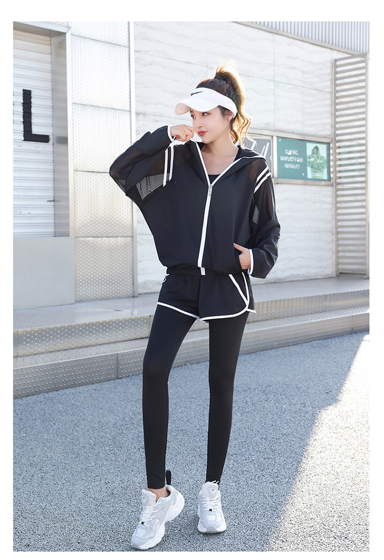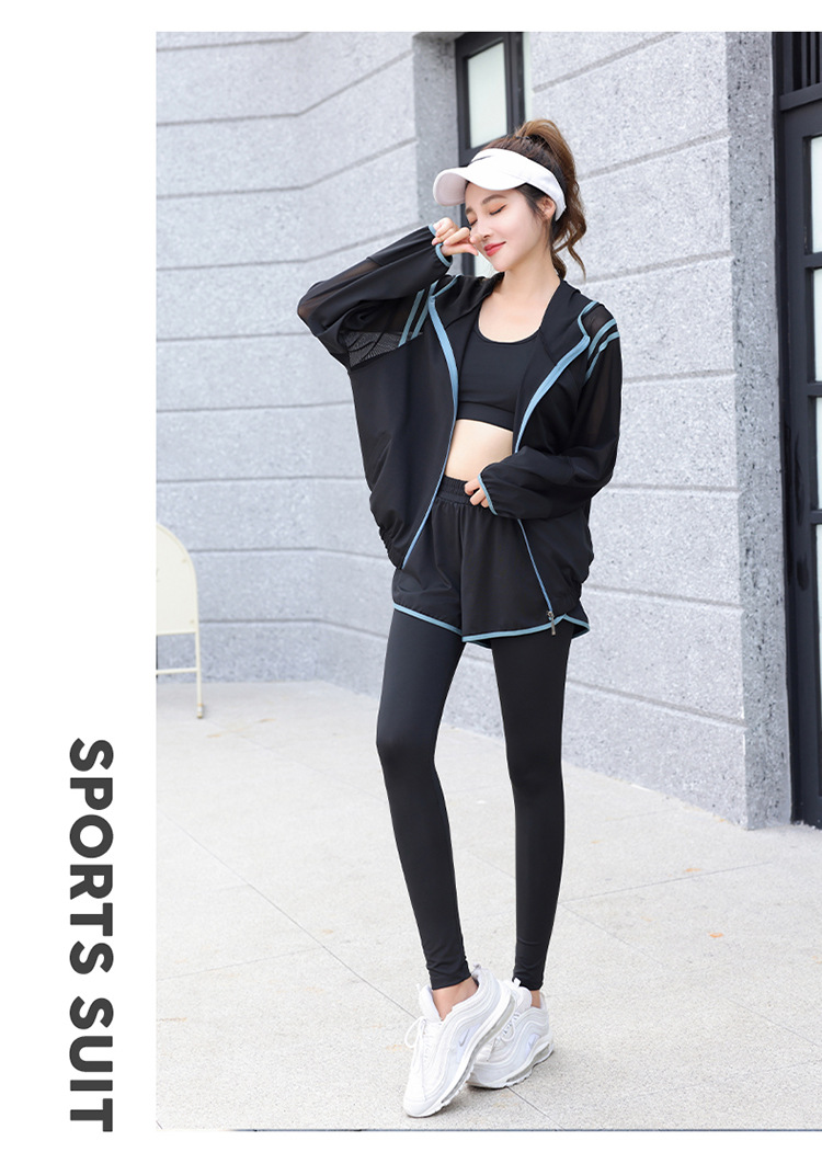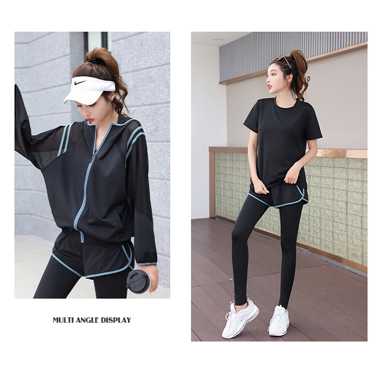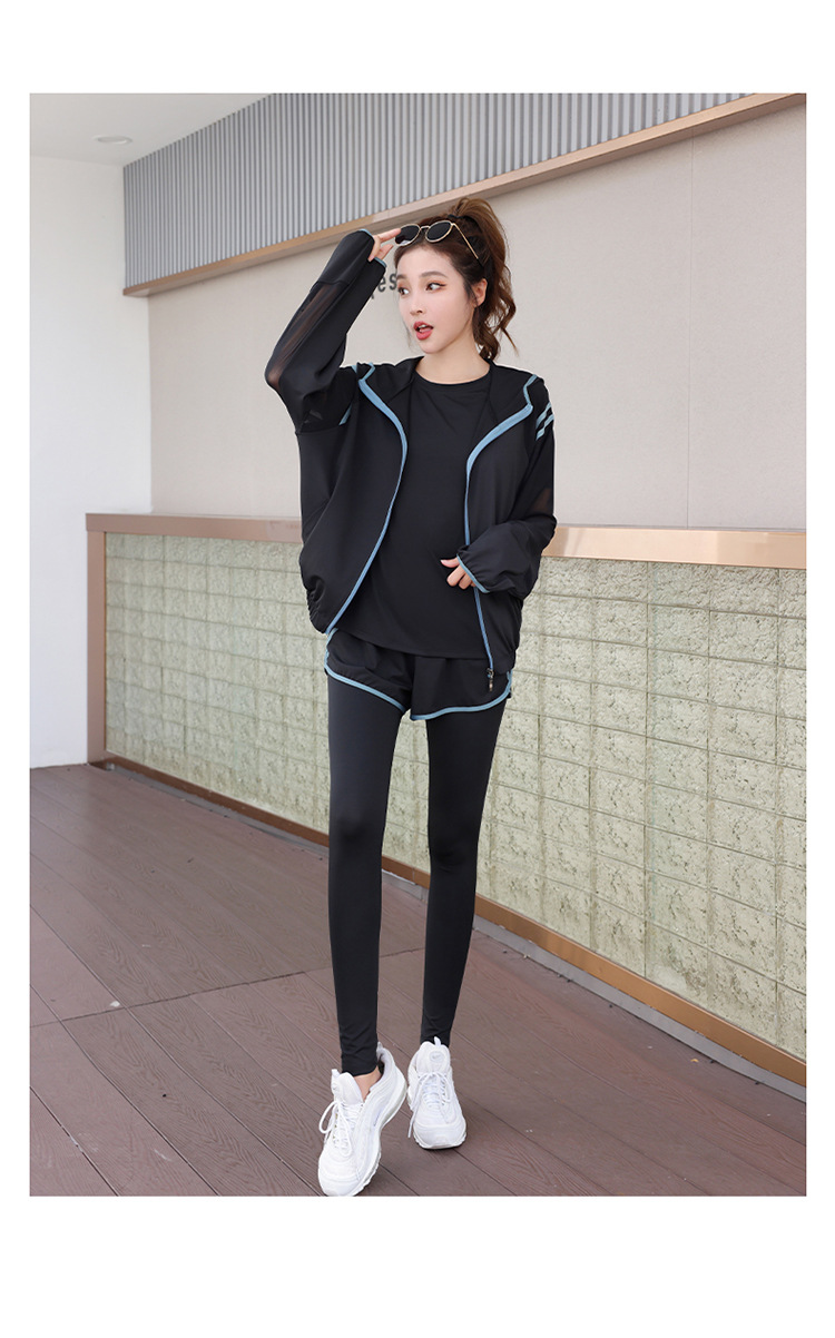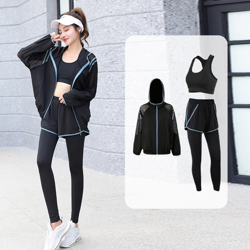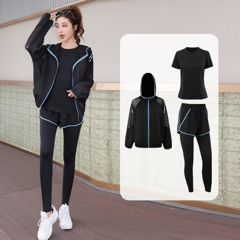 요가 의류 세트 2023 새로운 메쉬 스티치 가짜 투피스 바지와 휴대 전화 빠른 건조 달리기 운동복