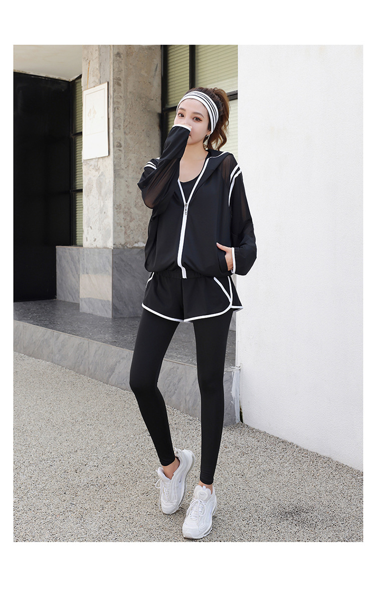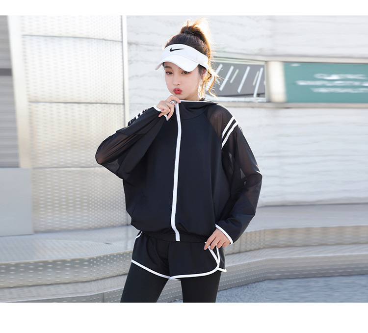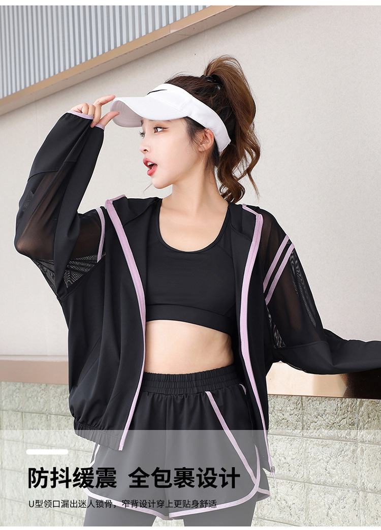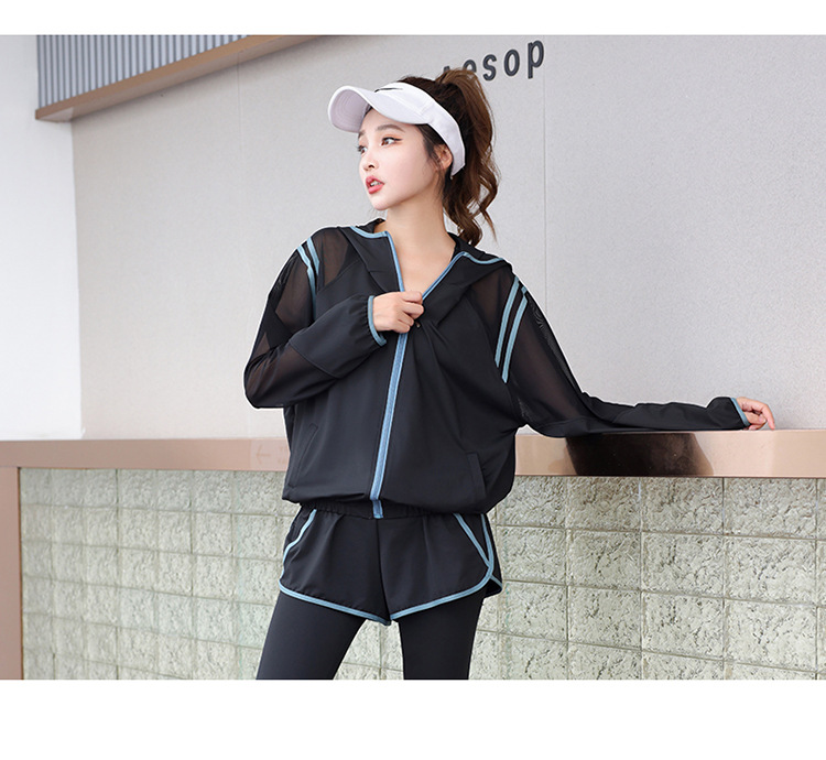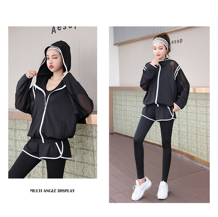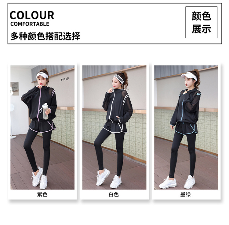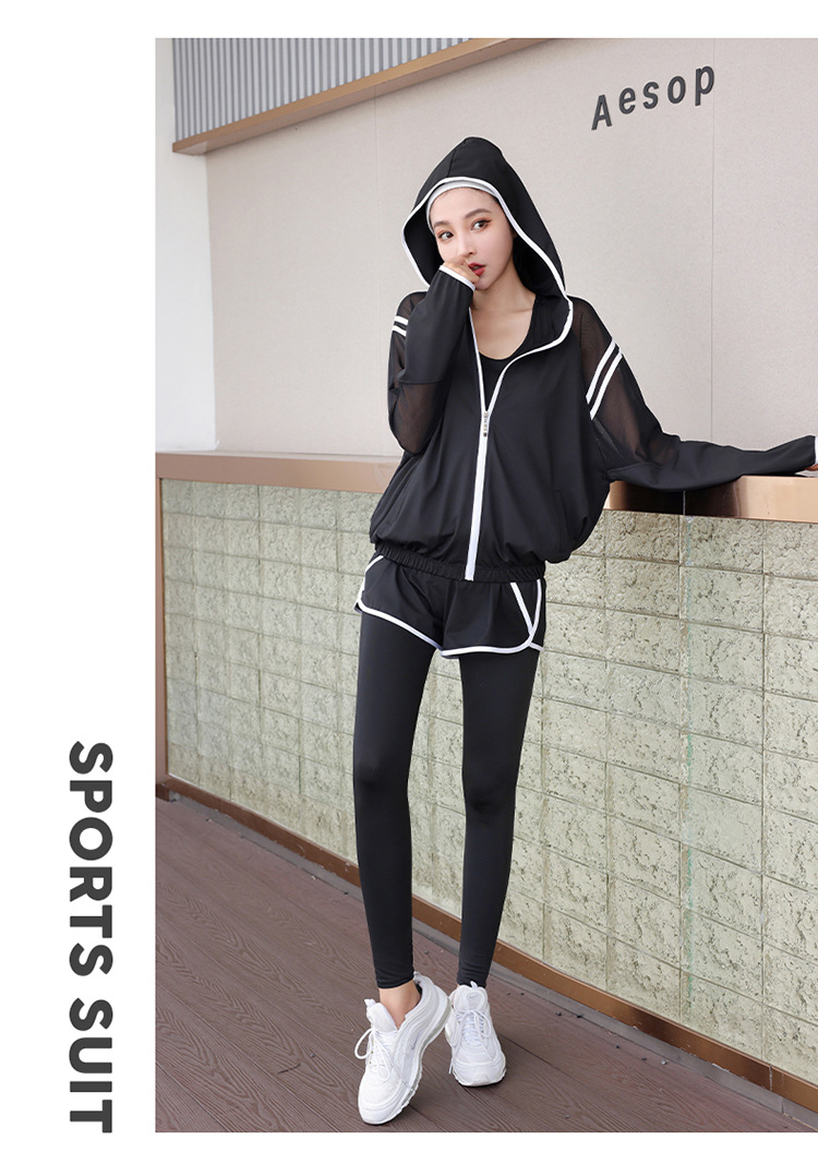 요가 의류 세트 2023 새로운 메쉬 스티치 가짜 투피스 바지와 휴대 전화 빠른 건조 달리기 운동복