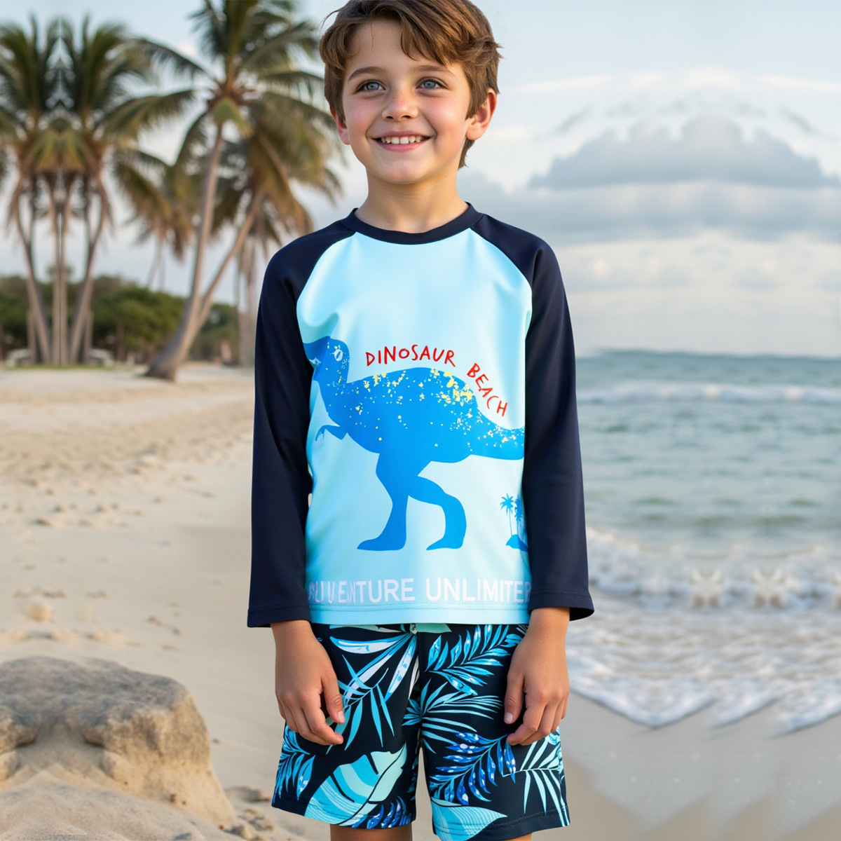 소년 공룡 수영복 반팔 반바지 스플릿 2025 새로운 아기 소년 태양 보호 여름 귀여운 양복 어린이 수영복