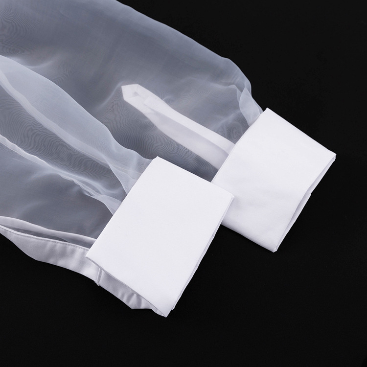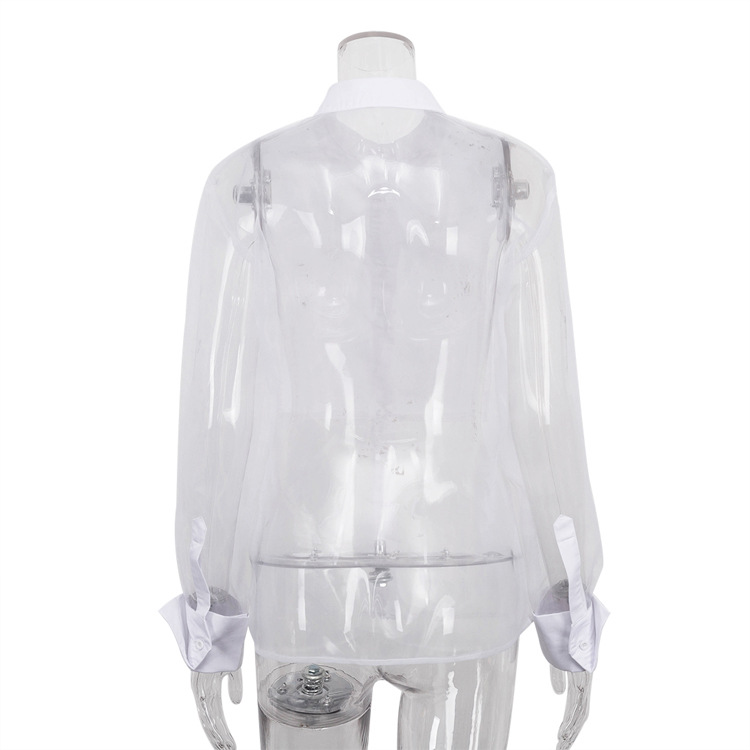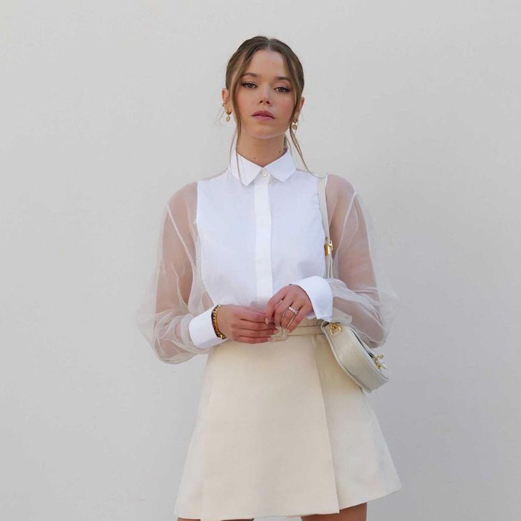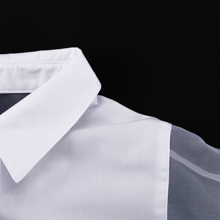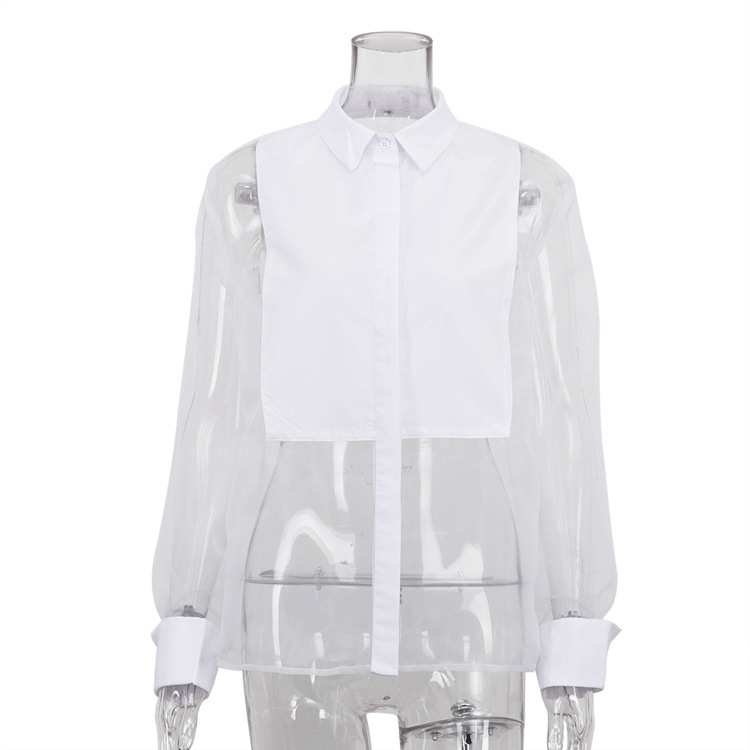 2026 봄/여름 패션 셔츠 여성용 긴팔 라펠 오간자 스플라이싱 셔츠 상의 투명 섹시 유럽 및 미국 여성 의류스토어 가기
