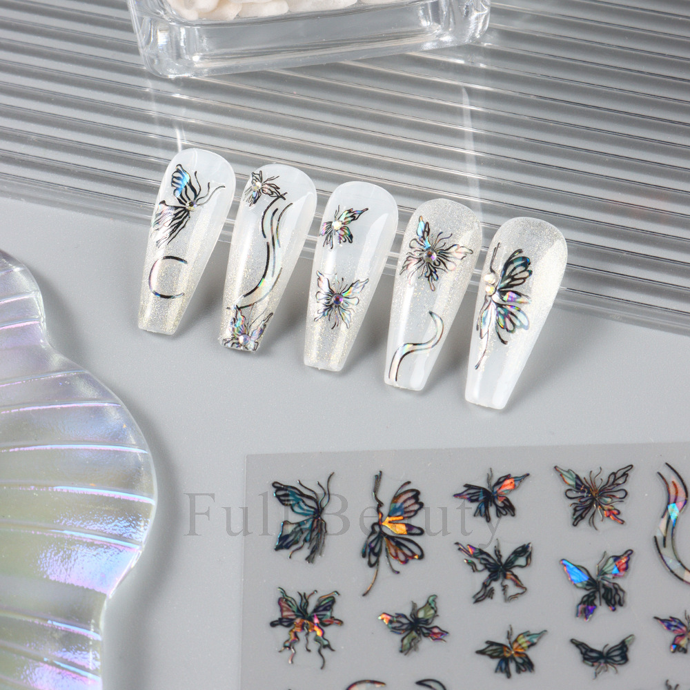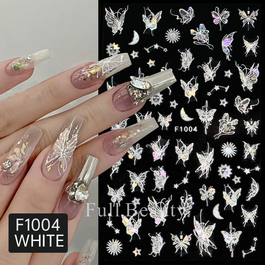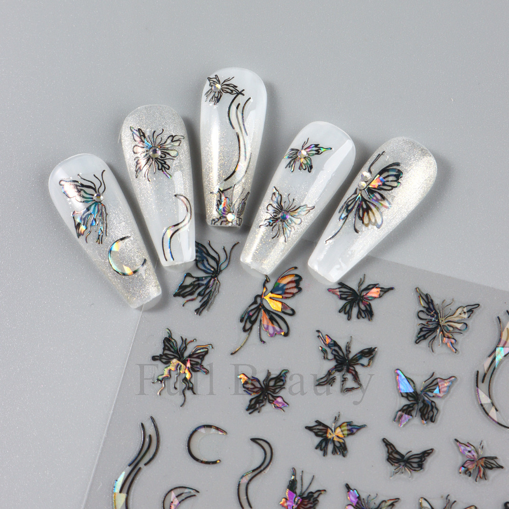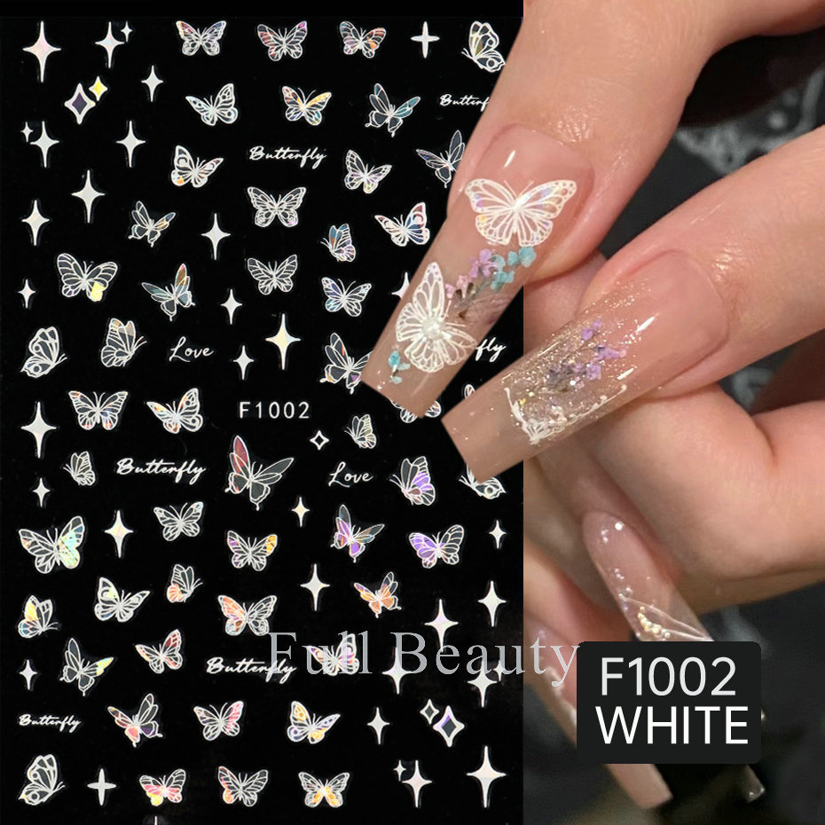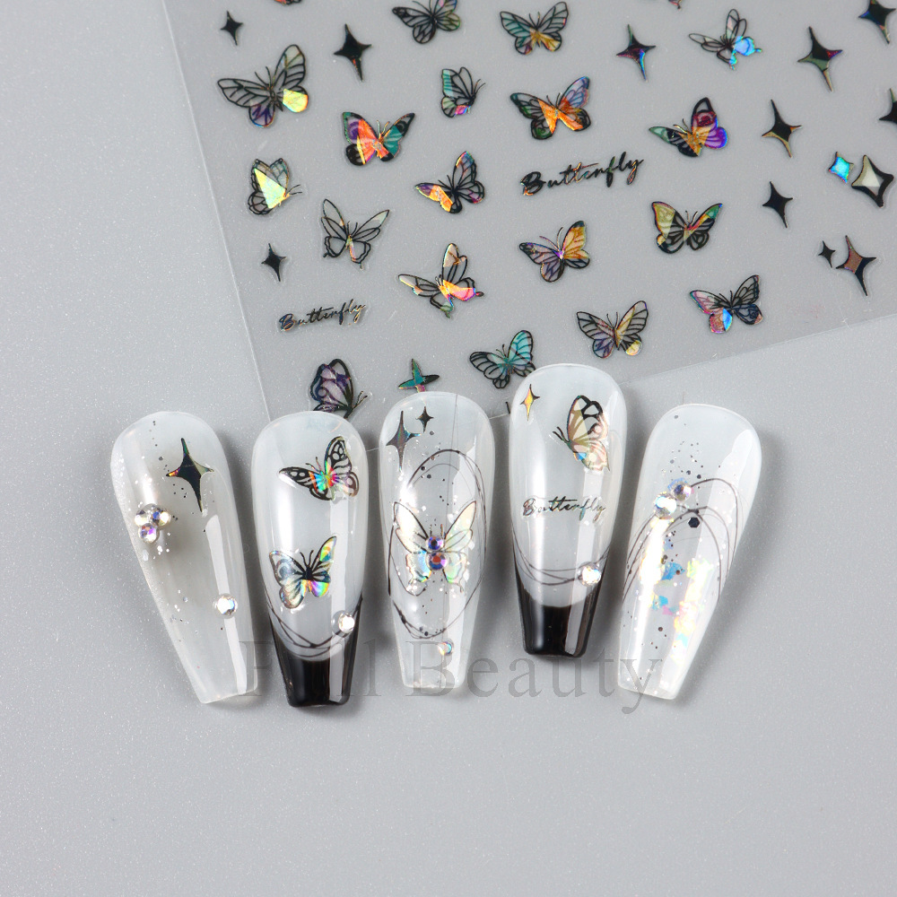 크로스 보더 새로운 레이저 컬러 나비 네일 스티커 3D 중공 흰색 나비 접착 네일 스티커 도매 손톱