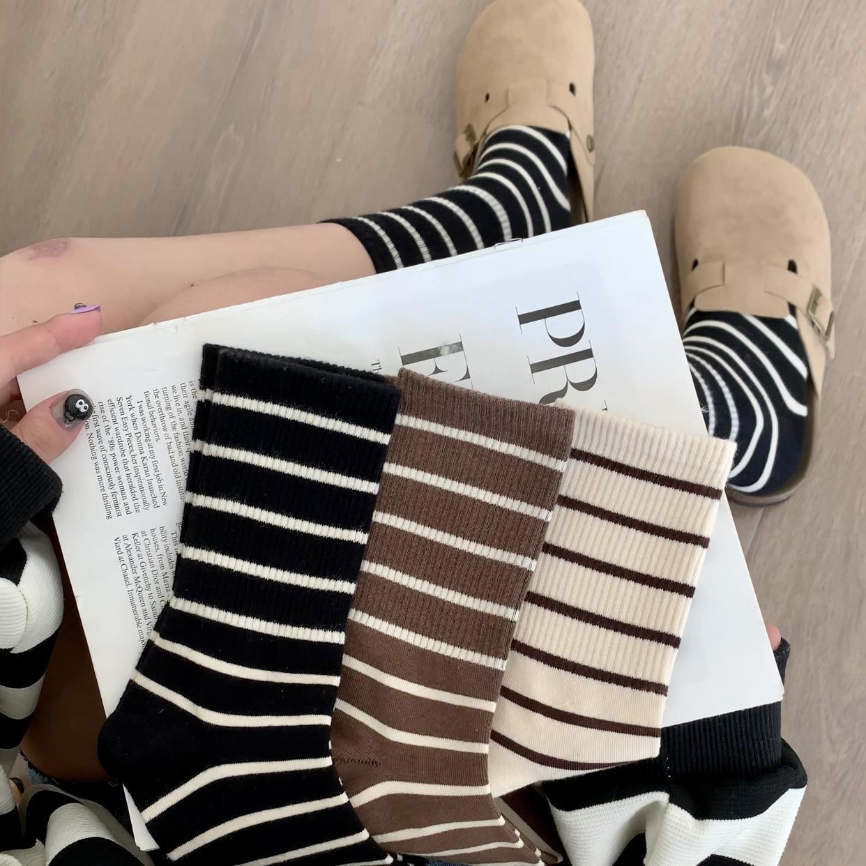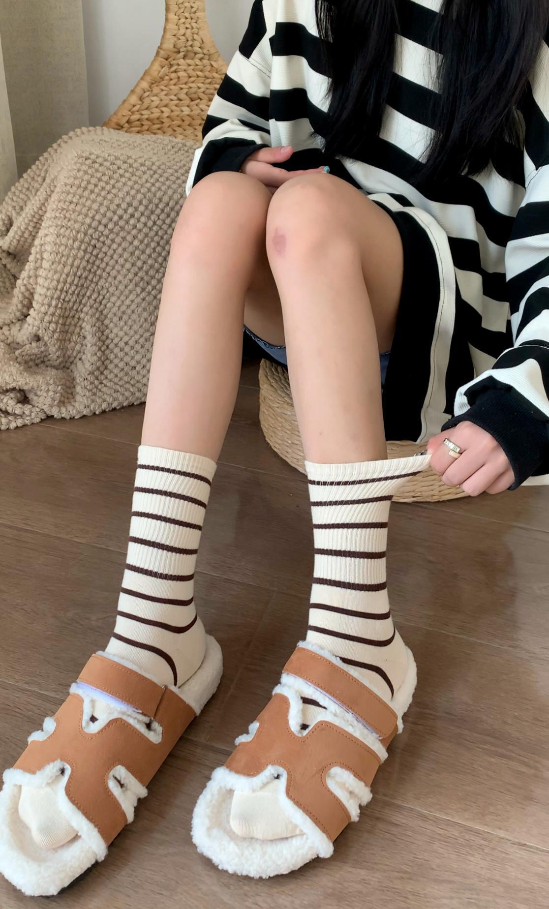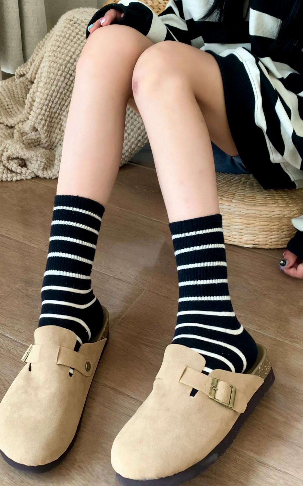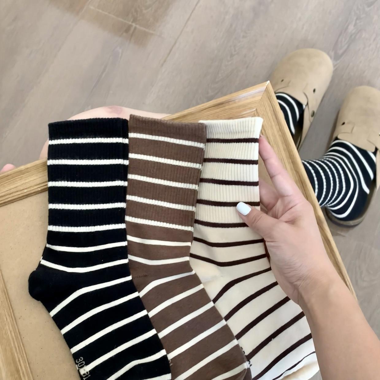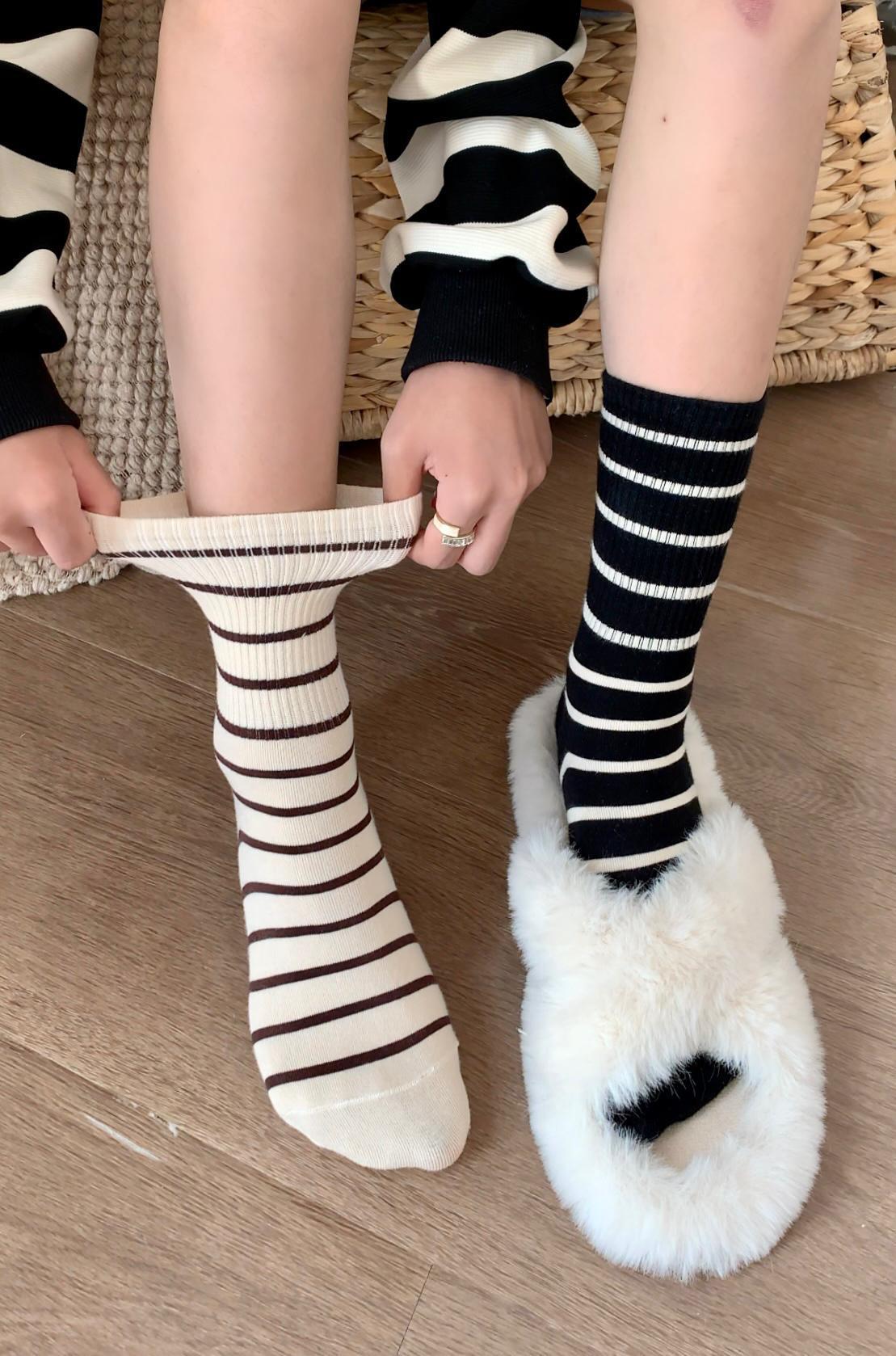 여성용 양말 스트라이프 심플 하이 스타킹 겉옷 중간 길이 인 트렌디 한 모든 매치 흑백 가을과 겨울 대학 스타일 여성 양말스토어 가기