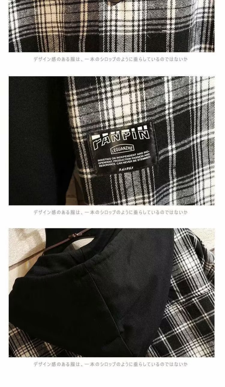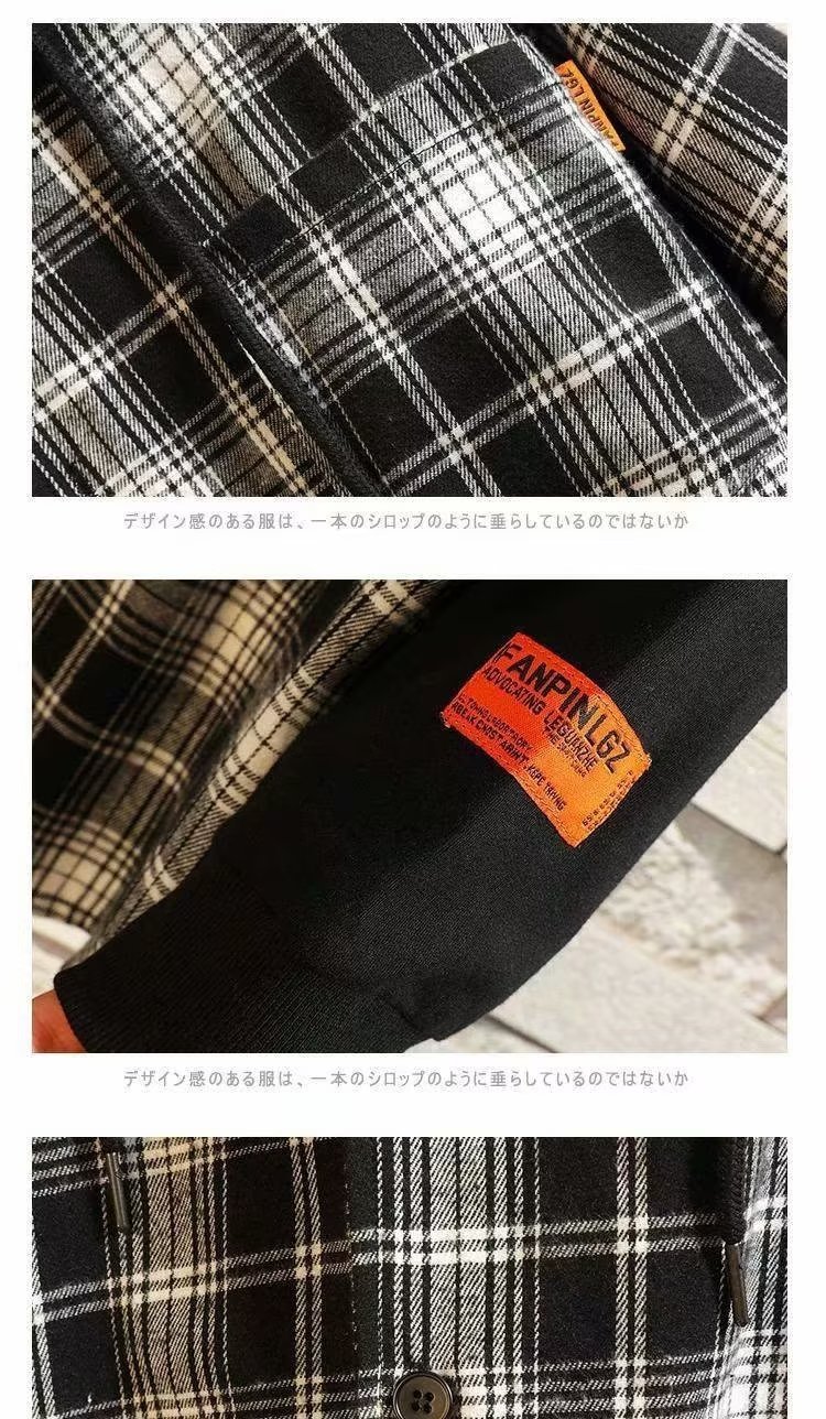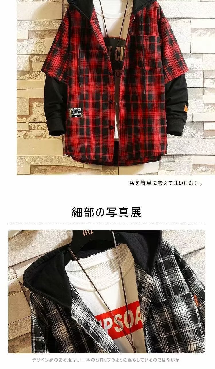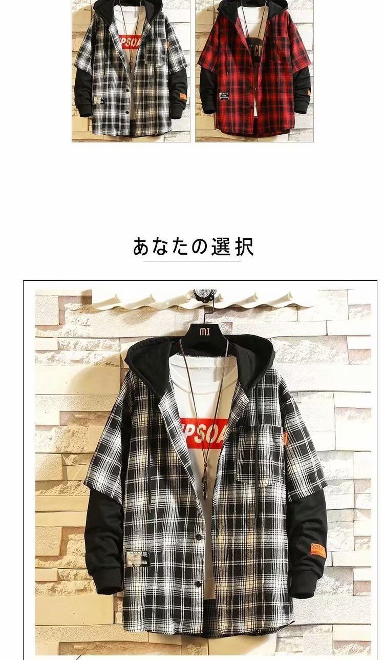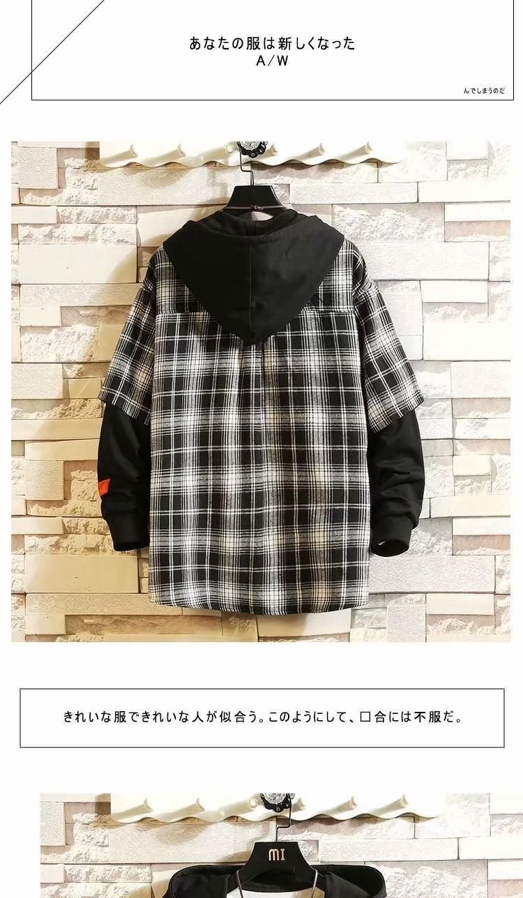 스티칭 격자 무늬 셔츠 남성 후드 가짜 투피스 가을 먼지 투섬 재킷 한국식 홍콩 스타일 일본식 긴팔 셔츠스토어 가기