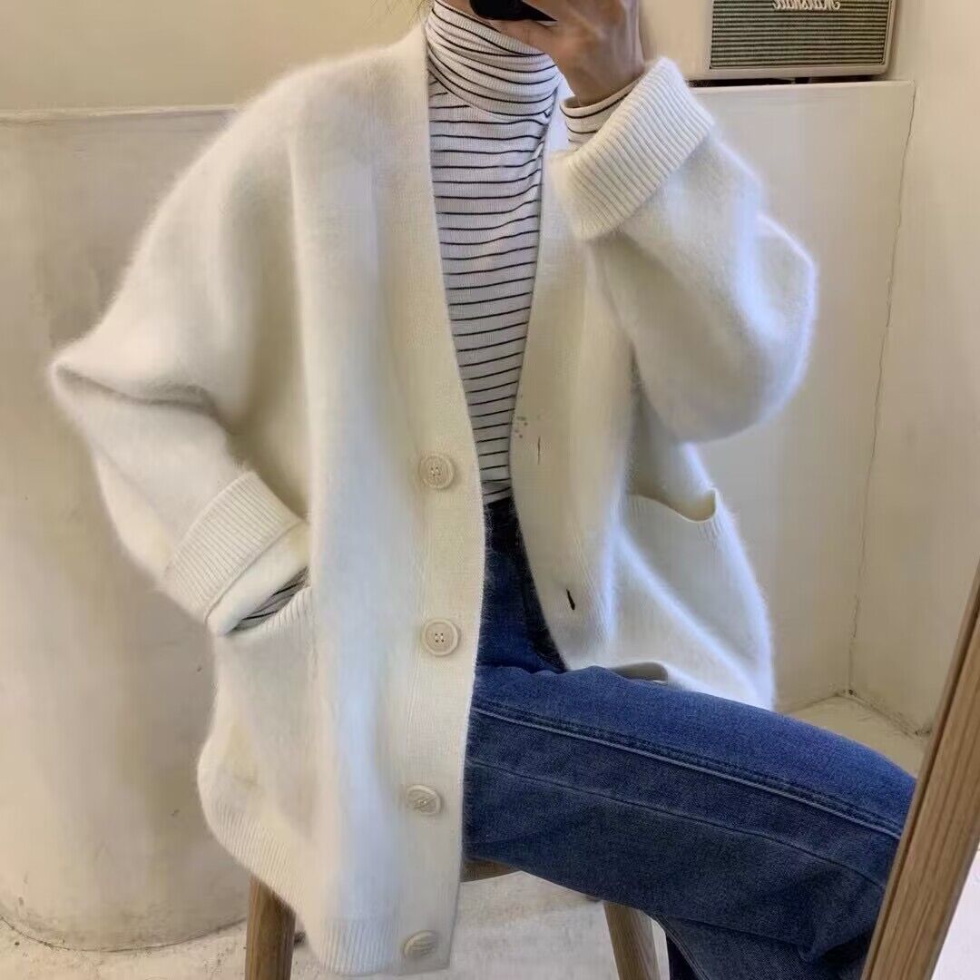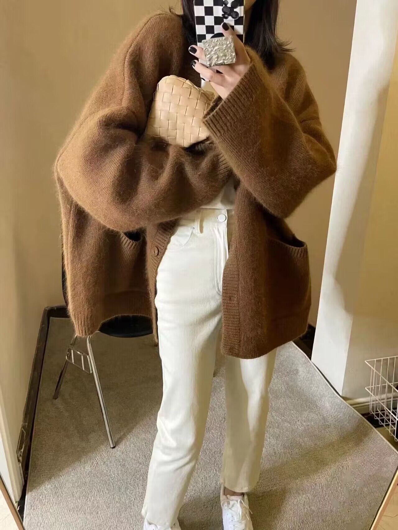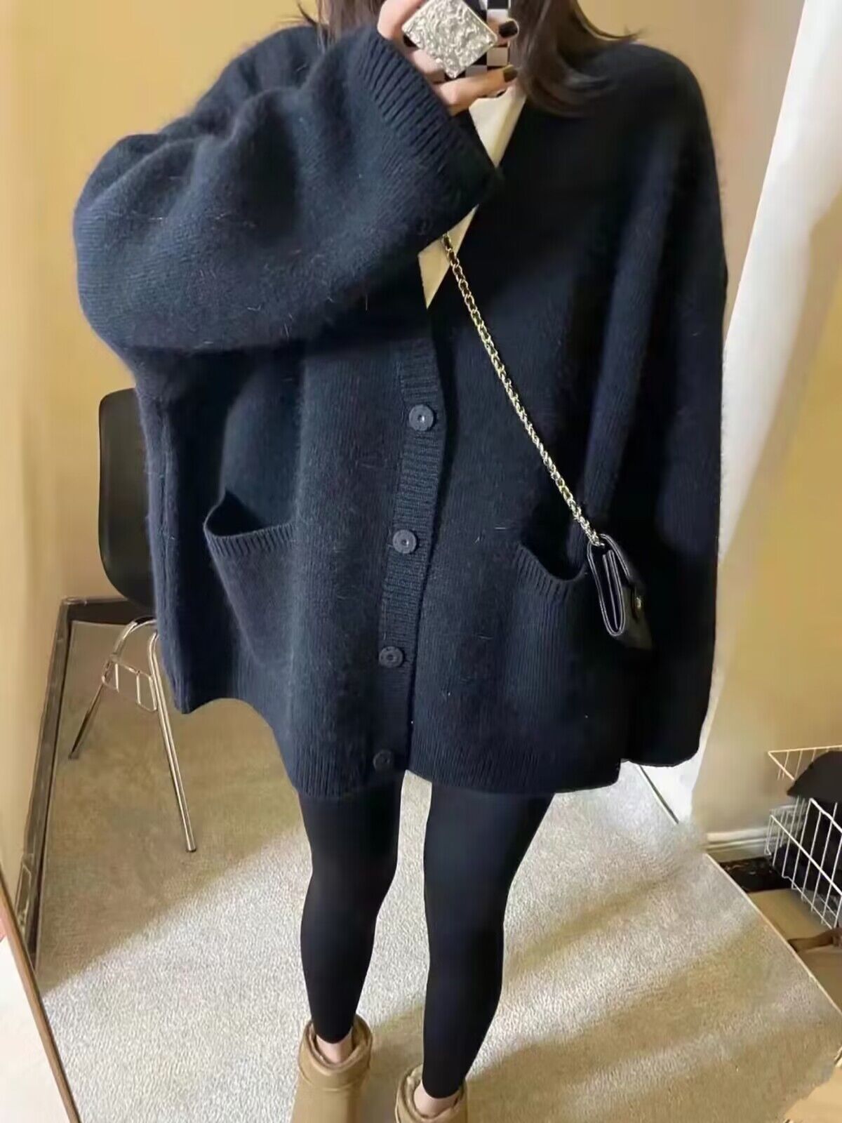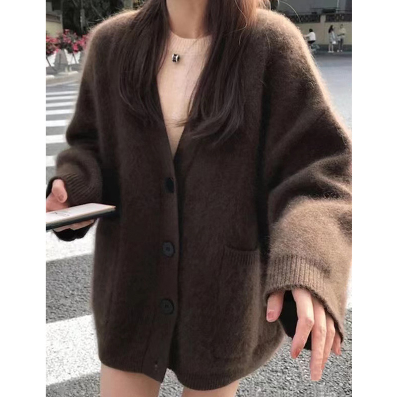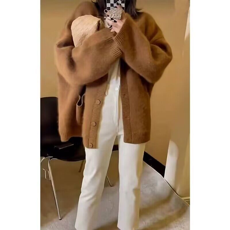 무거운 게으른 스타일 울 스웨터 여성용 카디건 V-Neck 중간 길이의 캐시미어 느슨한 프로필 스웨터 코트 니트스토어 가기