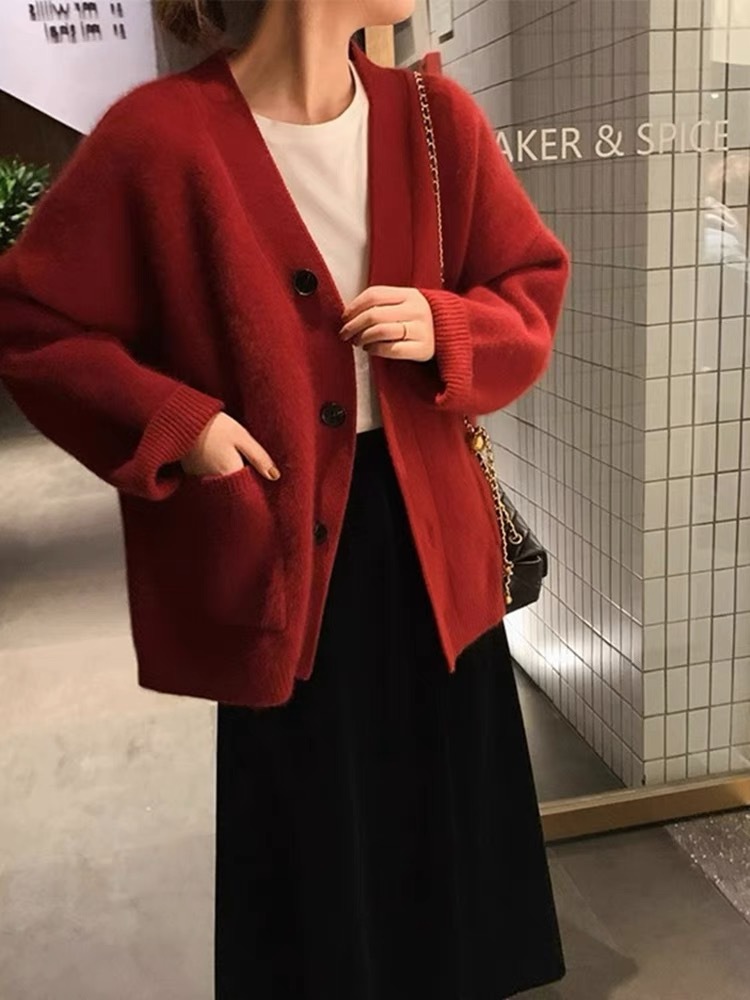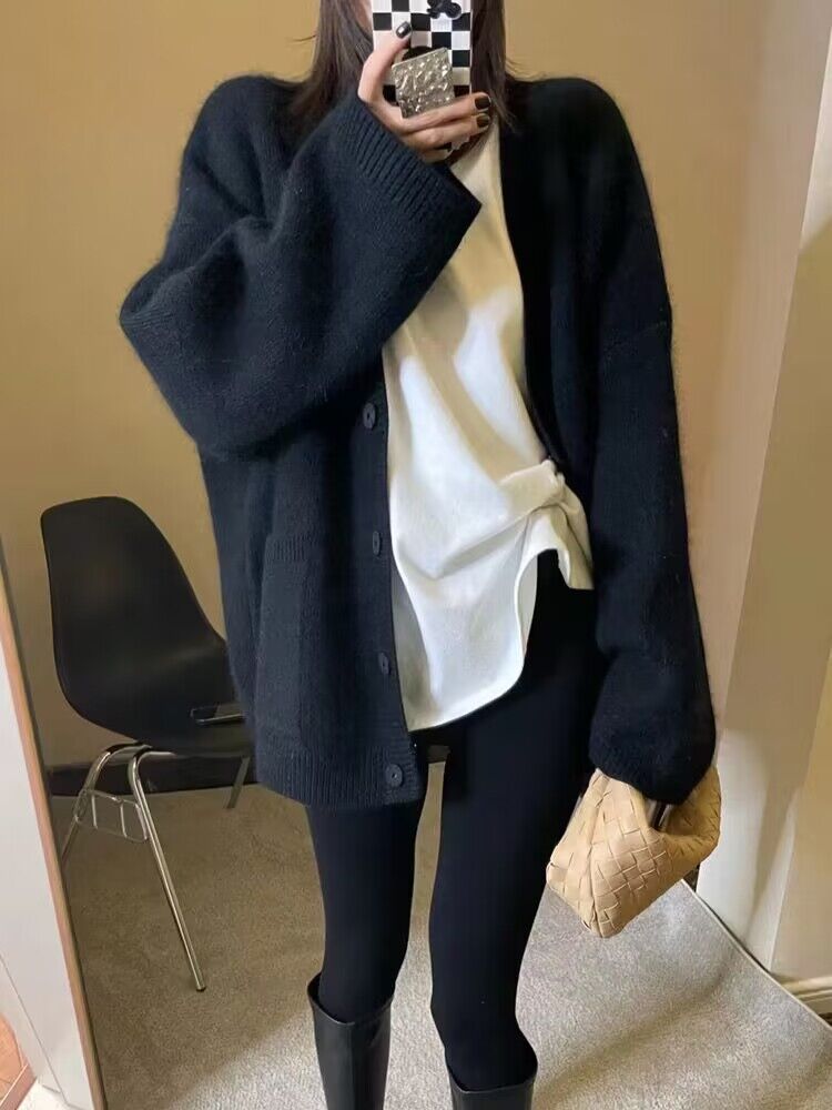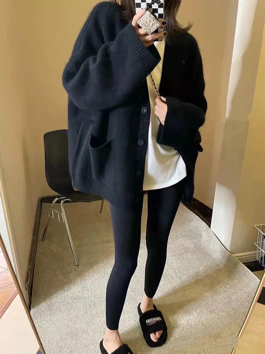 무거운 게으른 스타일 울 스웨터 여성용 카디건 V-Neck 중간 길이의 캐시미어 느슨한 프로필 스웨터 코트 니트