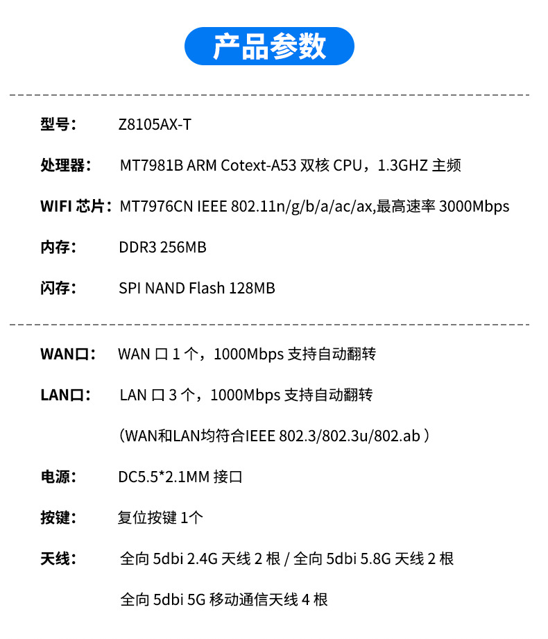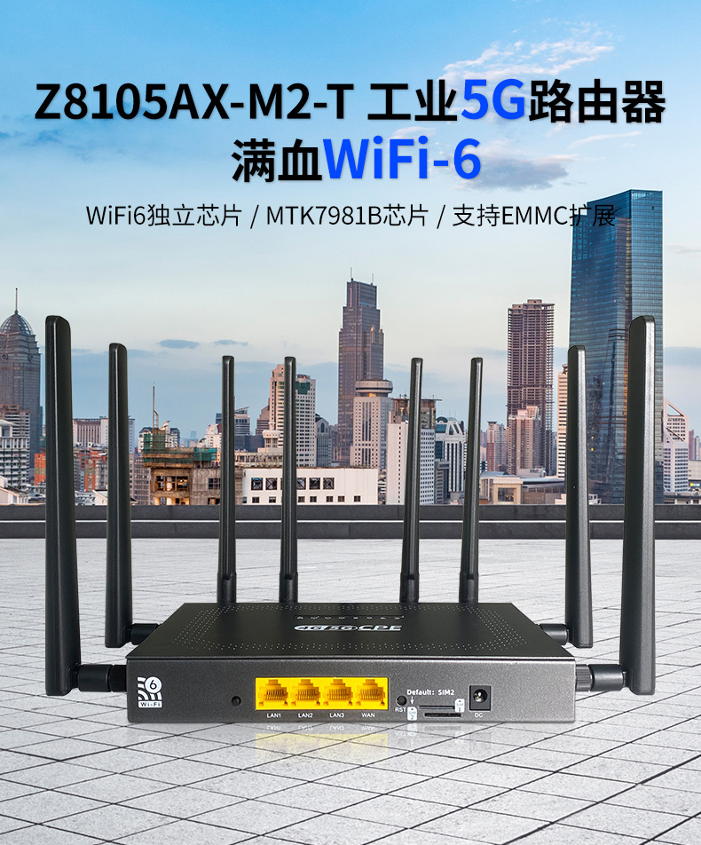 Z8105AX-M2-T是一款5g插卡路由器,采用MT7981B方案,独立wifi6芯片,速率高达3000mbps,1WAN+3LAN,均支持10/100/1000自适应,支持自动翻转,内置高增益wifi天线与5G移动通信,支持SIM/USIM卡。
