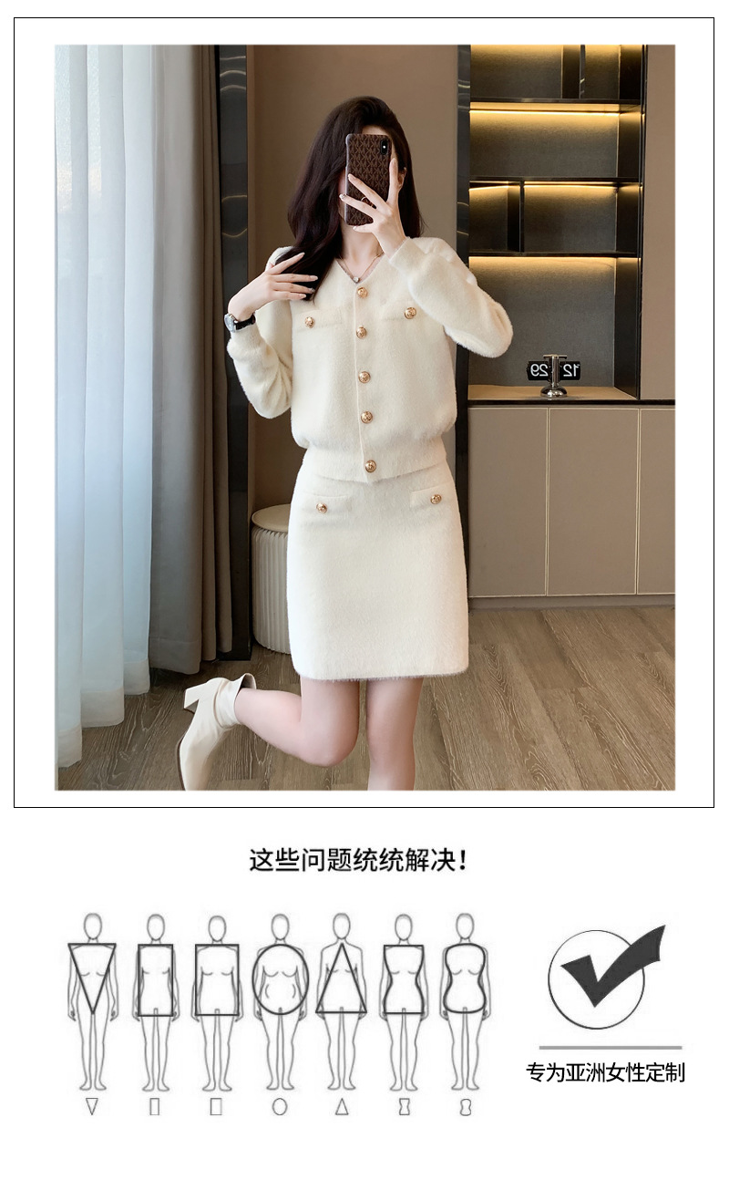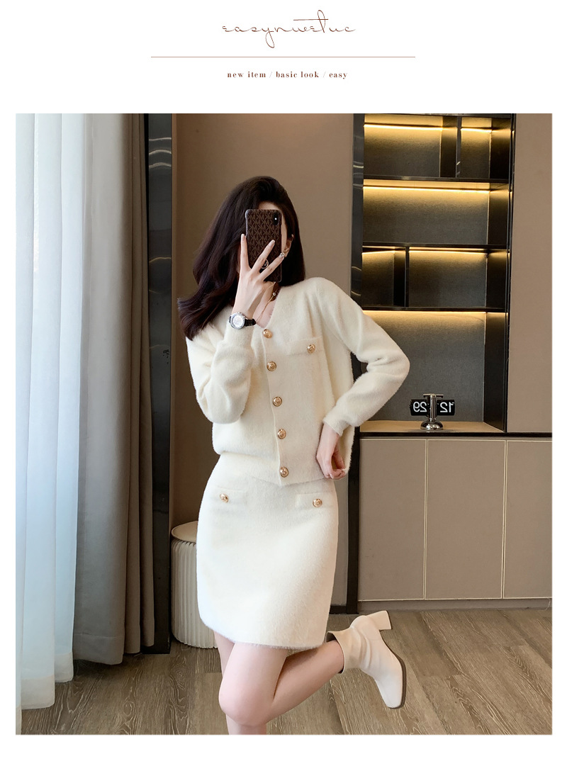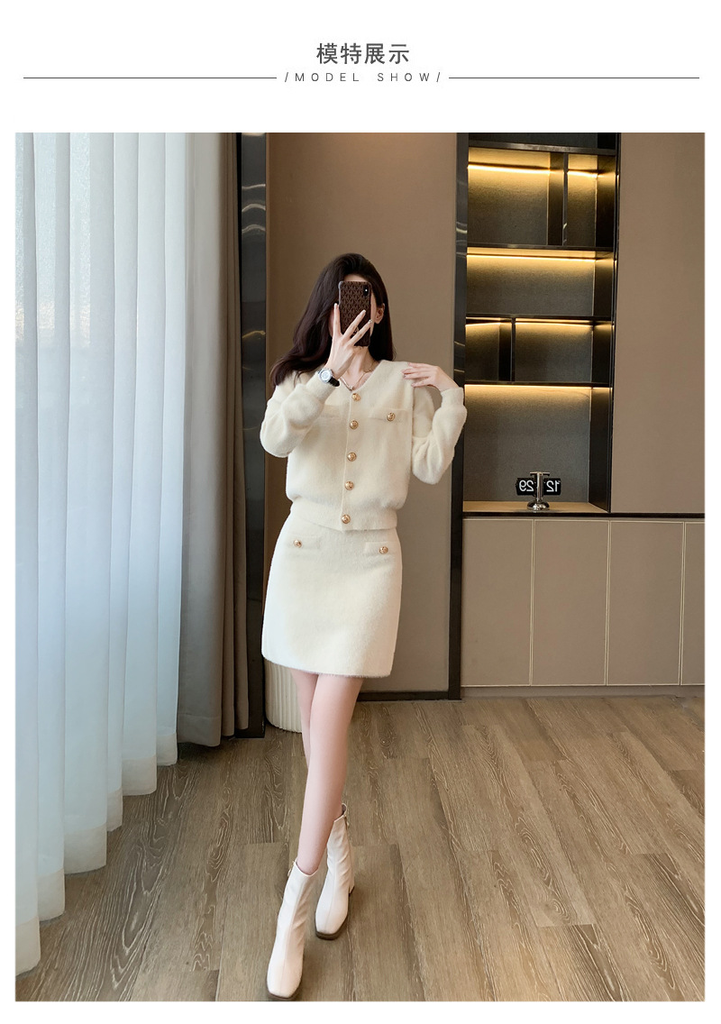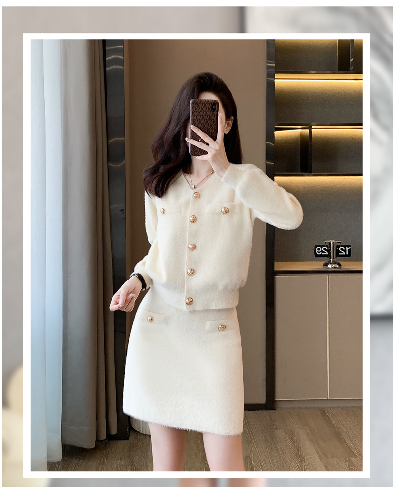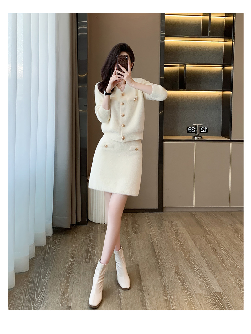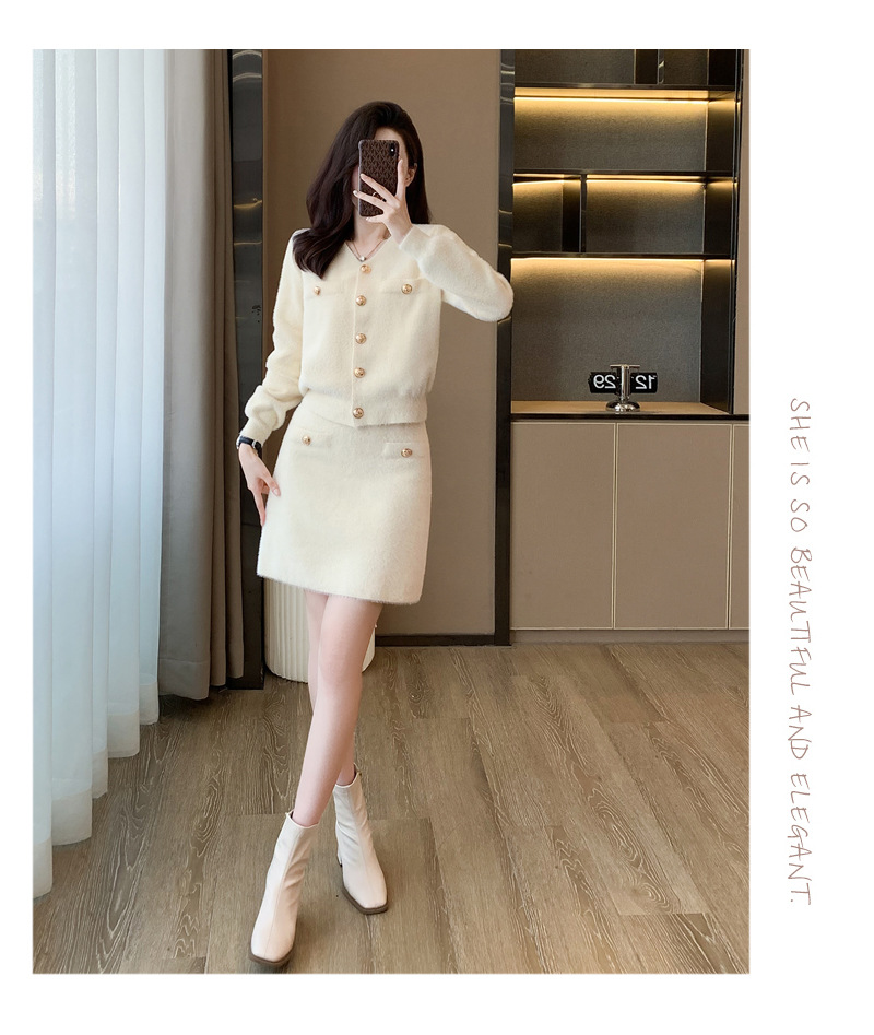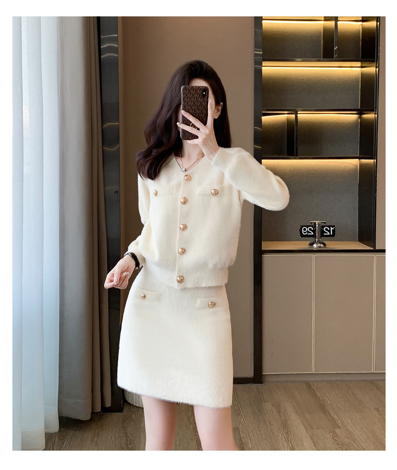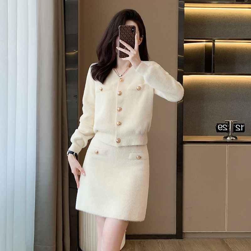 가을과 겨울 새로운 스타일 샤넬 스타일 유행 우아한 단색 모조 밍크 벨벳 세련된 버튼 스웨터 여성을위한 니트 투피스 원피스스토어 가기