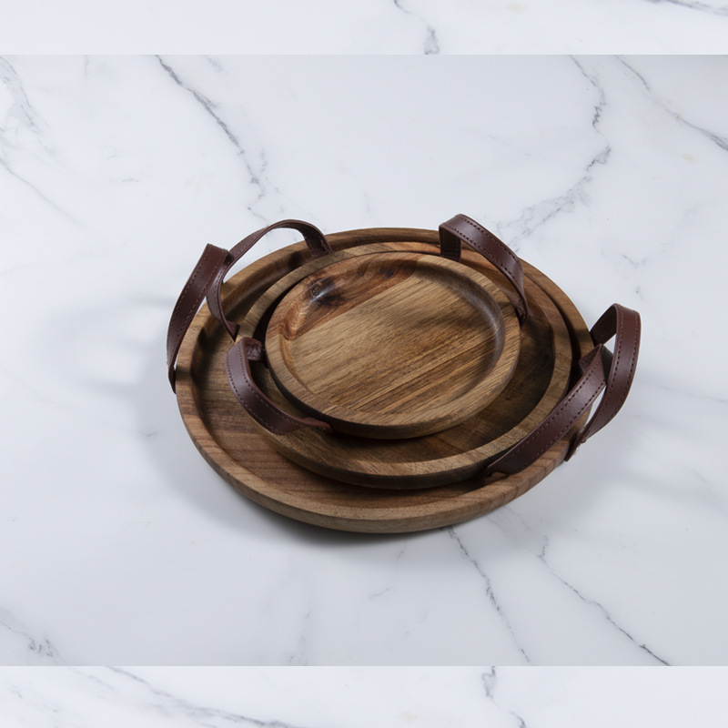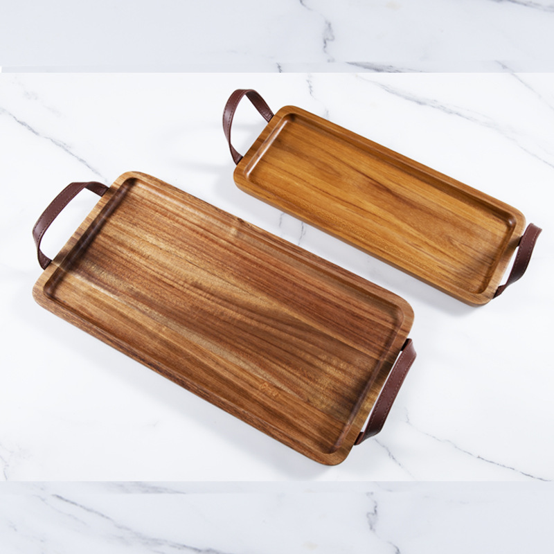 • 가죽 로프가있는 대형 직사각형 나무 트레이