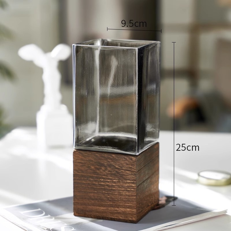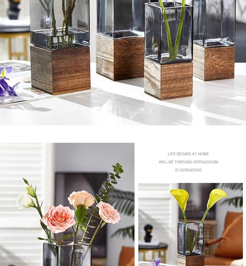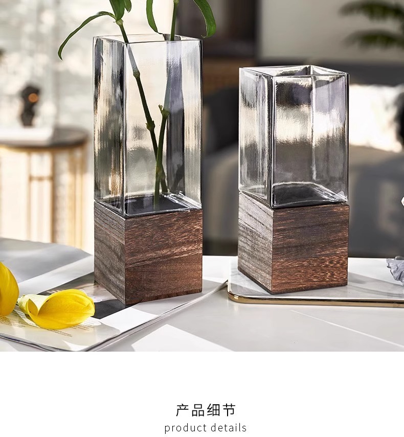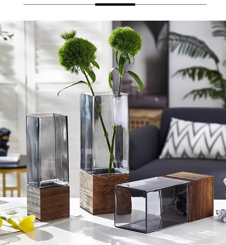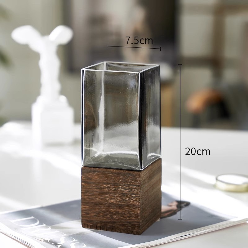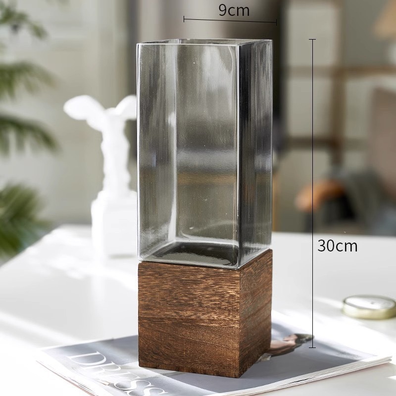 현대 간단한 사각형 나무 브래킷 투명 유리 고급 감각 꽃병 홈 수경 고품질 장식품 스타일