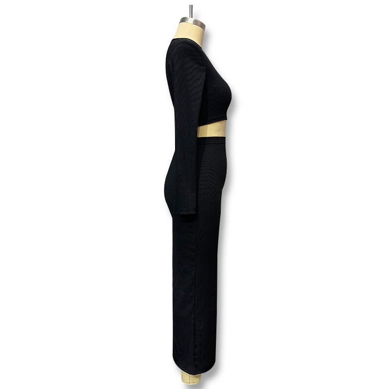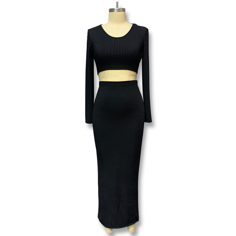2023 가을과 겨울 새로운 유럽과 미국 크로스 보더 여성용 단색 니트 크루넥 탑 롱 슬리브 스플릿 롱 스커트 여성용 투피스 세트