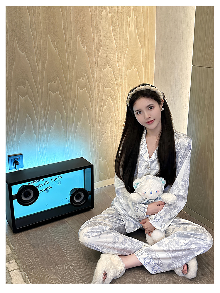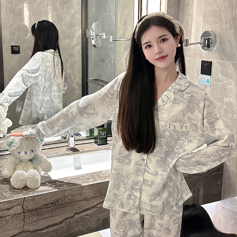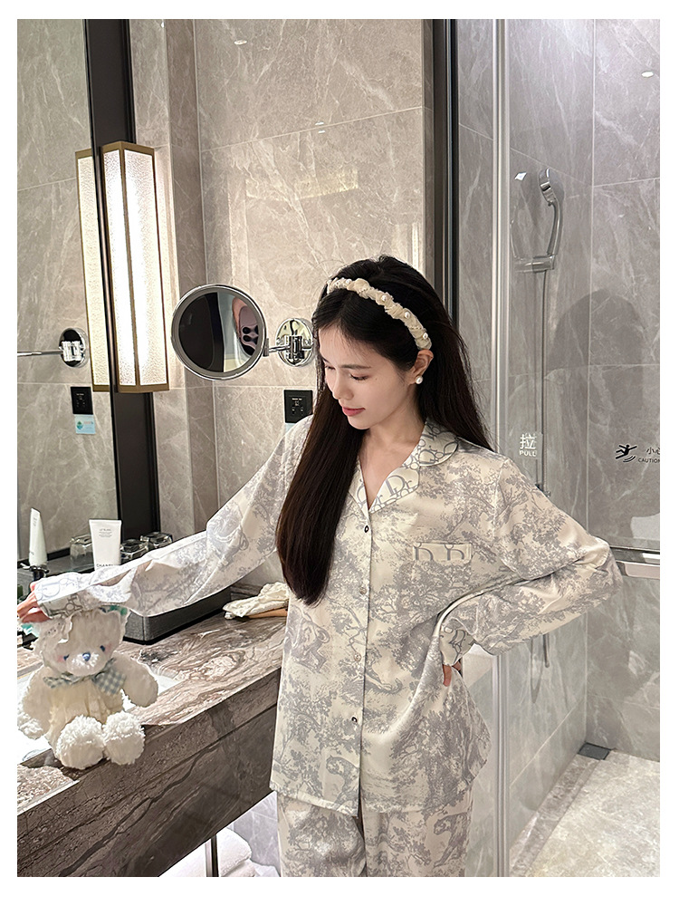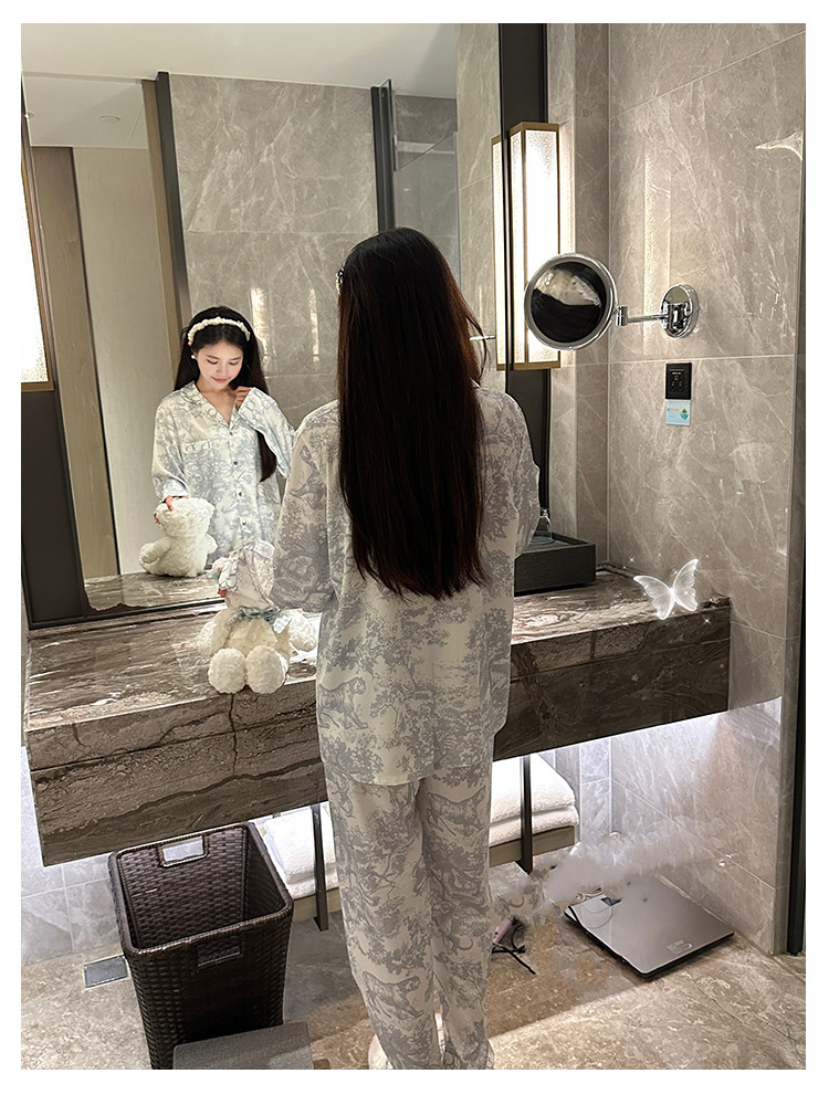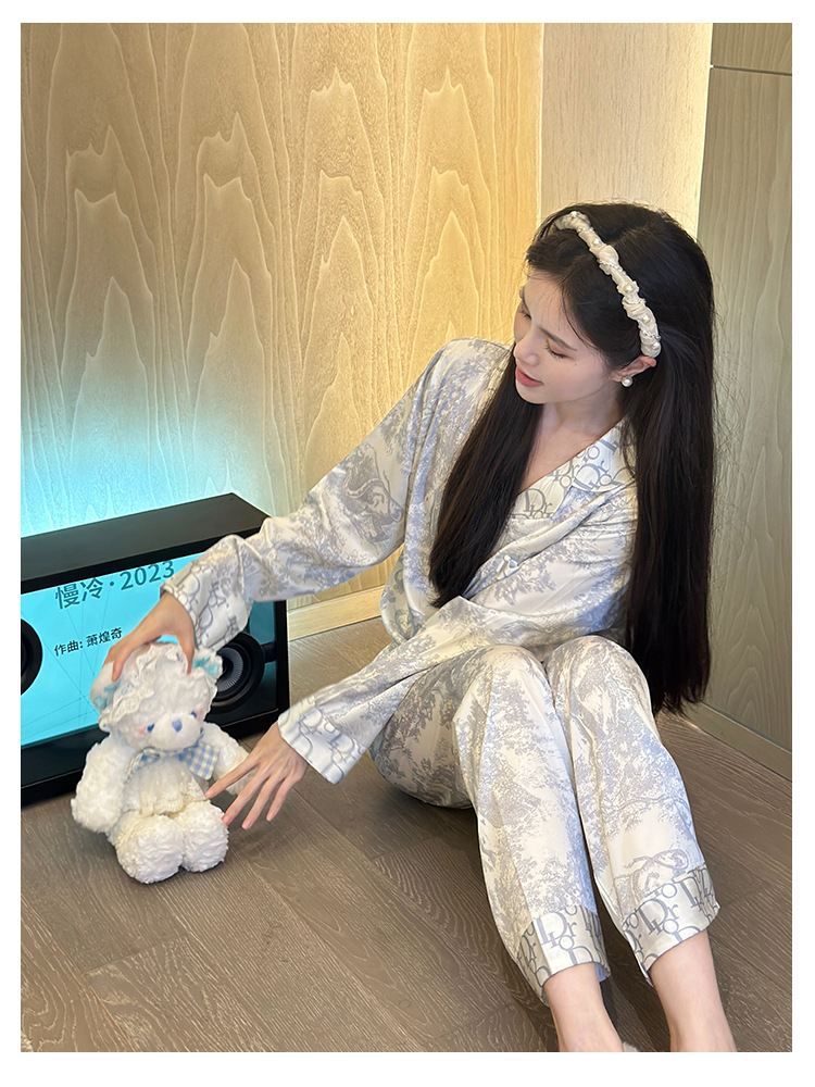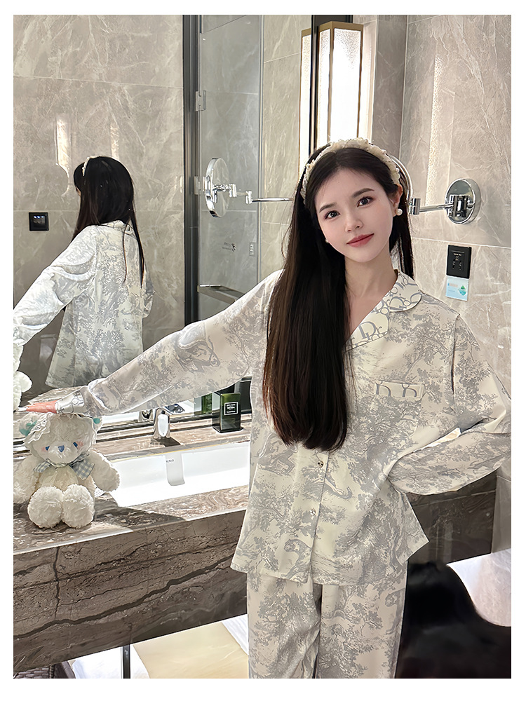 [D 가족의 추억] 2023 새로운 인쇄 아이스 실크 잠옷 여성 세트 느슨한 얇은 하이 엔드 센스 홈 옷스토어 가기