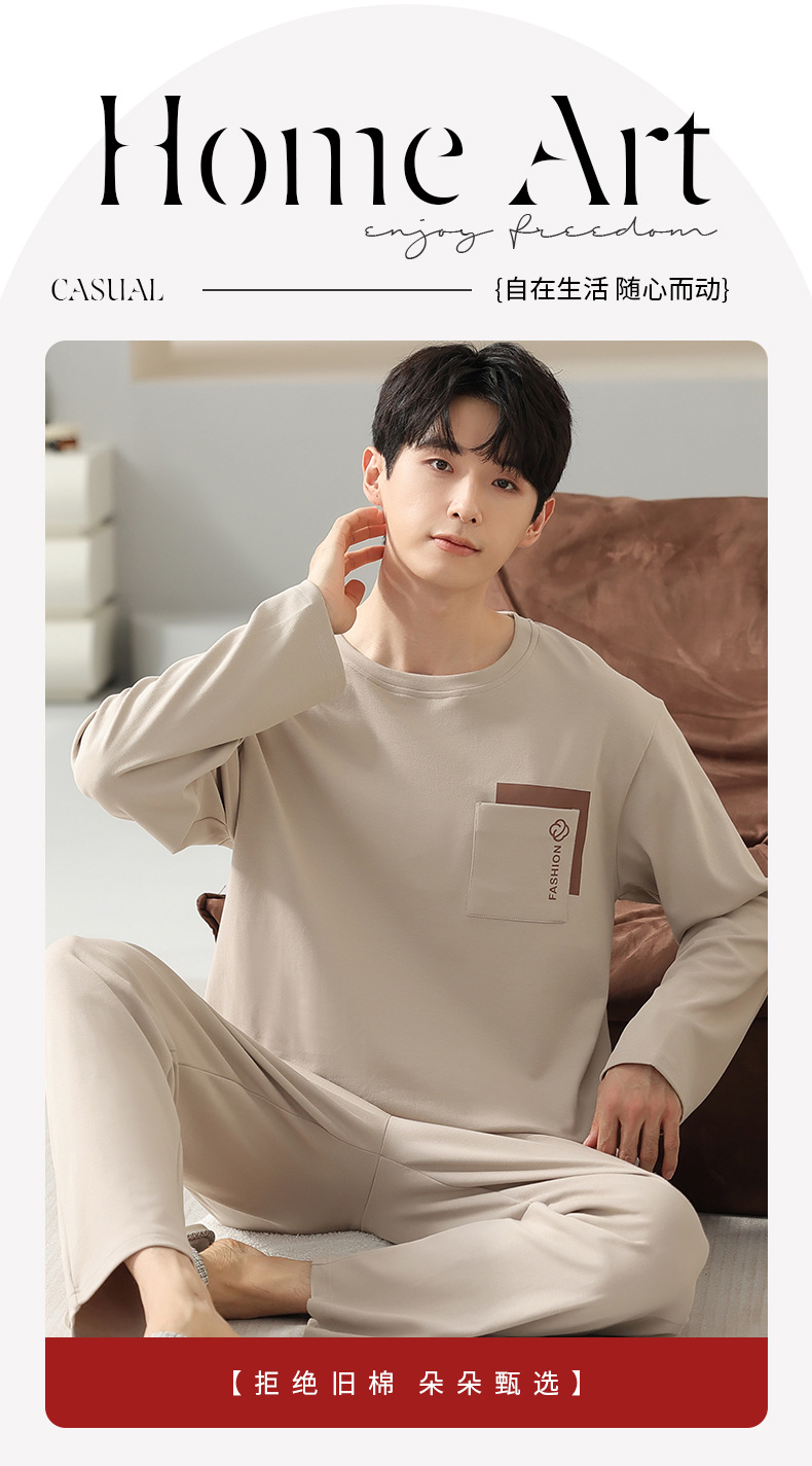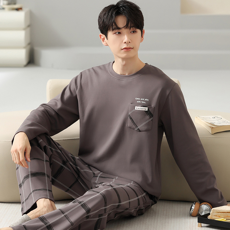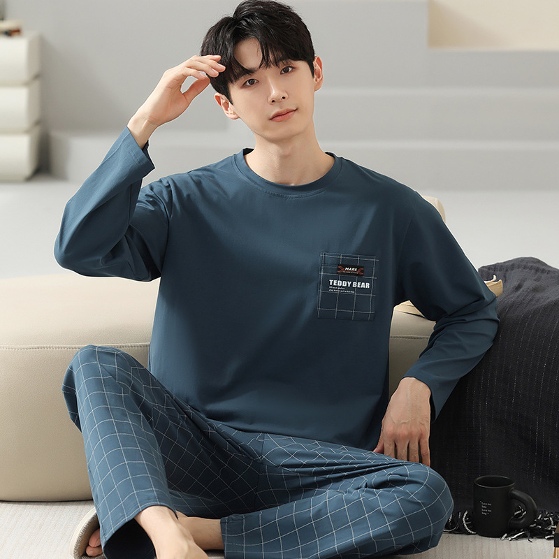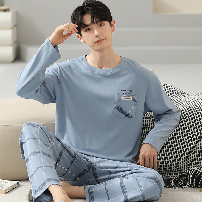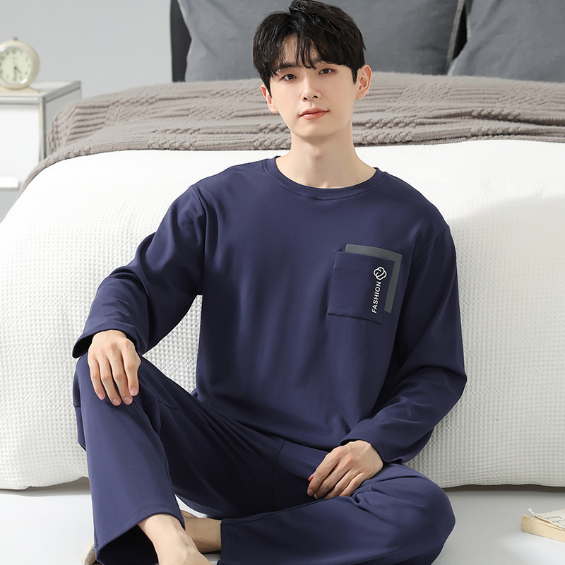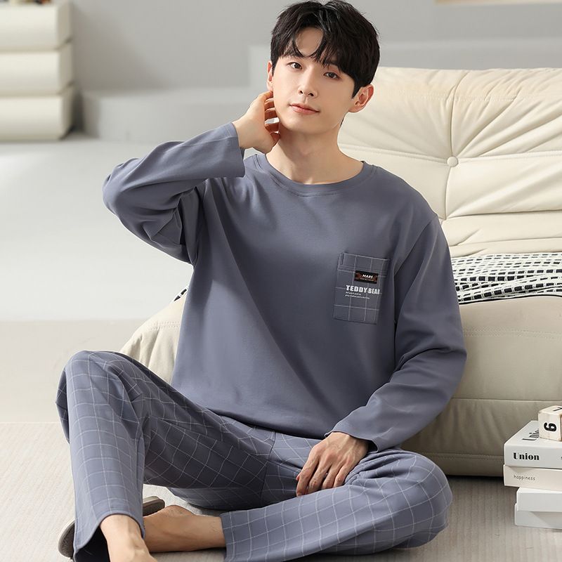 봄 코튼 남성 잠옷 가을, 겨울 새로운 대형 라운드 넥 긴팔 바지 겉옷 순수 코튼 홈웨어 세트스토어 가기