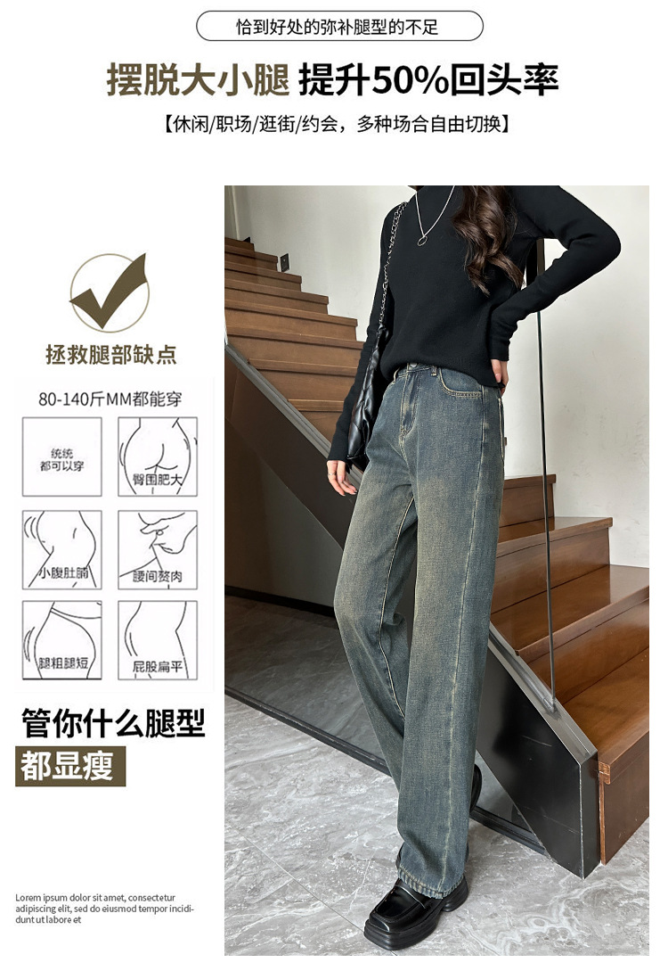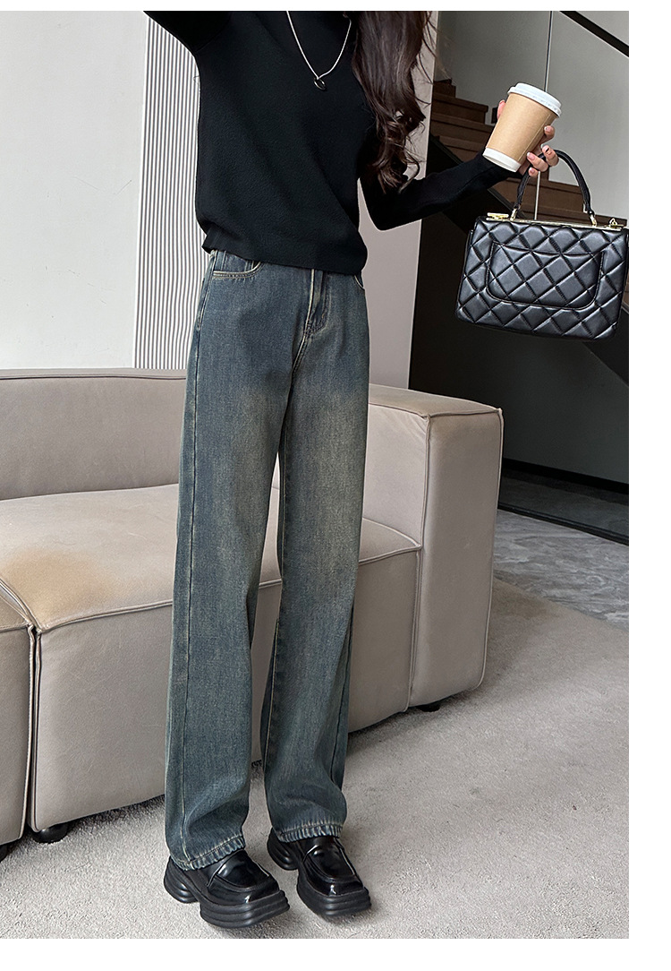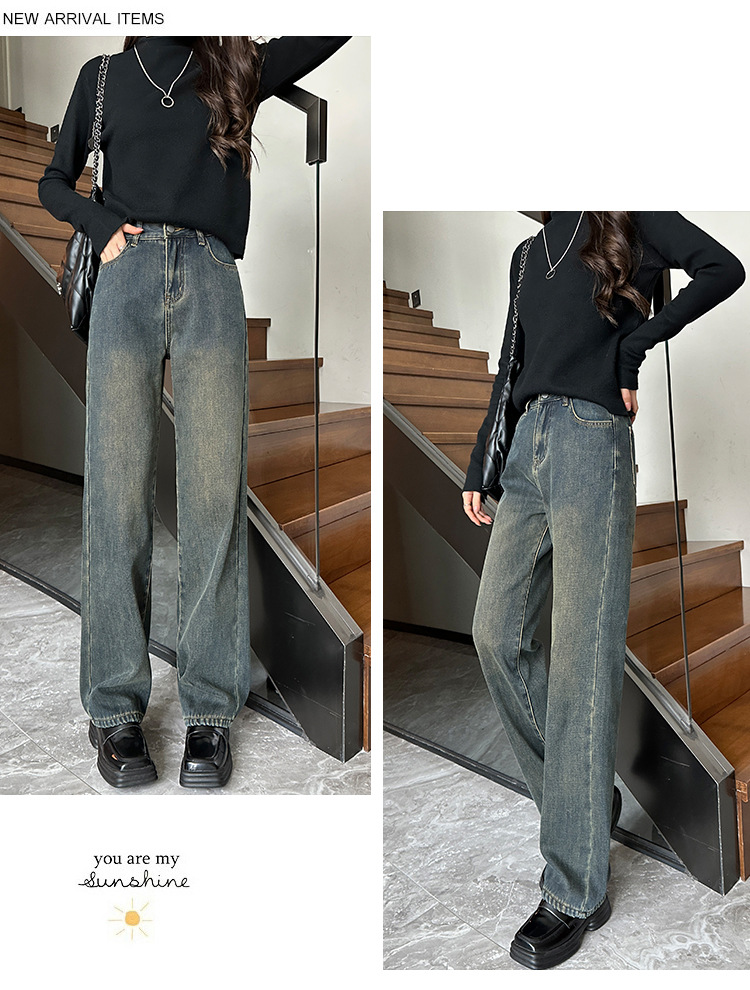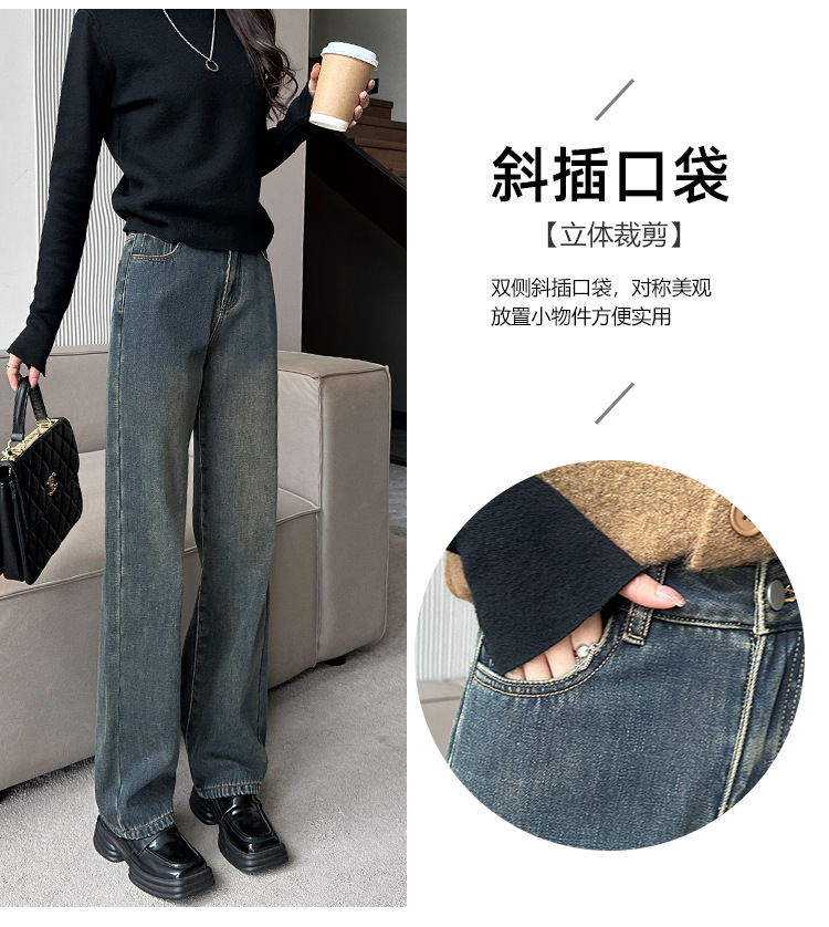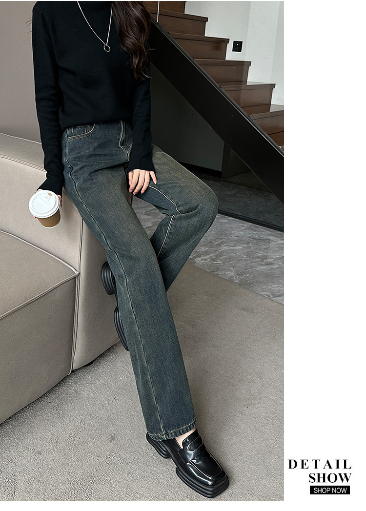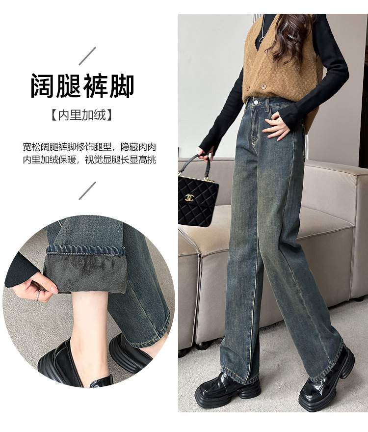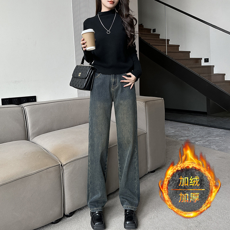 리얼 샷 가을과 겨울 기모 청바지 여자의 2023 작은 높은 허리 슬리밍 스트레이트 다리 넓은 다리 바닥 바지스토어 가기
