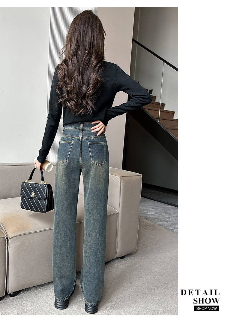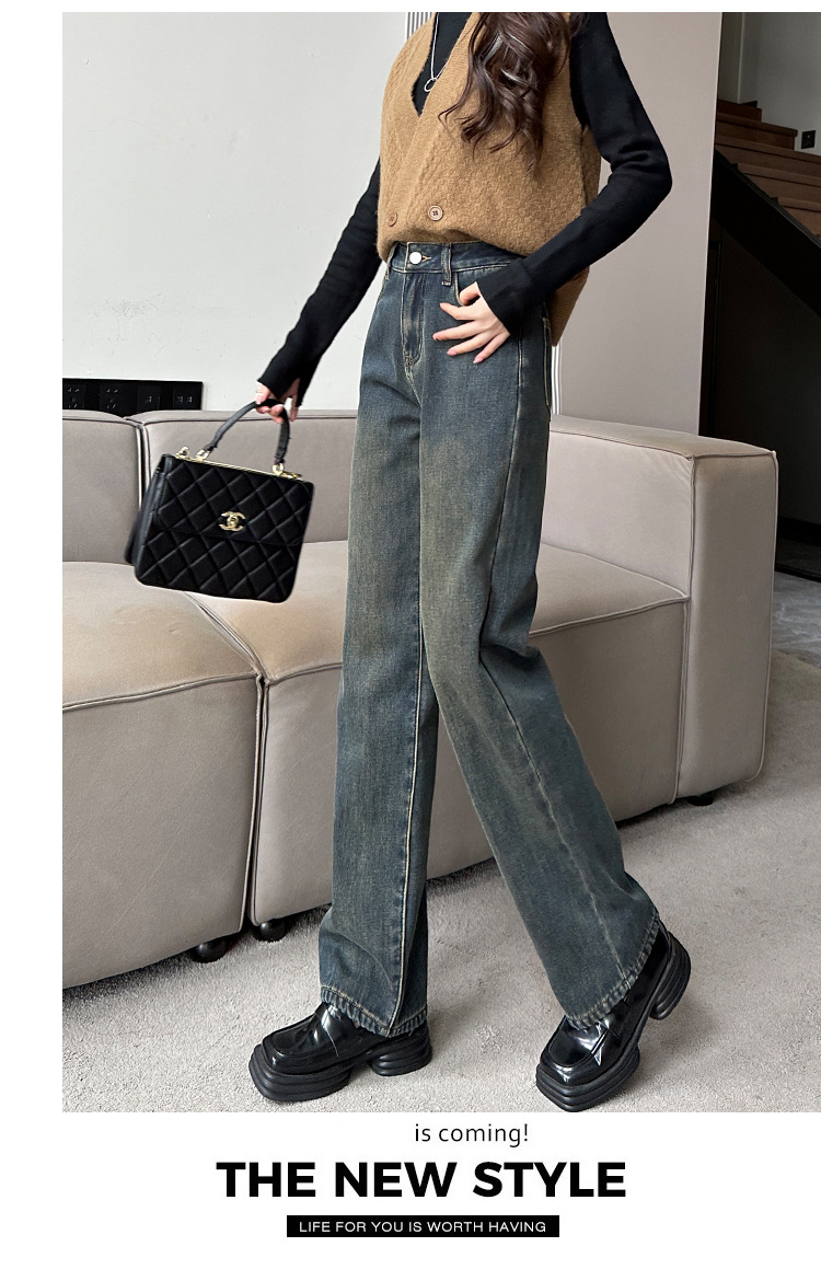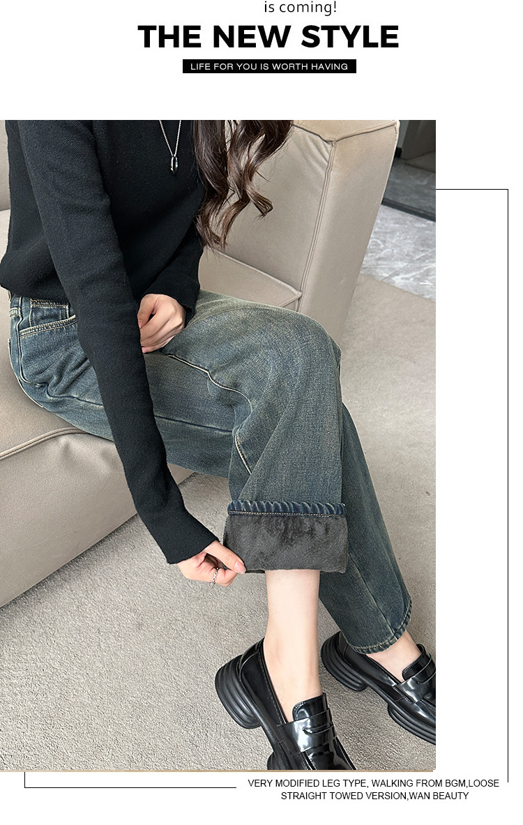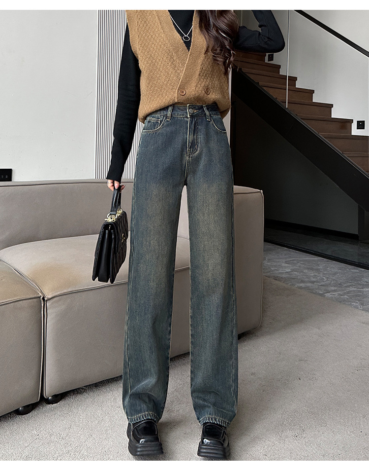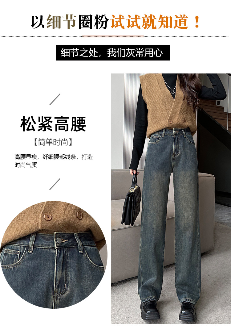 리얼 샷 가을과 겨울 기모 청바지 여자의 2023 작은 높은 허리 슬리밍 스트레이트 다리 넓은 다리 바닥 바지