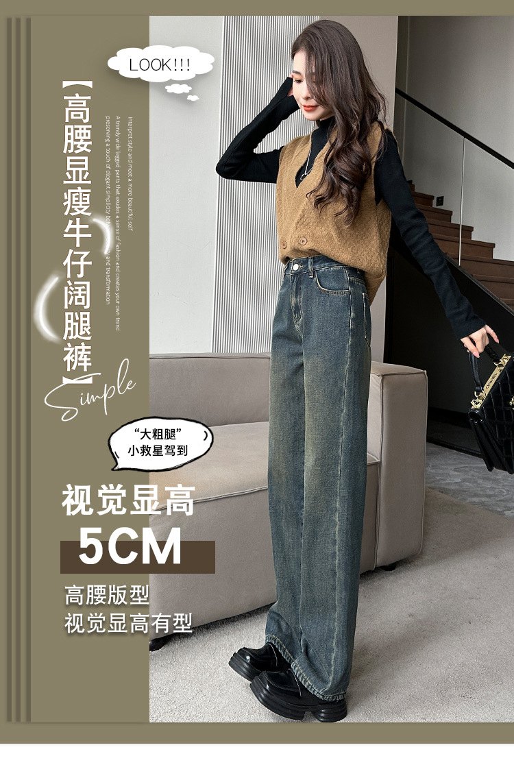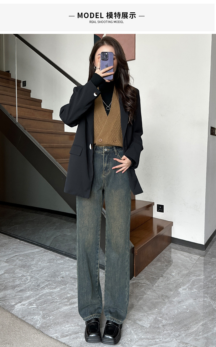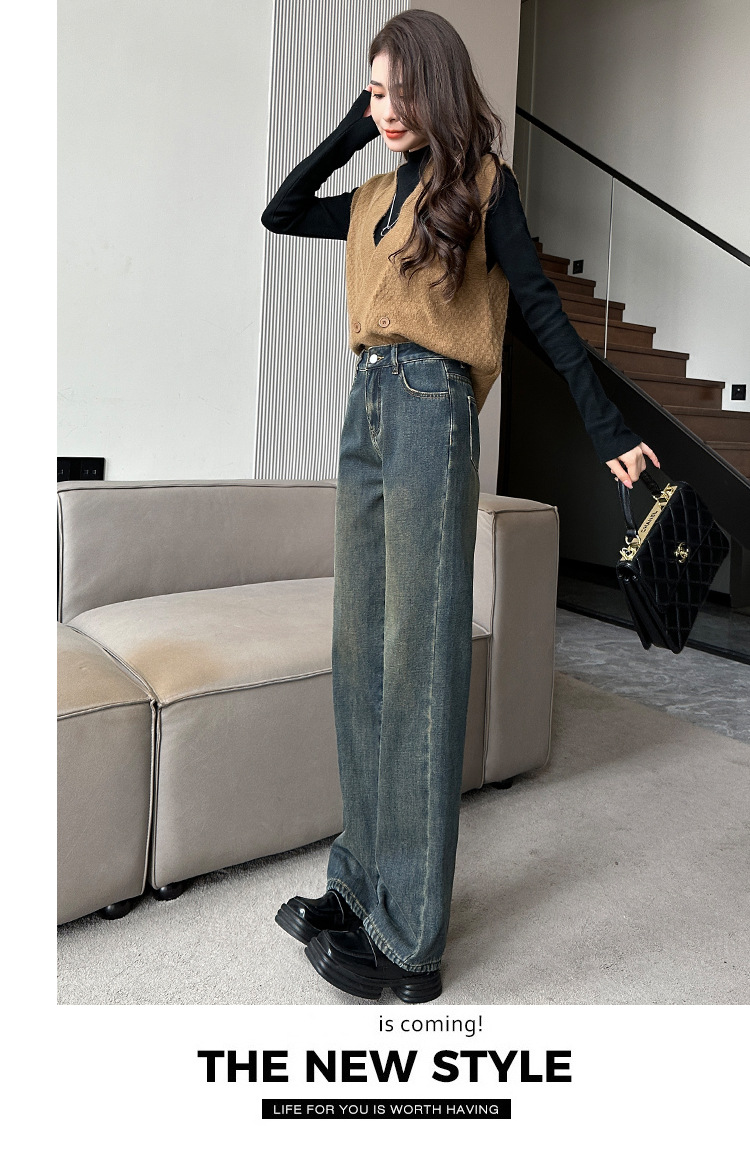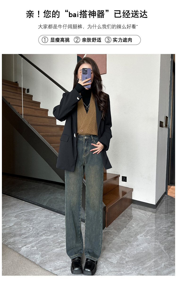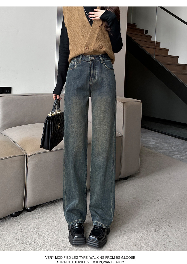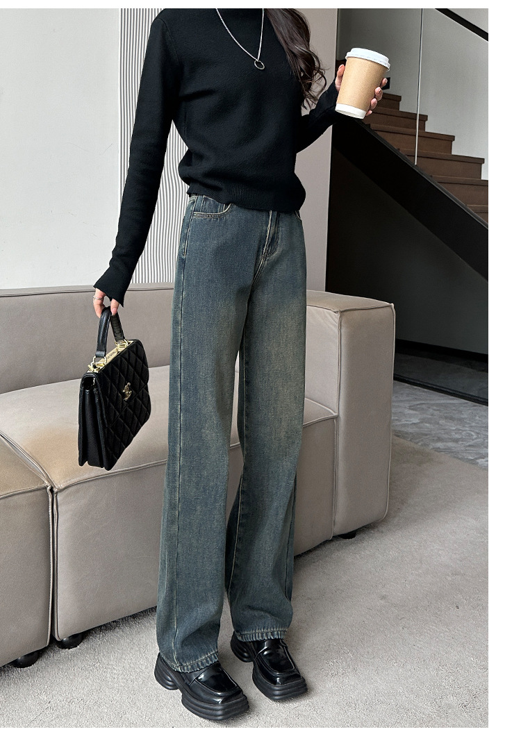 리얼 샷 가을과 겨울 기모 청바지 여자의 2023 작은 높은 허리 슬리밍 스트레이트 다리 넓은 다리 바닥 바지