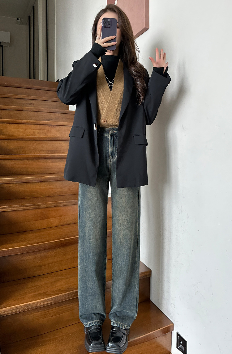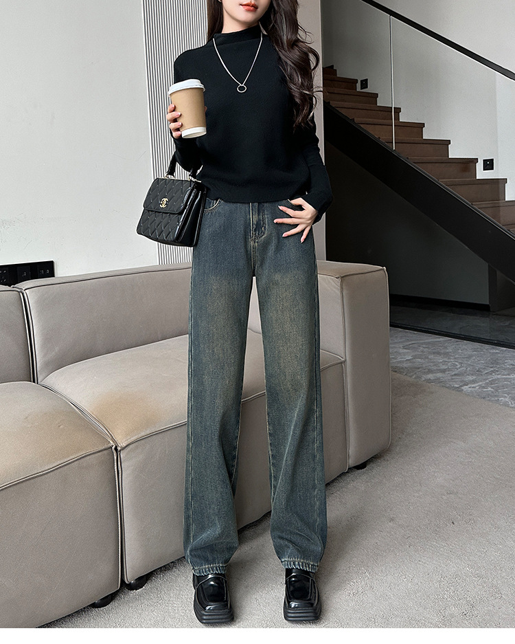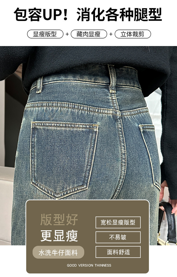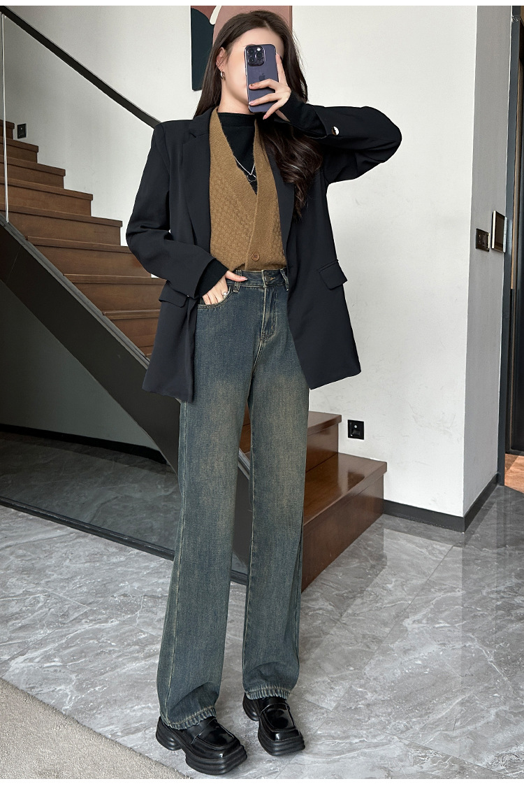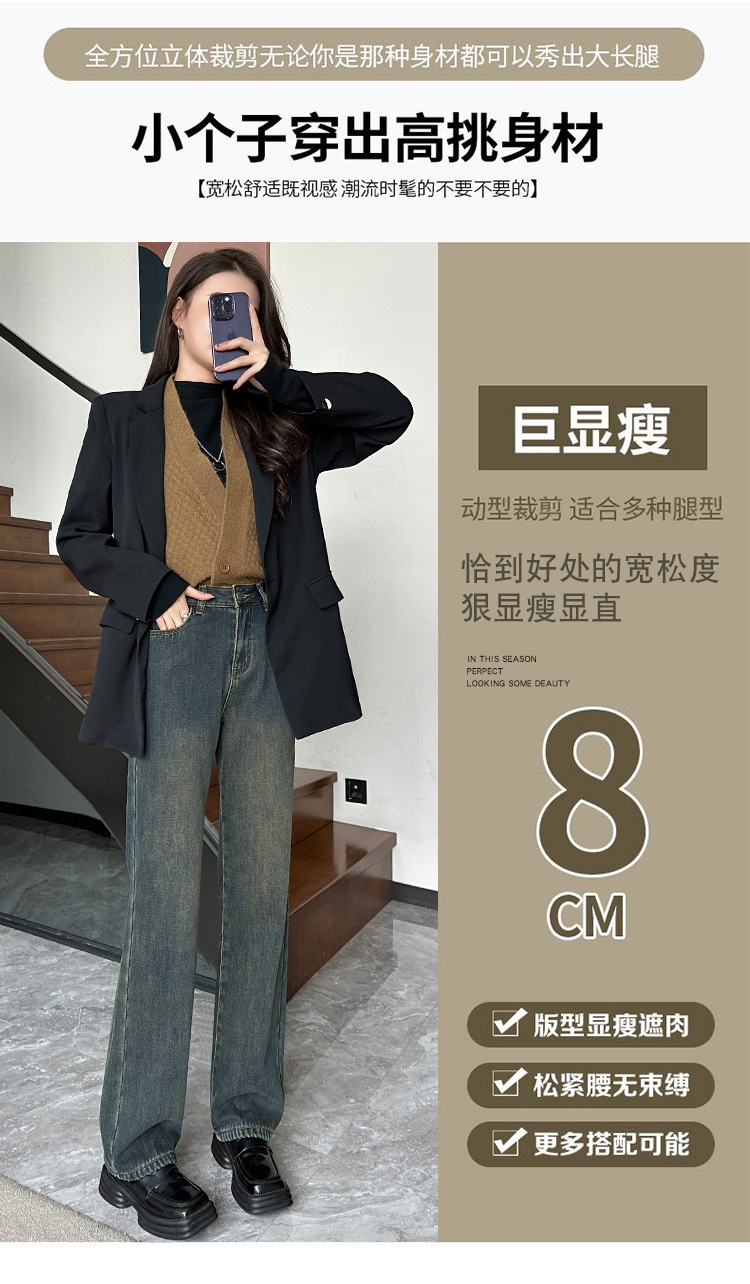 리얼 샷 가을과 겨울 기모 청바지 여자의 2023 작은 높은 허리 슬리밍 스트레이트 다리 넓은 다리 바닥 바지