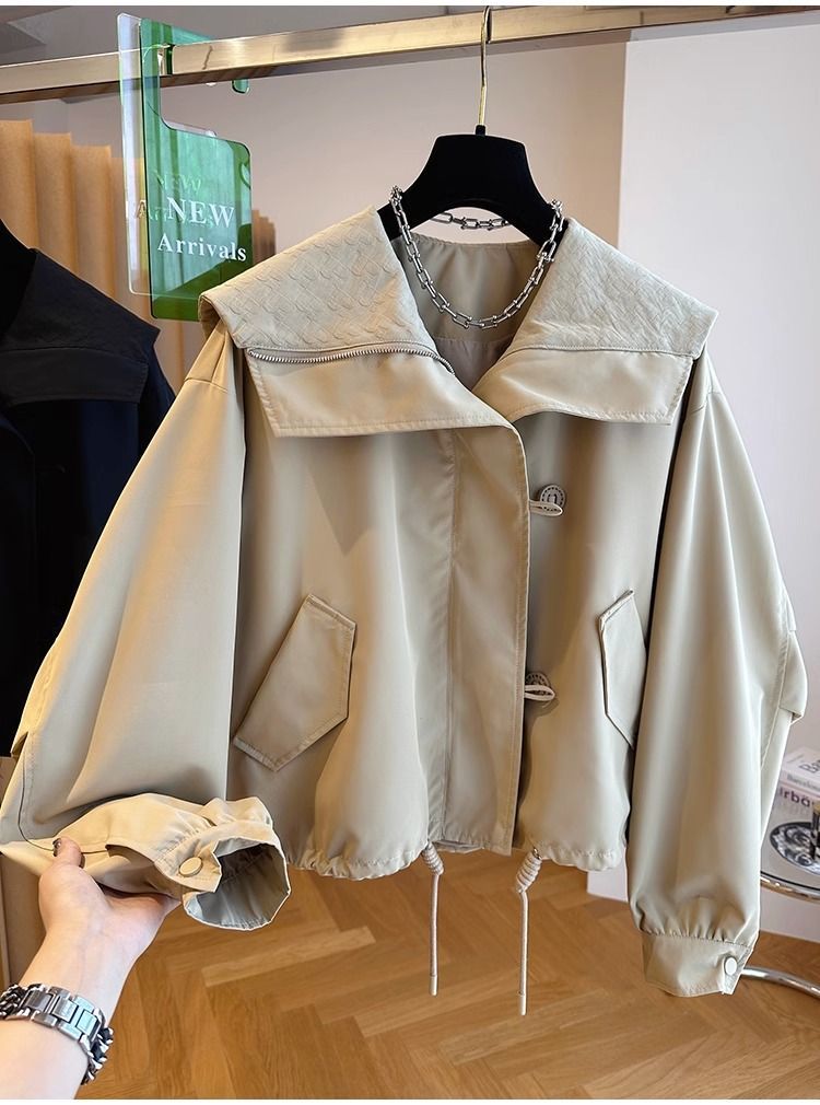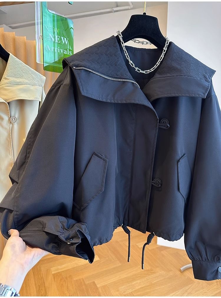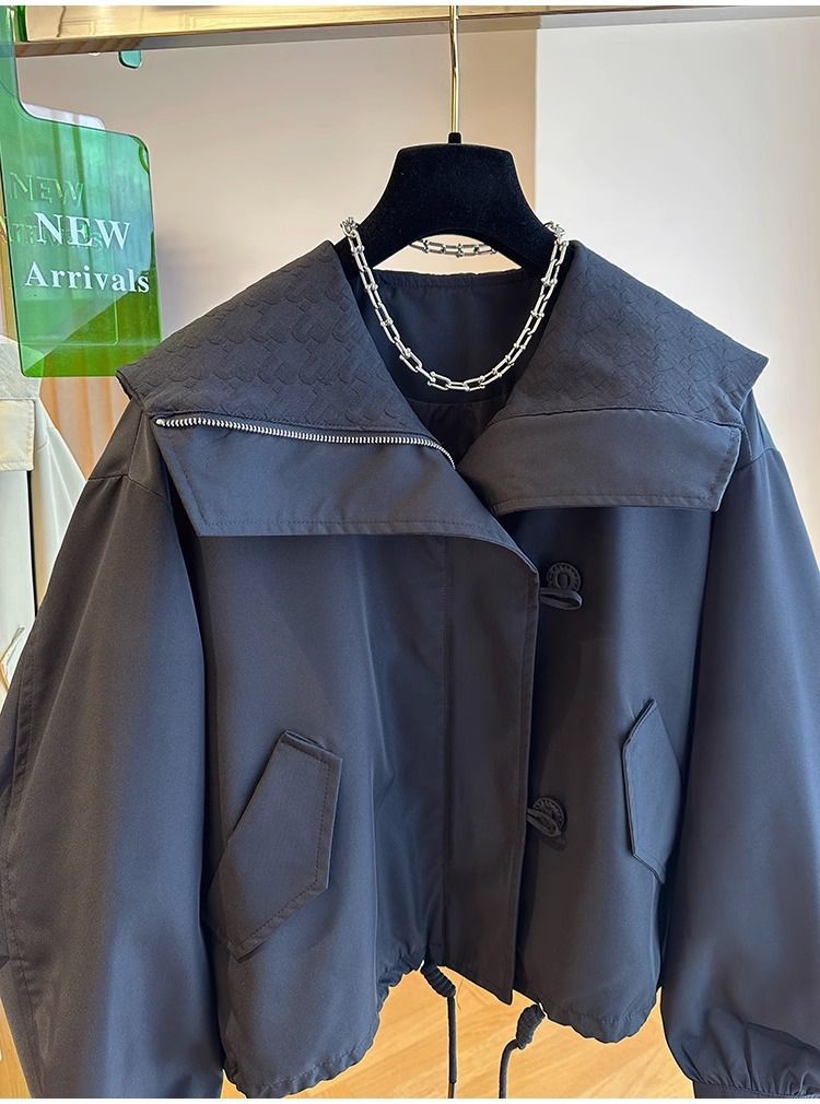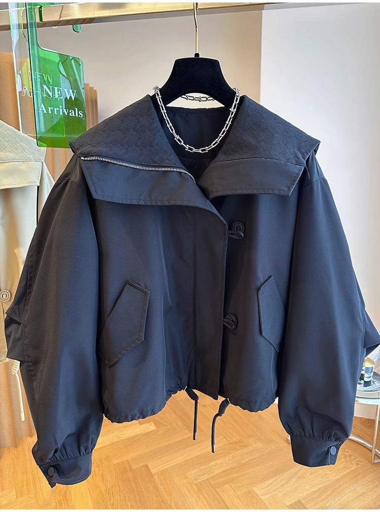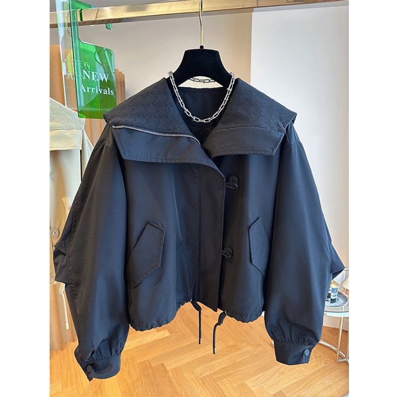 한국 스타일 디자인 센스 틈새 느슨한 캐주얼 버클 네이비 칼라 짧은 코트 여성의 봄과 가을 유행 재킷 탑