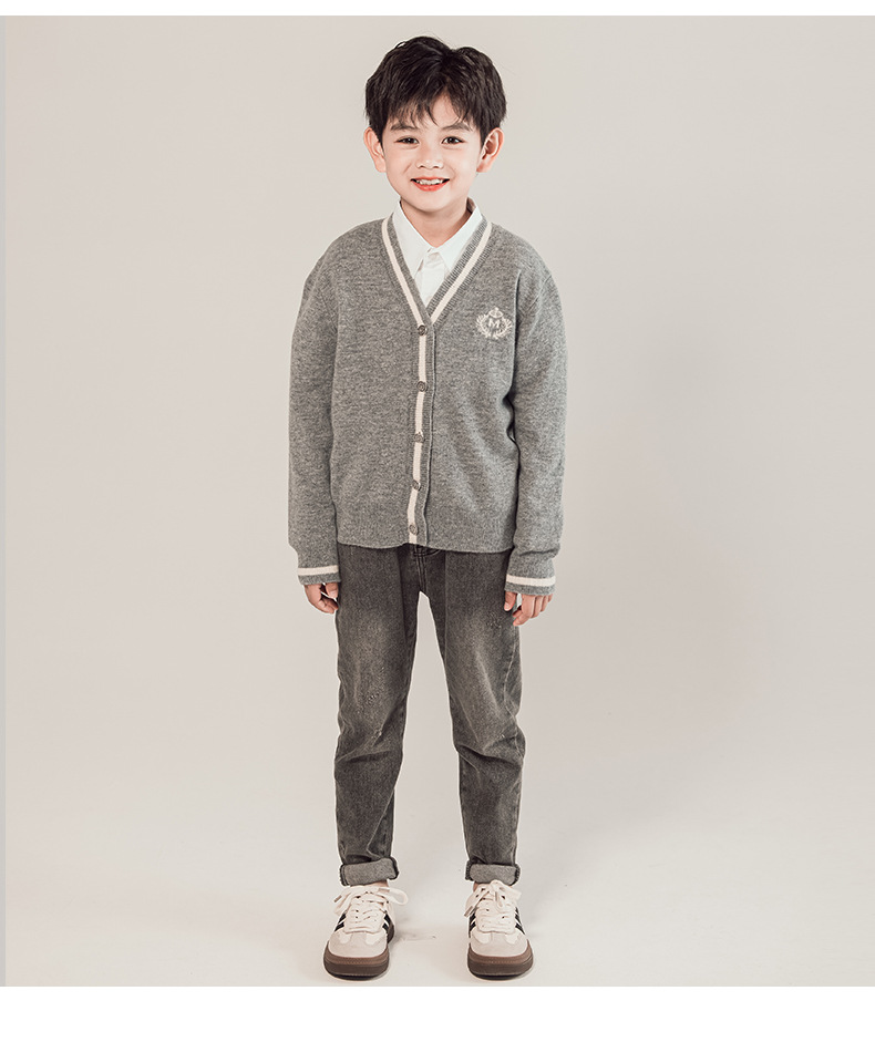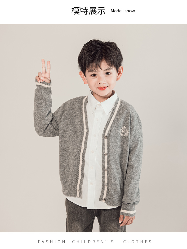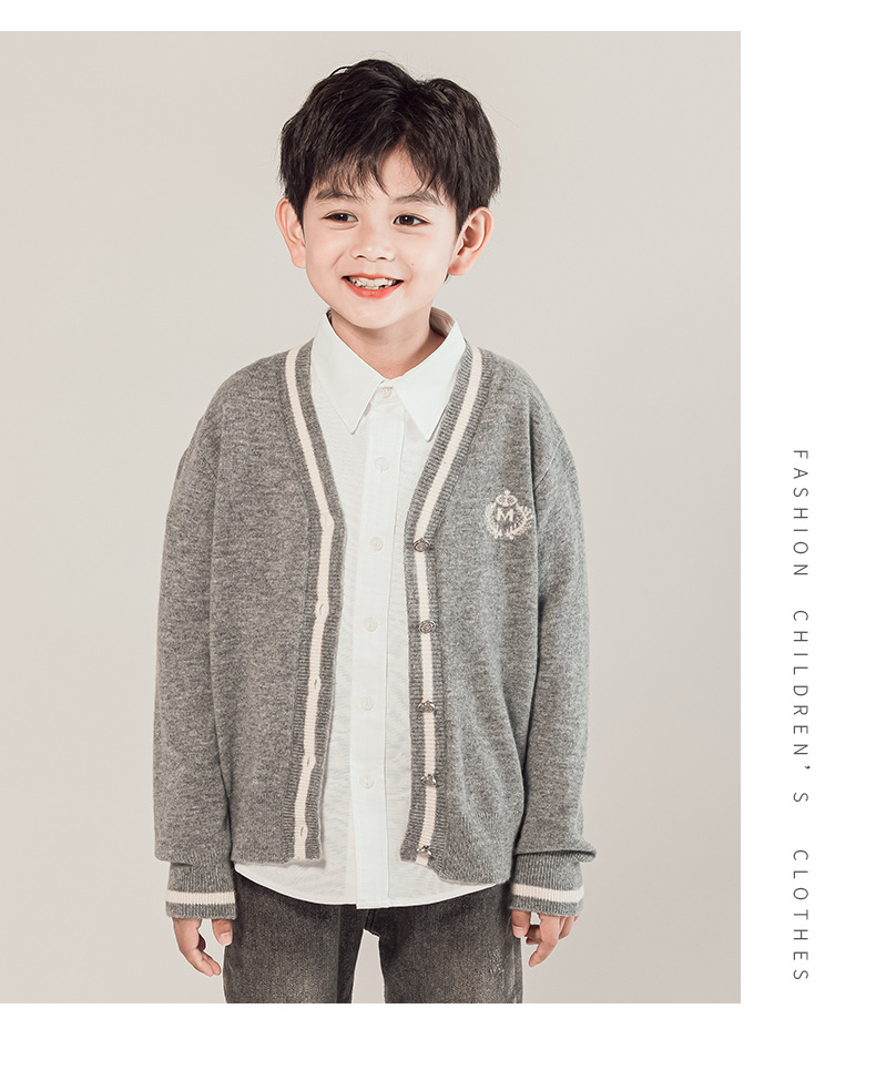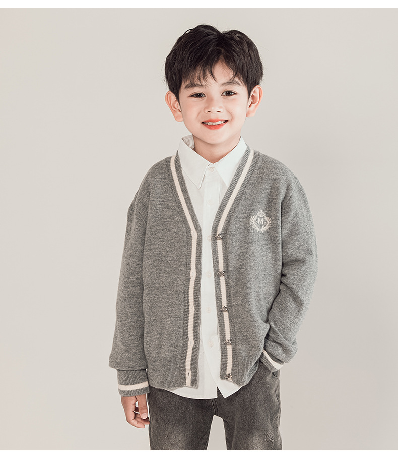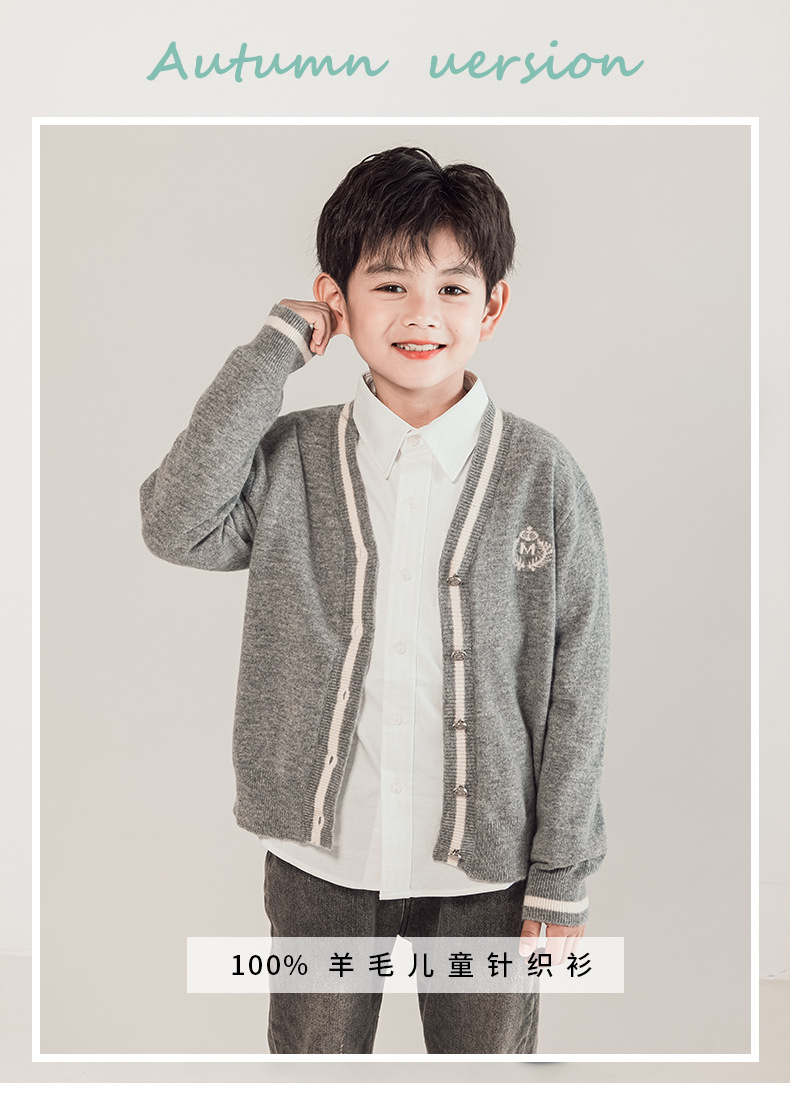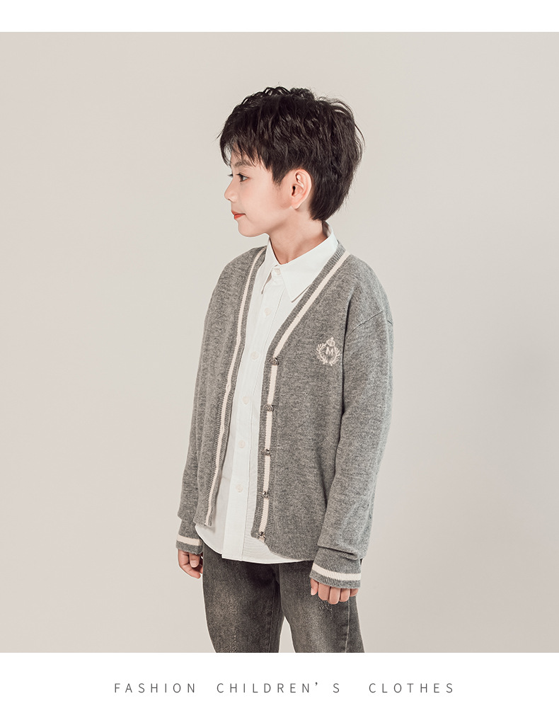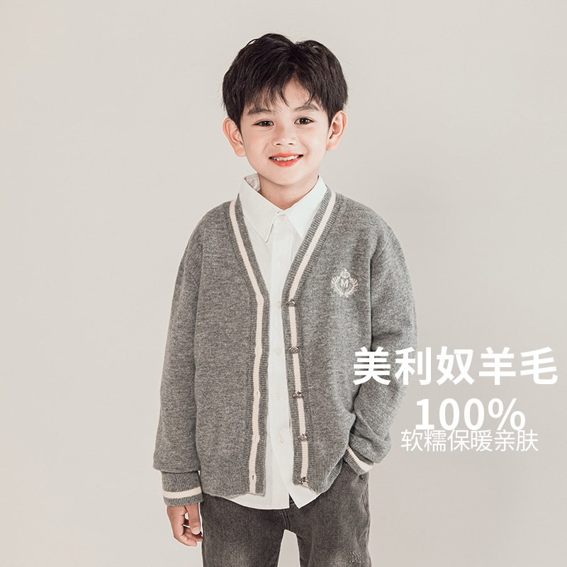 어린이 100% 순수 모직 스웨터 카디건 소년 스웨터 2023 새로운 중형 및 대형 어린이 니트 재킷 대학 스타일 한국 스타일스토어 가기
