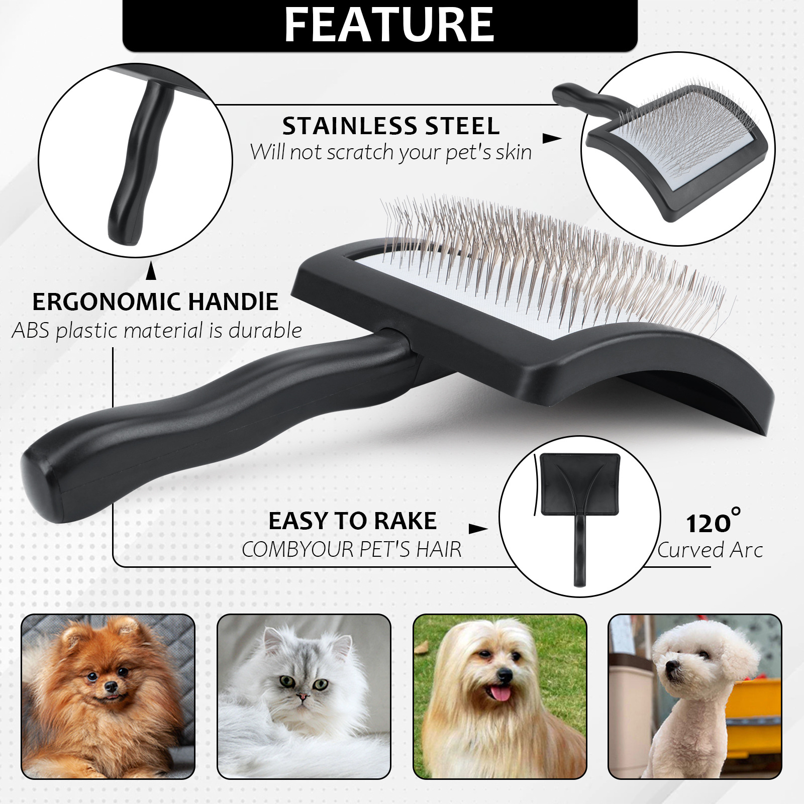 【超长针式刷子,去除粗糙的长卷发。】 - 我们的宠物刷具有独特的设计,更长、更密、更软的不锈钢针可渗透到毛发深处,总共 180 根针。 每根钢齿角度均增加 135 度,适合宠物毛发的接触区域,不会变形,不伤害皮肤,无静电毛发。这款适用于狗狗和猫咪的光滑刷安全有效,不会拉扯或抓毛,更适合放松按摩。