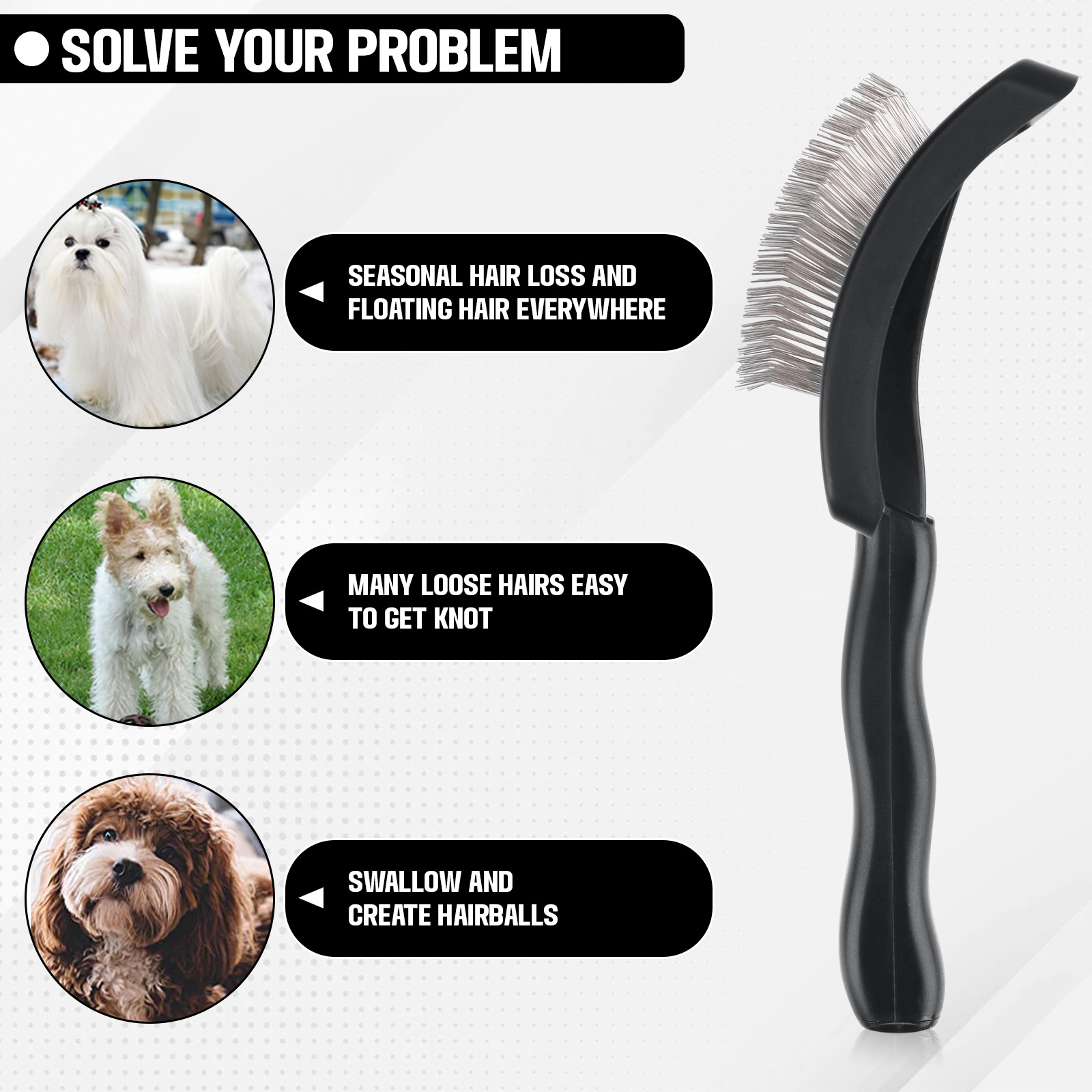 【120° 大独特弧形手柄设计更易于使用】 - 大型接触面增加梳理过程中与宠物毛发的接触面积。120° 曲面符合美容习惯,节省时间和精力。 超长针式梳子尺寸适合中小型犬或长毛的猫。这款多功能刷非常适合松散的长毛、直发、卷曲、浓密、毛茸茸的毛发。
