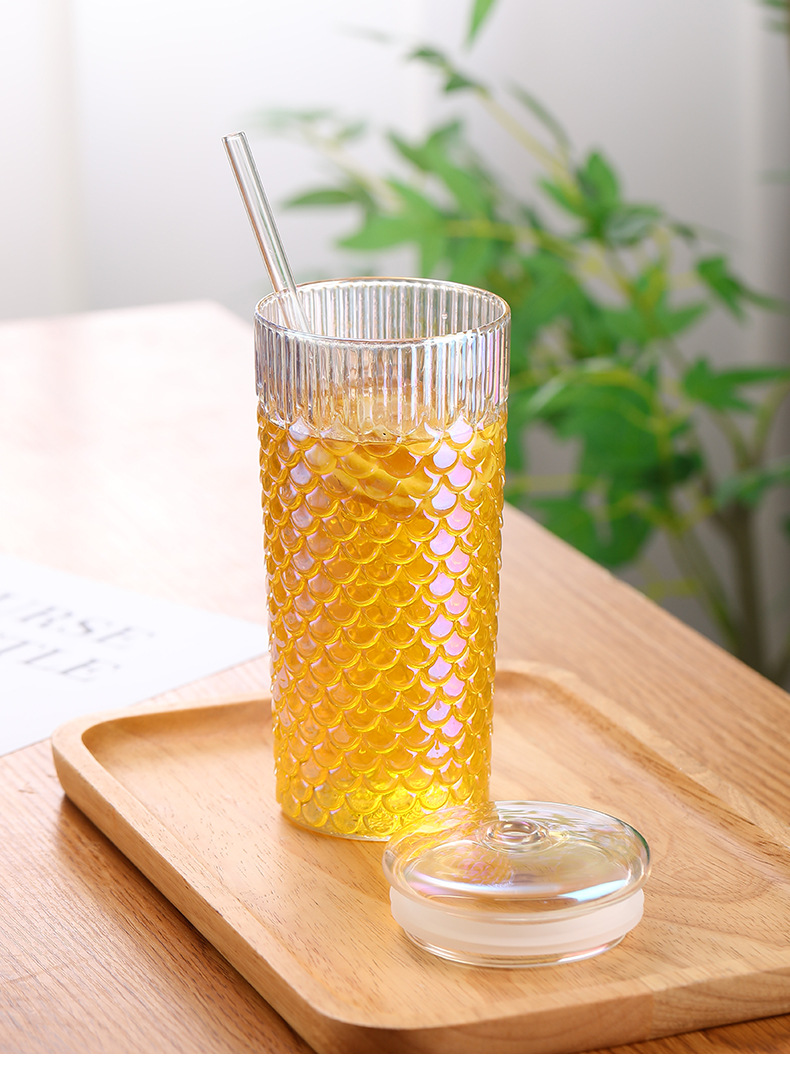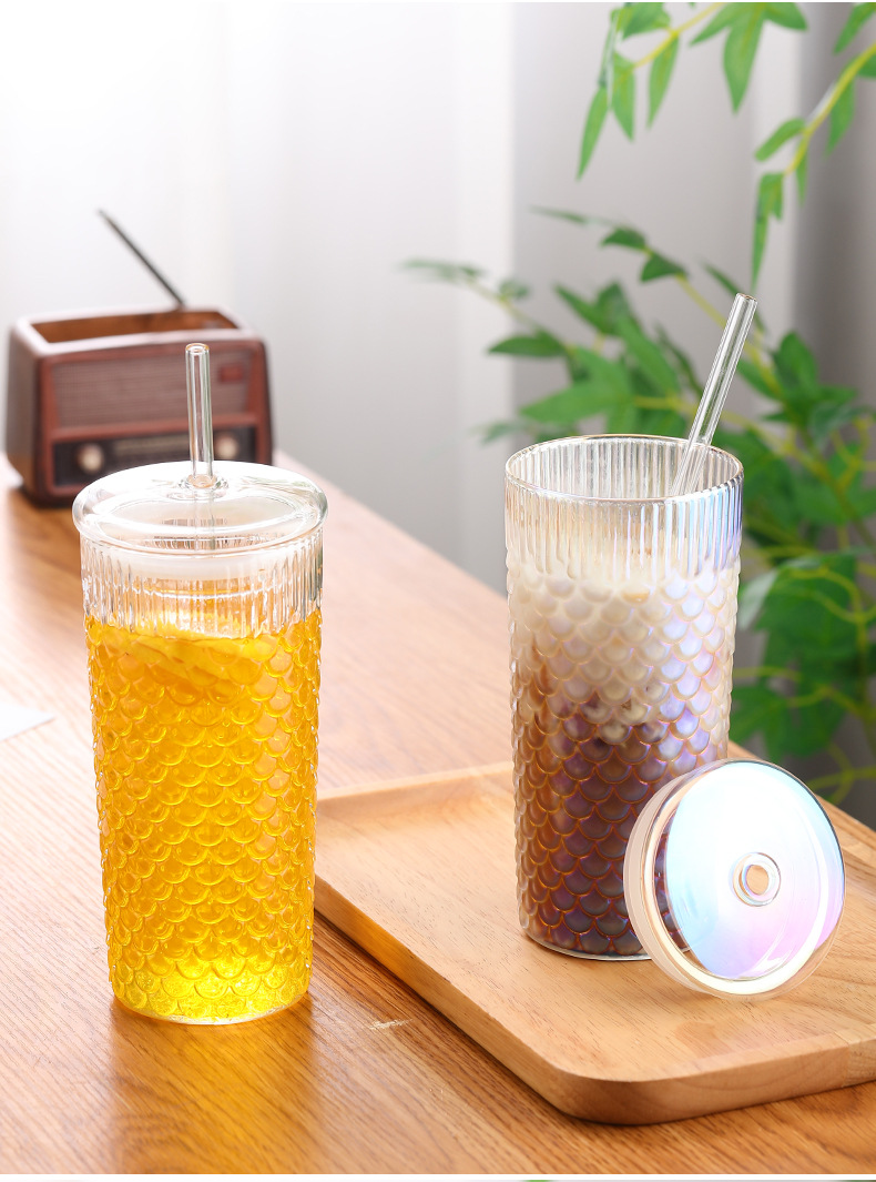 뚜껑이 있는 창의적인 유리 빨대 컵, 고급스러운 가정용 유리 물컵, 고온 방지 생선 비늘 패턴 밀크 티 컵, 차가운 음료 컵