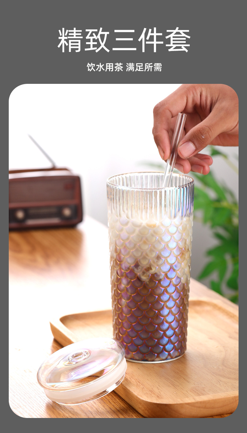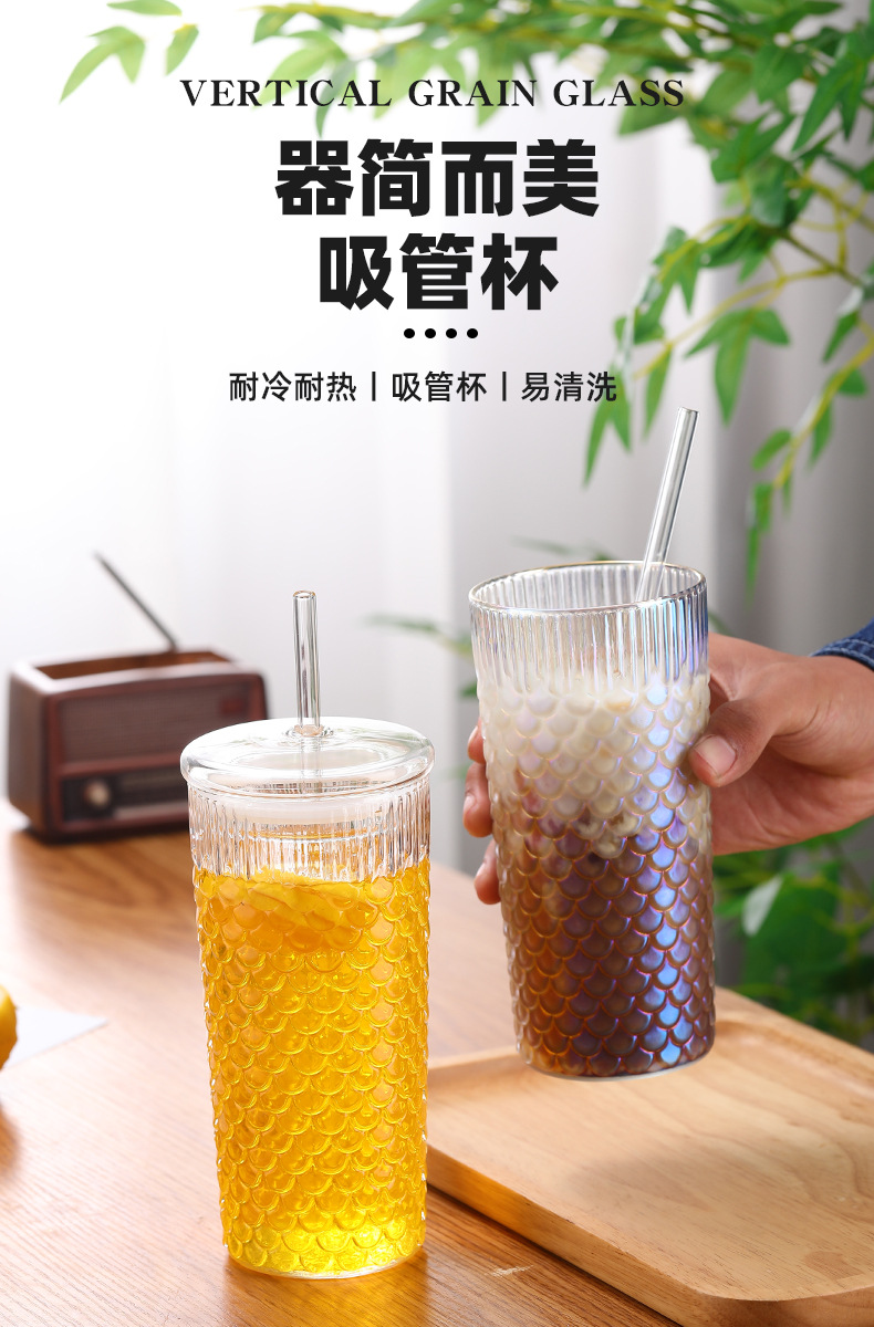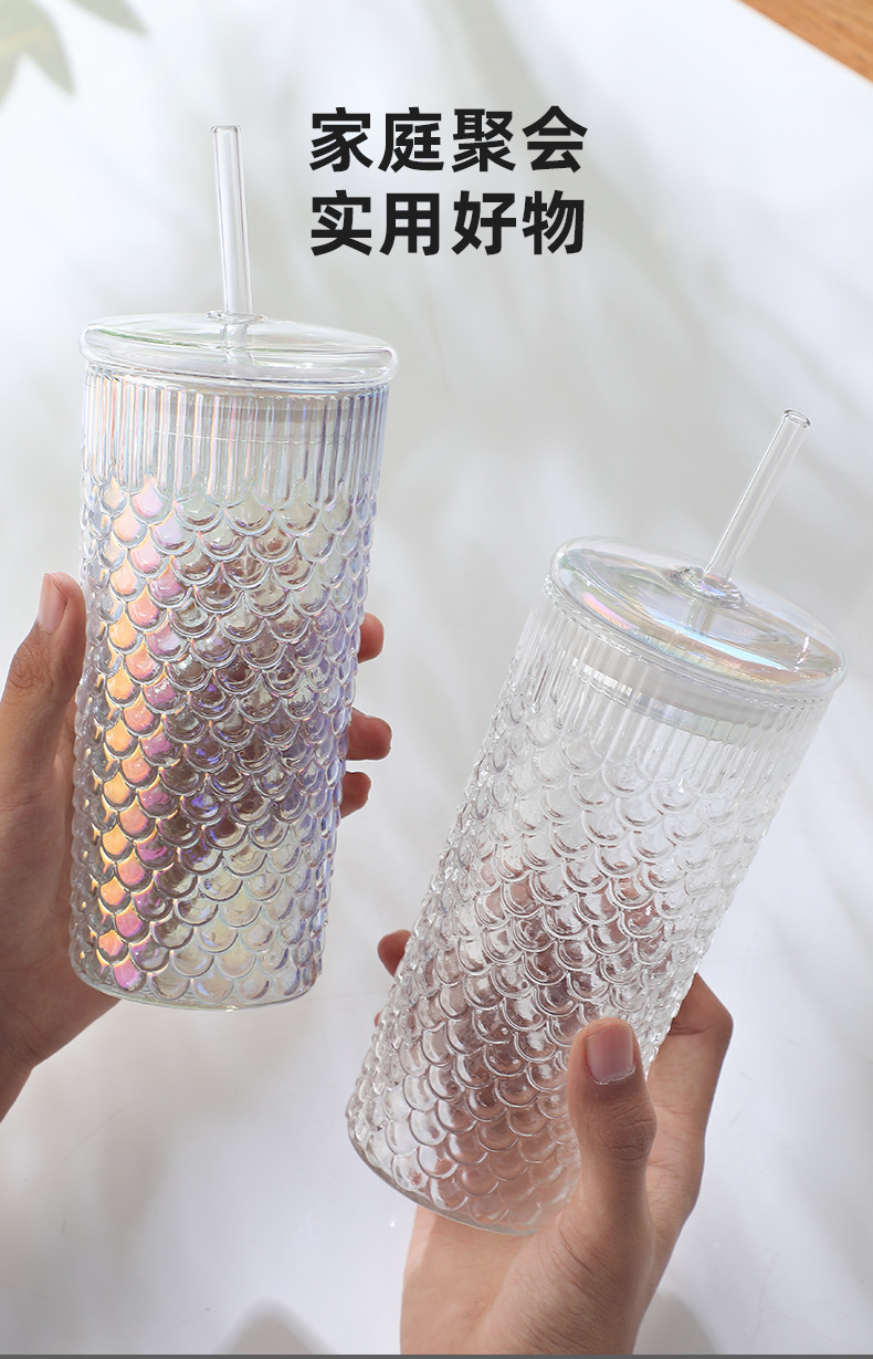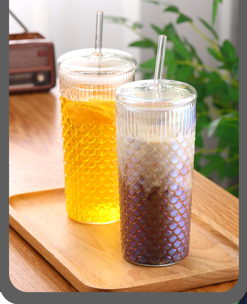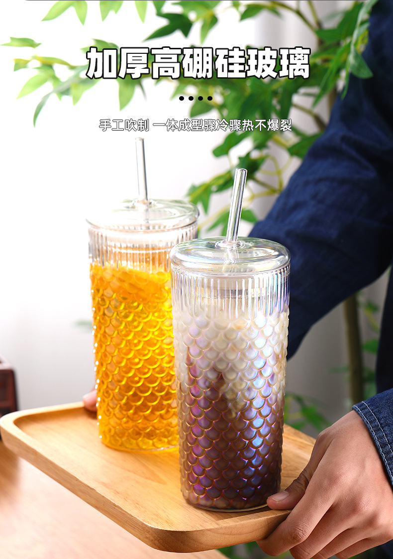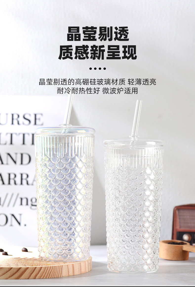 뚜껑이 있는 창의적인 유리 빨대 컵, 고급스러운 가정용 유리 물컵, 고온 방지 생선 비늘 패턴 밀크 티 컵, 차가운 음료 컵스토어 가기