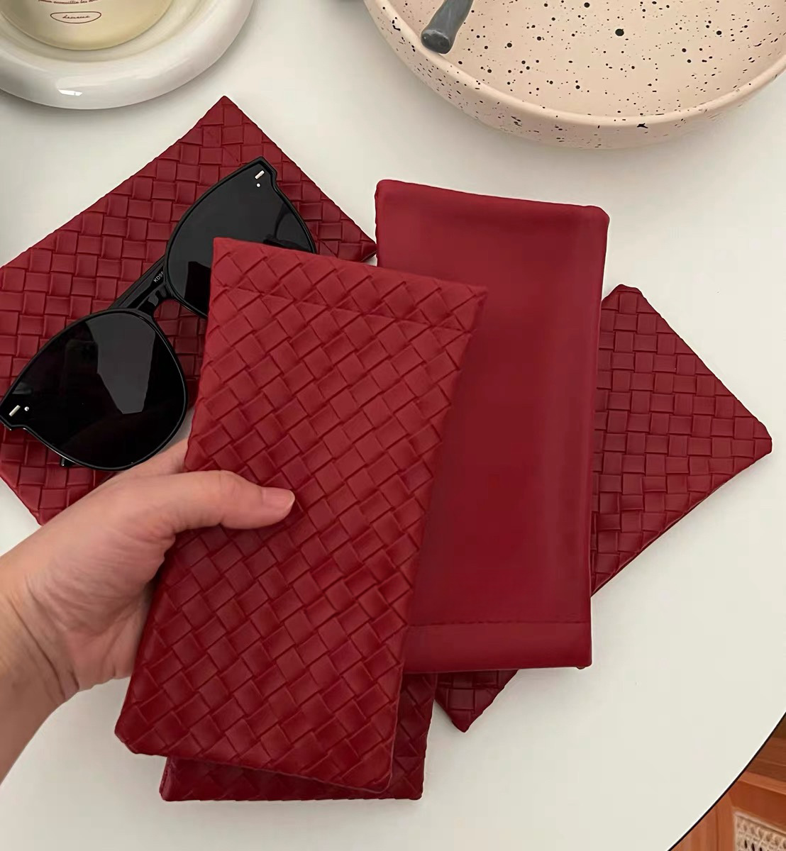 자동 폐쇄 파편 간단한 안경 가방 단색 짠 패턴 PU 가죽 안경 보관 가방 근시 선글라스 가방스토어 가기