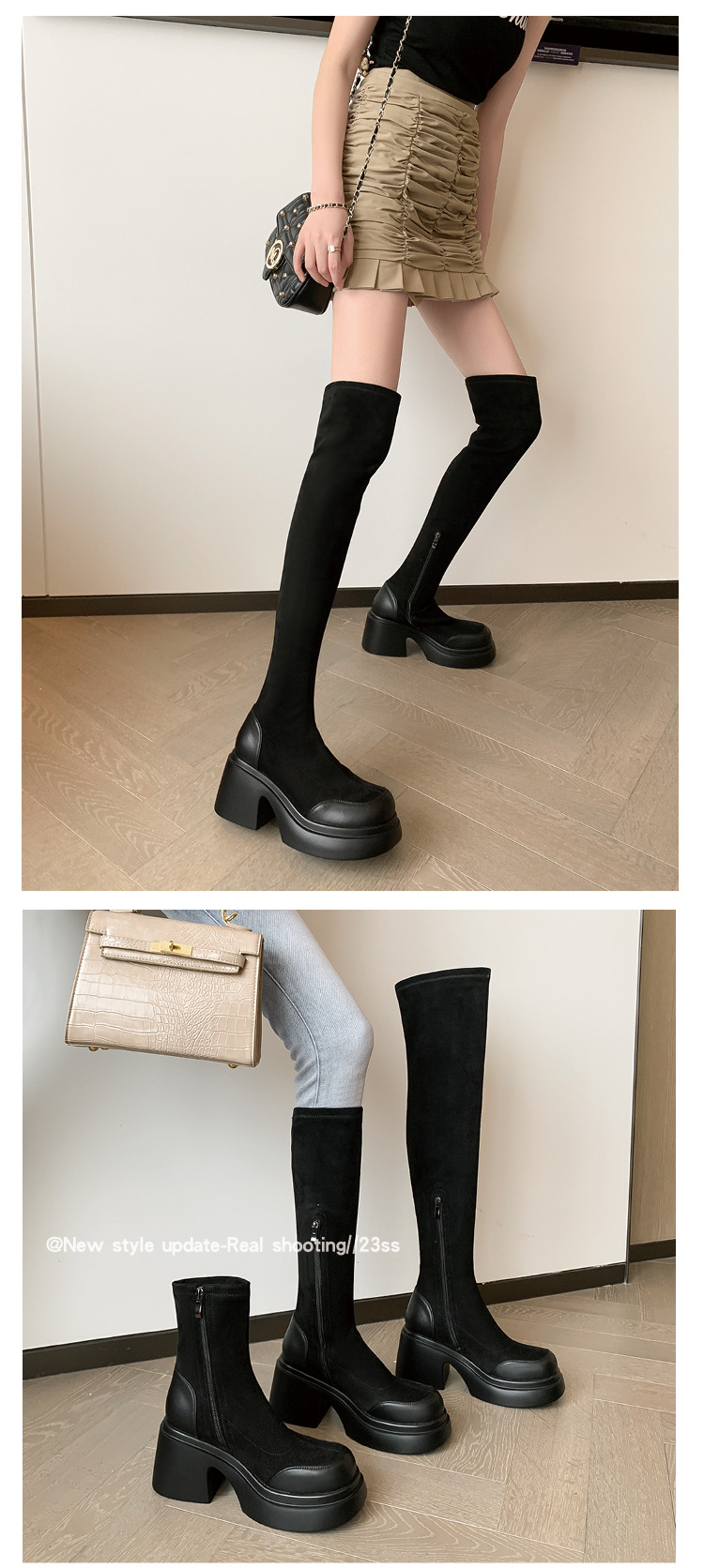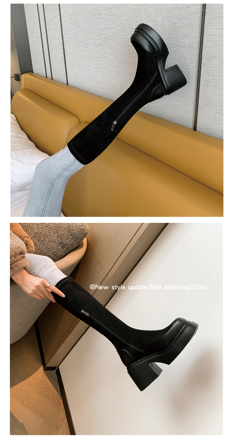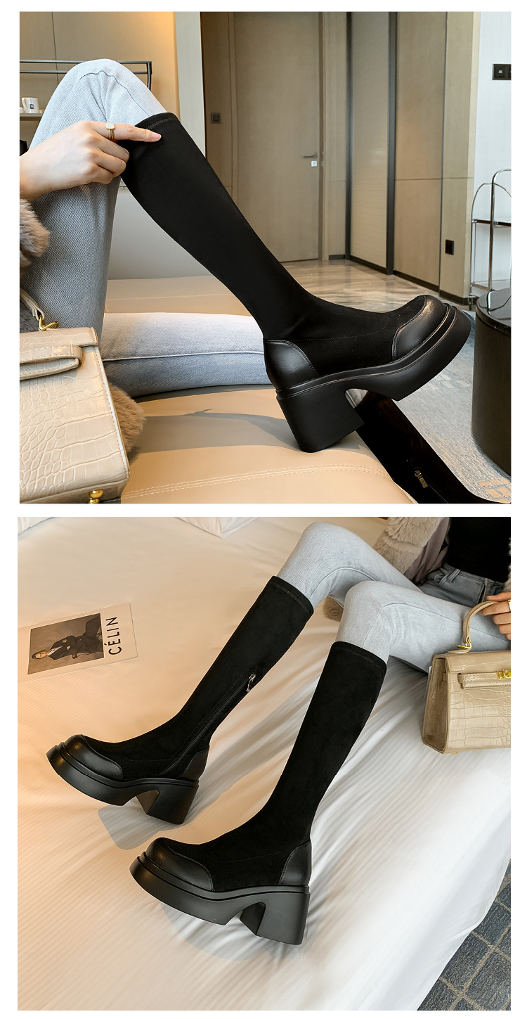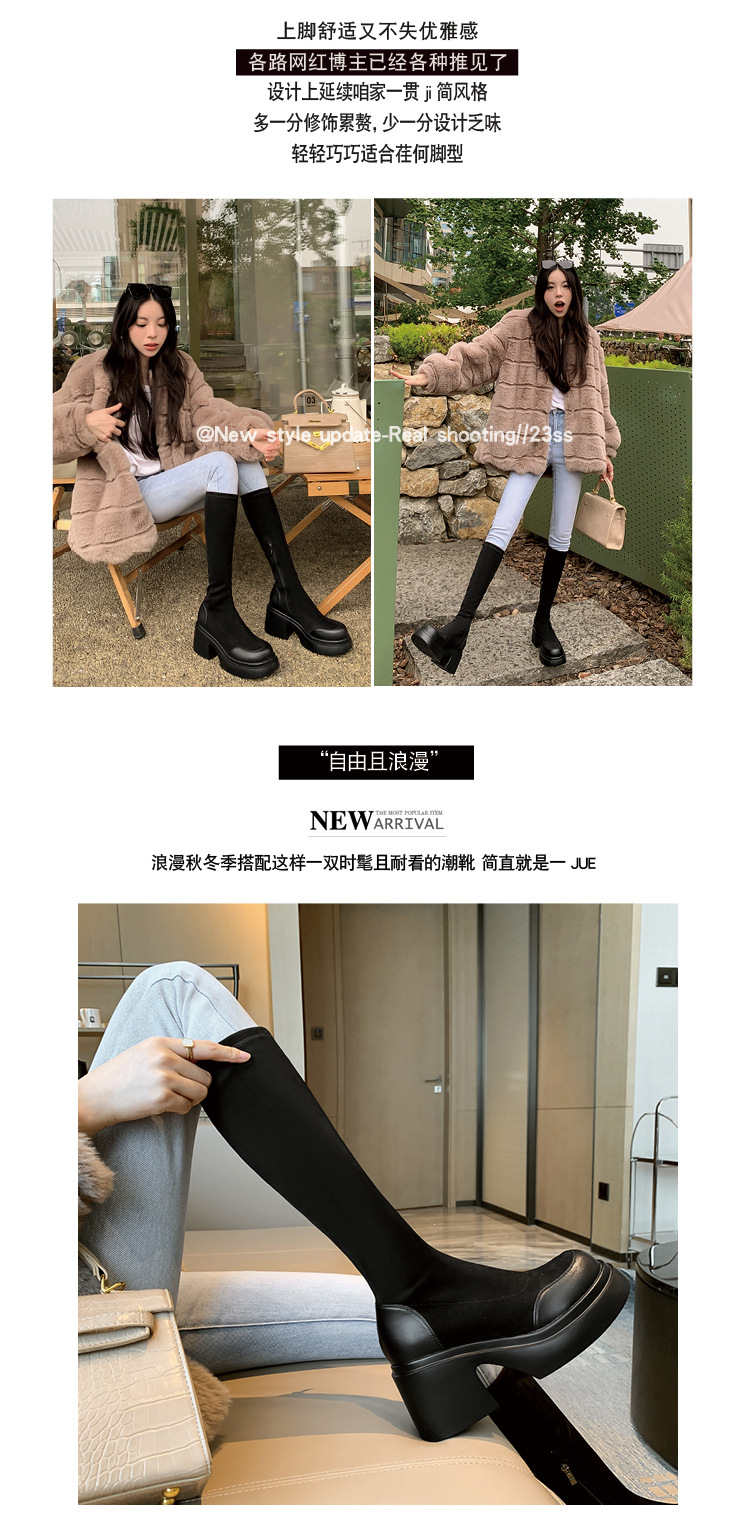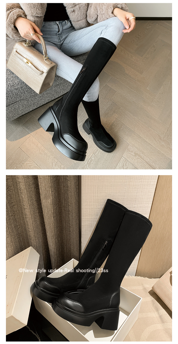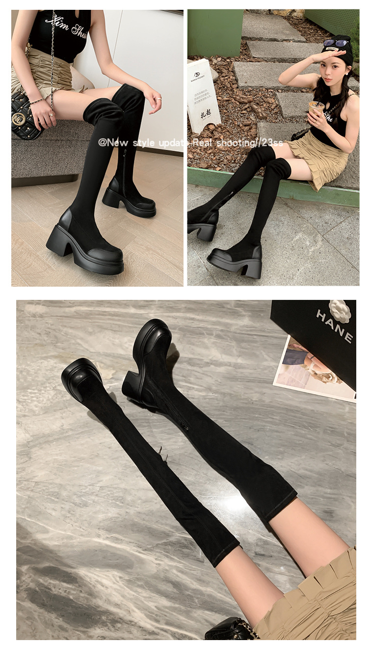 Lingge Studio 두꺼운 바닥 슬리밍 하이힐 오버 더 니 부츠 여성용 2023 새로운 쇼트 부츠 빅 붐 부츠 조수스토어 가기