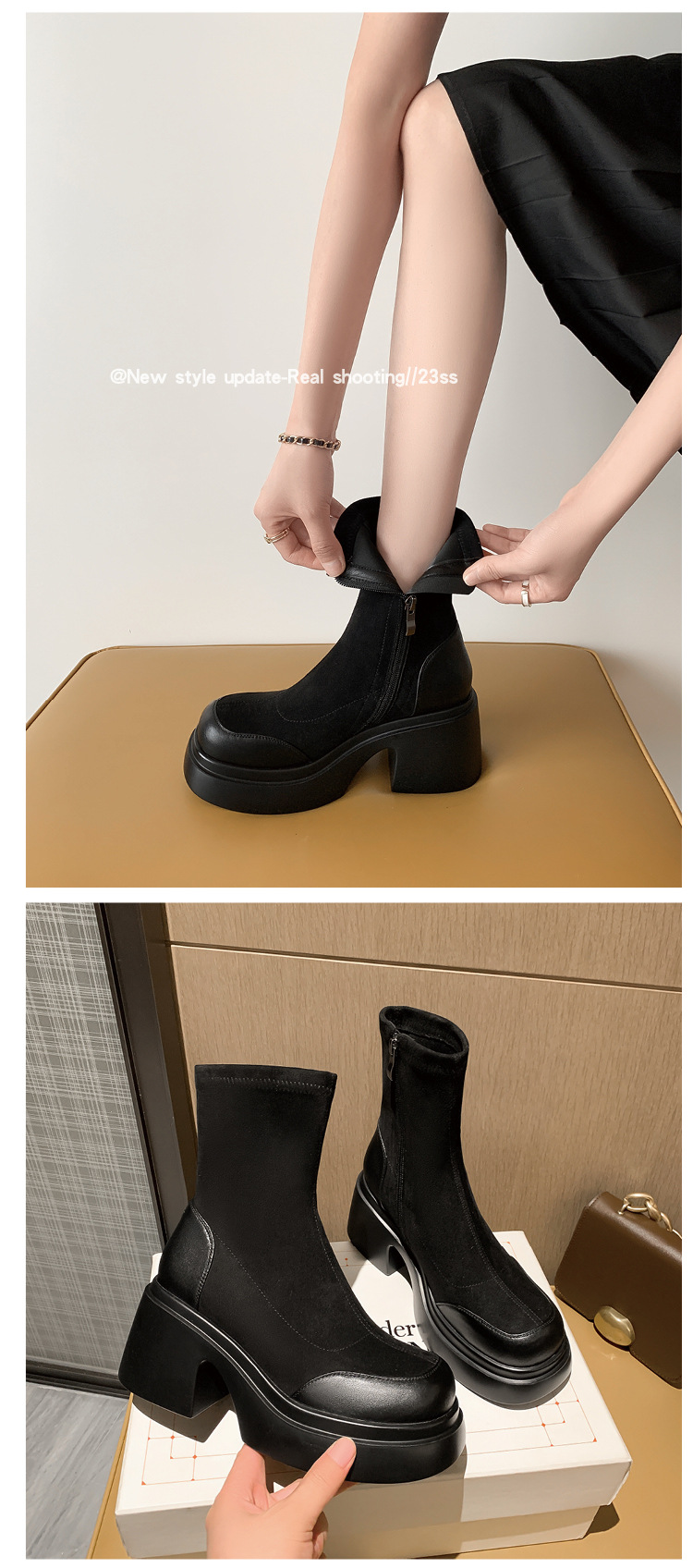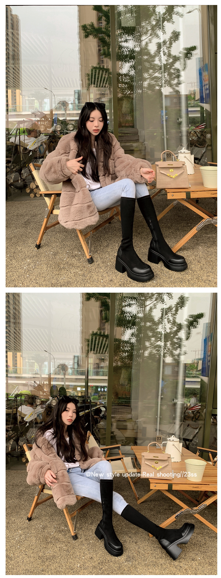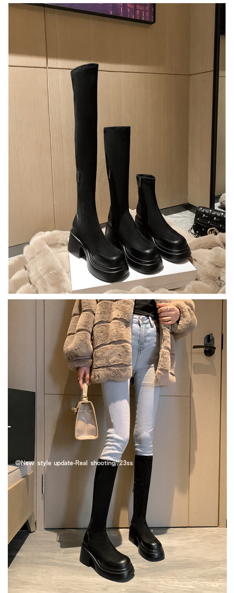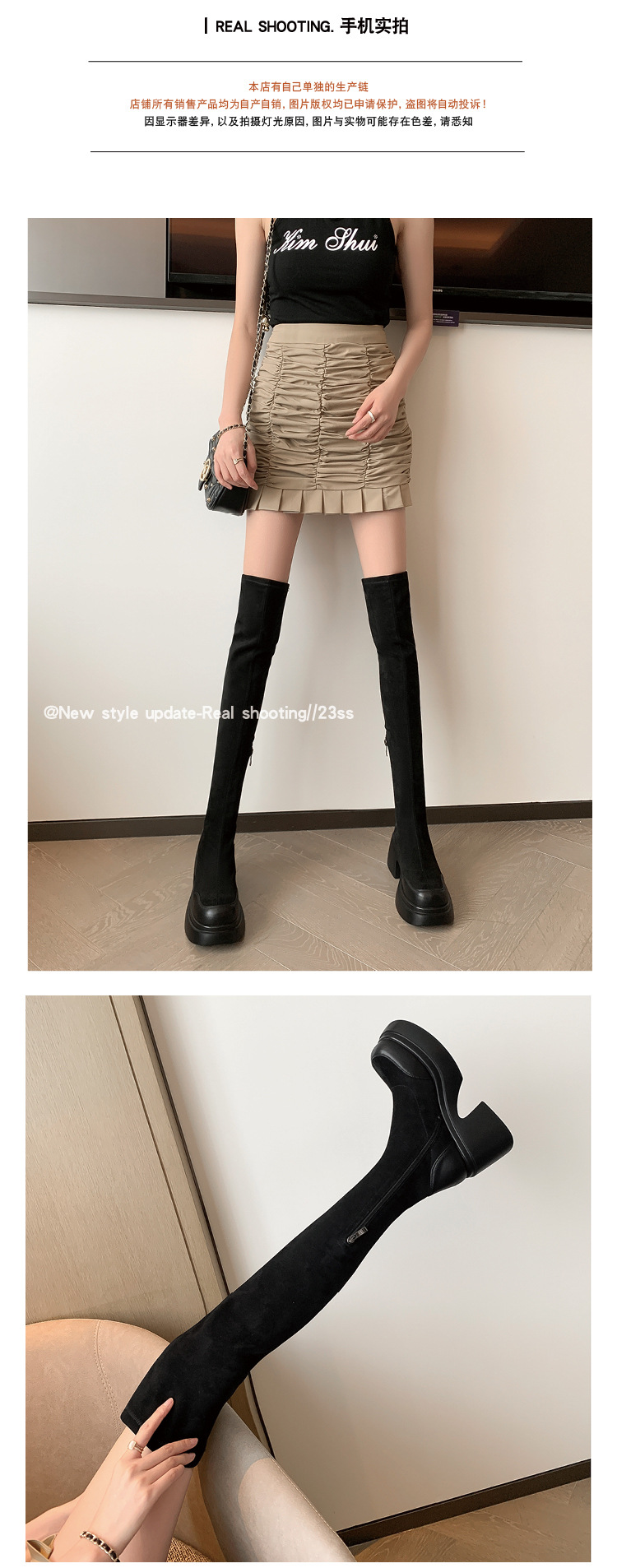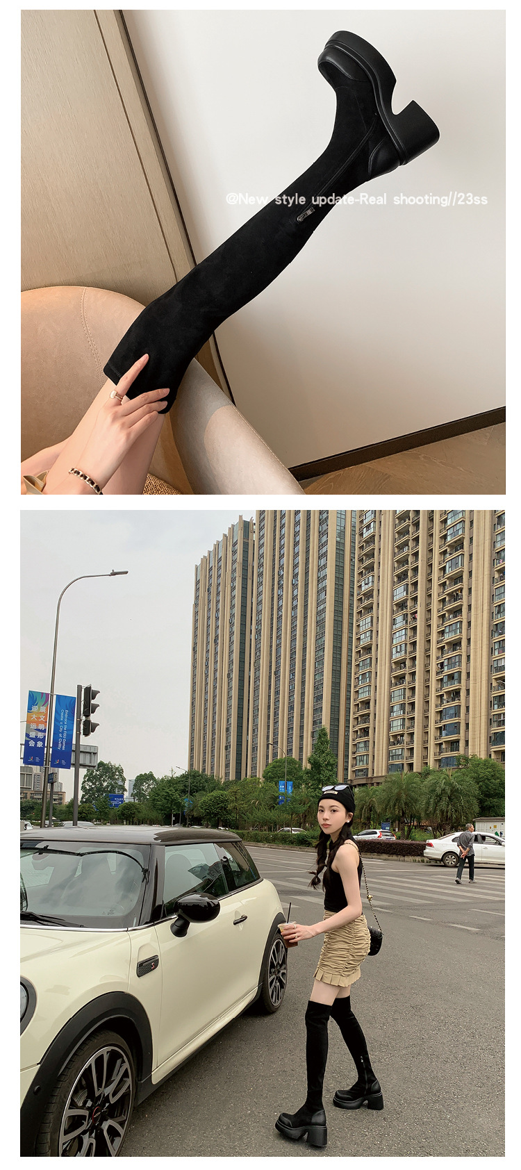 Lingge Studio 두꺼운 바닥 슬리밍 하이힐 오버 더 니 부츠 여성용 2023 새로운 쇼트 부츠 빅 붐 부츠 조수스토어 가기