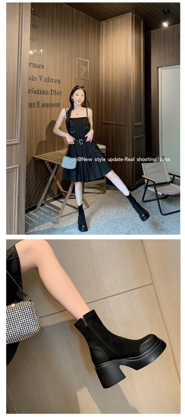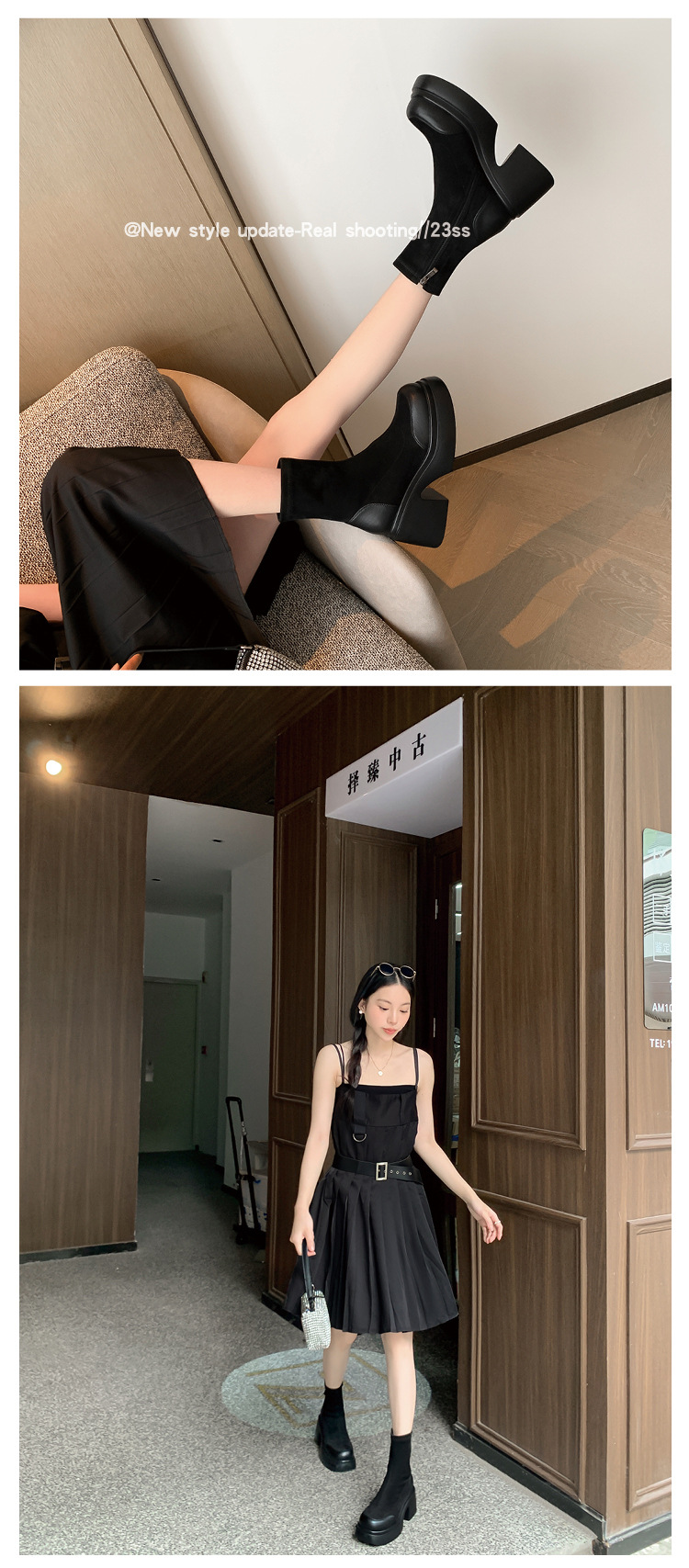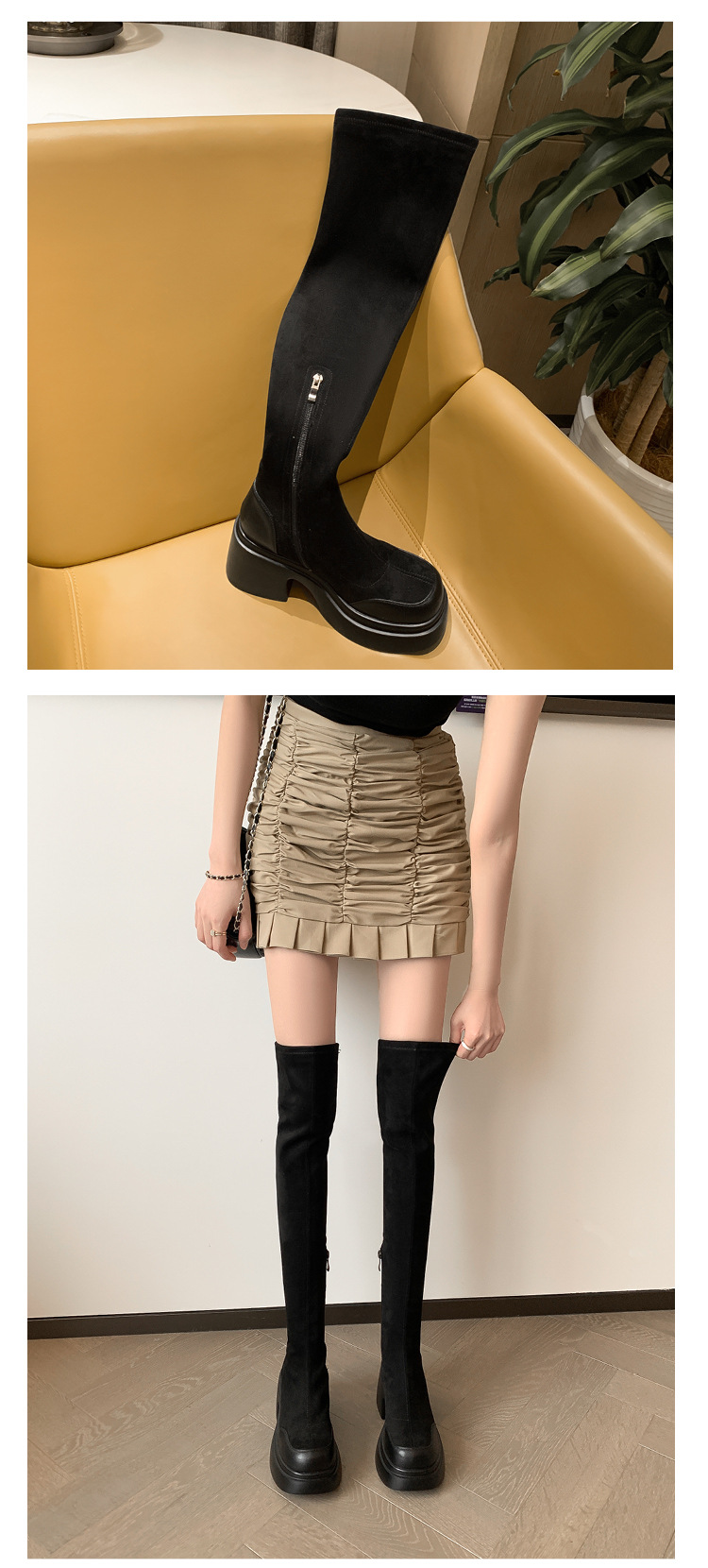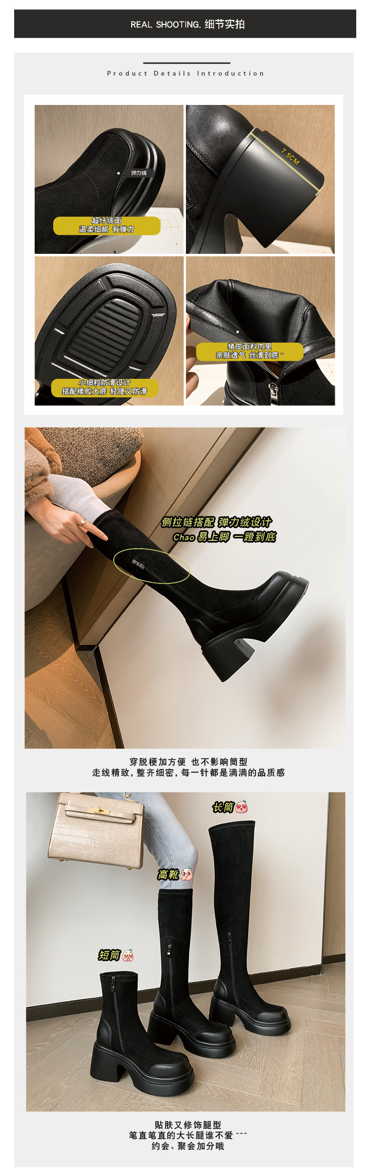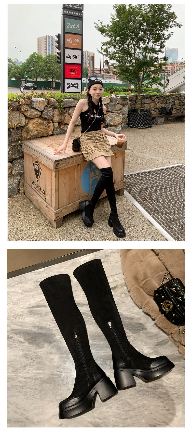 Lingge Studio 두꺼운 바닥 슬리밍 하이힐 오버 더 니 부츠 여성용 2023 새로운 쇼트 부츠 빅 붐 부츠 조수스토어 가기