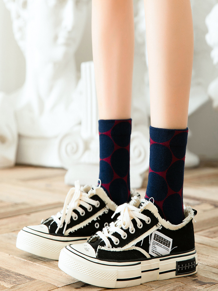 일본 가을과 겨울 여성 양말 대형 라운드 도트 간단한 영어 스타일 색상 대비 추상 귀여운 웨이브 도트 패턴 미드 양말 스택 양말스토어 가기
