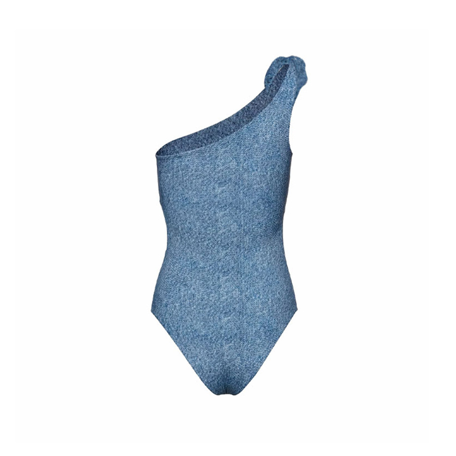 2023 유럽과 미국의 폭발 아마존 AliExpress 꽃 장식 싱글 숄더 중공 소프트 데님 원피스 수영복 여성용 크로스 보더