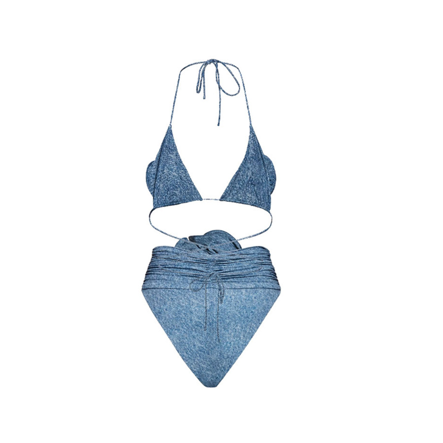 2023 유럽과 미국의 폭발 아마존 AliExpress 꽃 장식 싱글 숄더 중공 소프트 데님 원피스 수영복 여성용 크로스 보더스토어 가기
