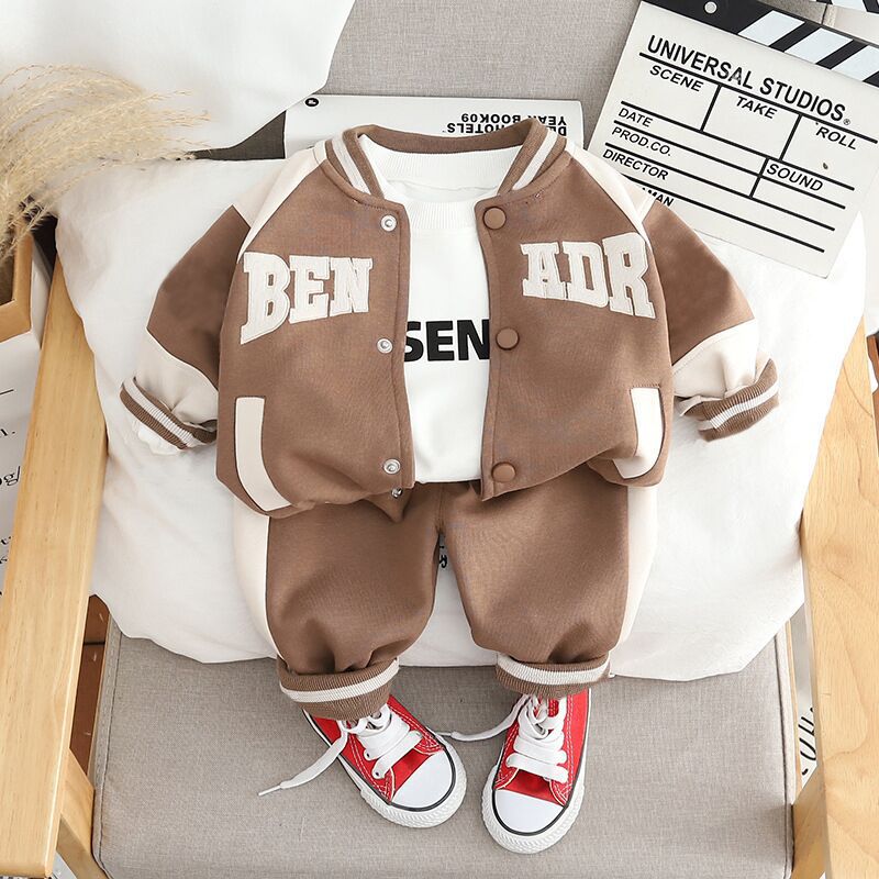 아기 봄가을 세트, 새로운 스타일의 세련된 한국 스타일 멋진 레터링 야구복 3종 세트 (중소형 아동용)