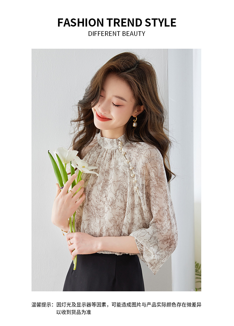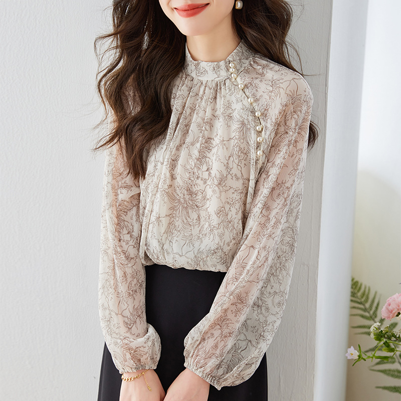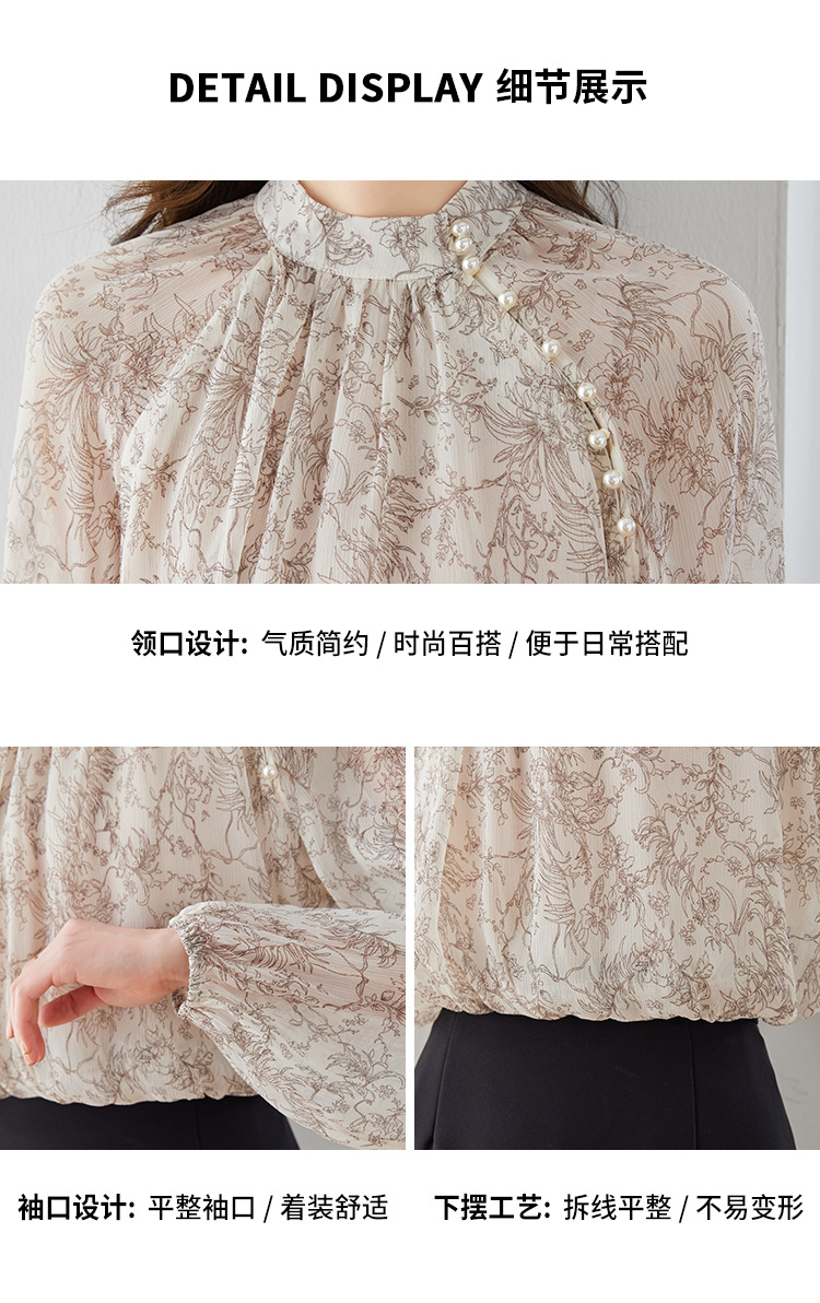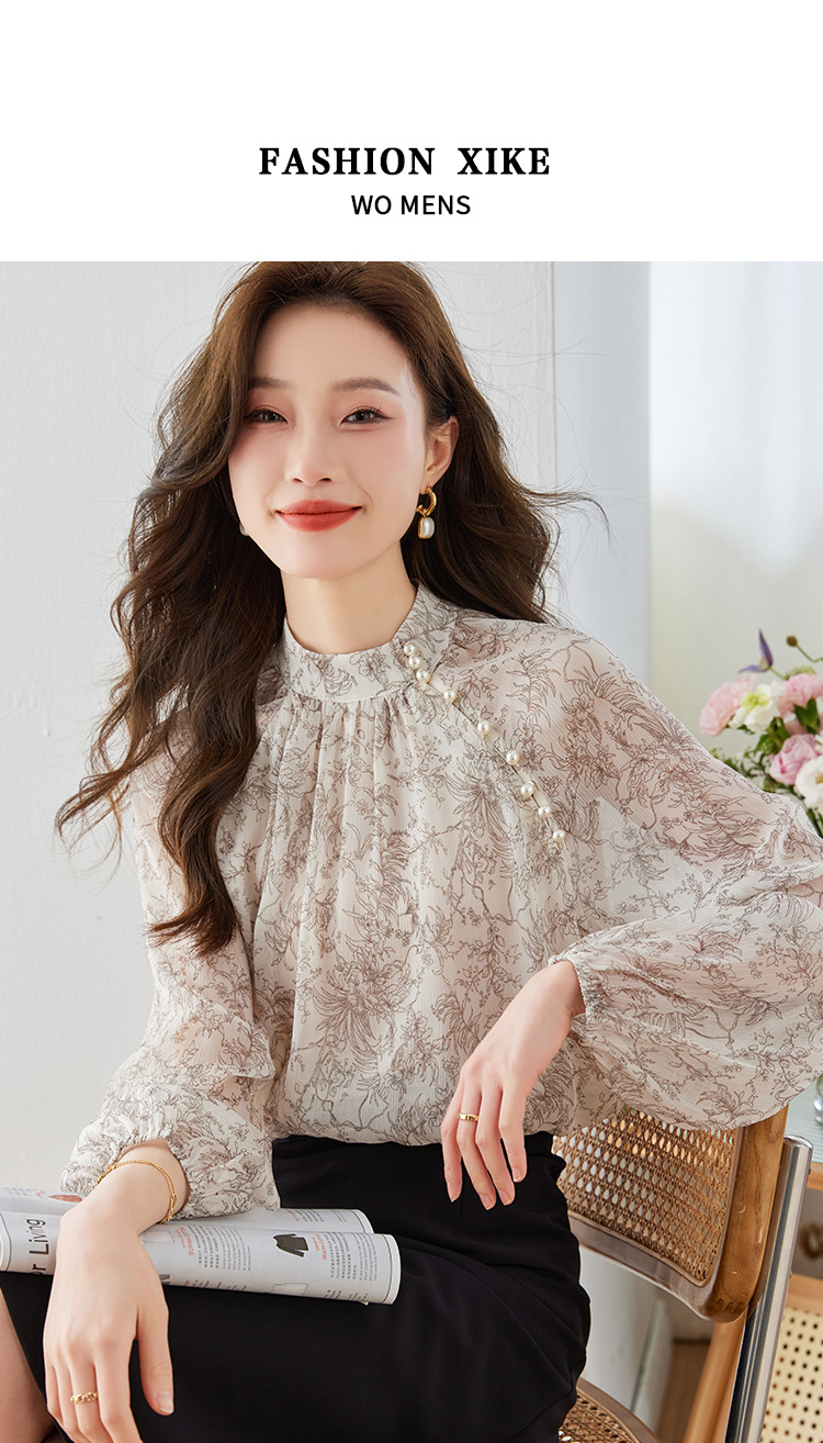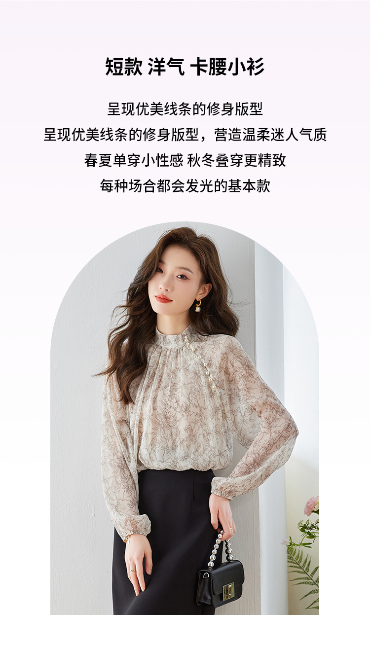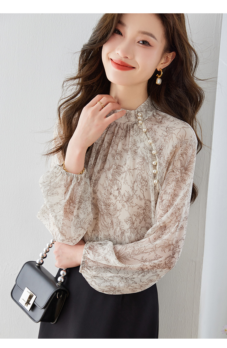 진짜 샷 재고 2023 가을 빈티지 프린트 쉬폰 셔츠 달콤한 기질 작은 셔츠 랜턴 슬리브 탑