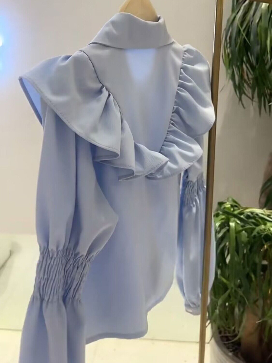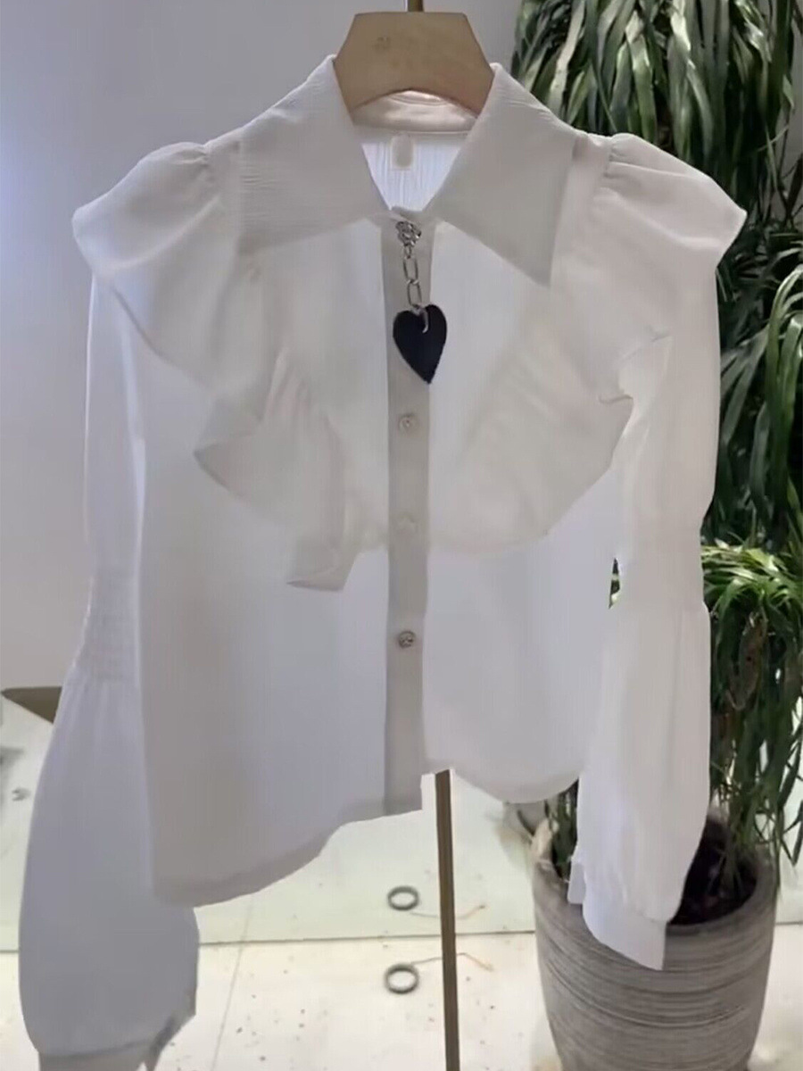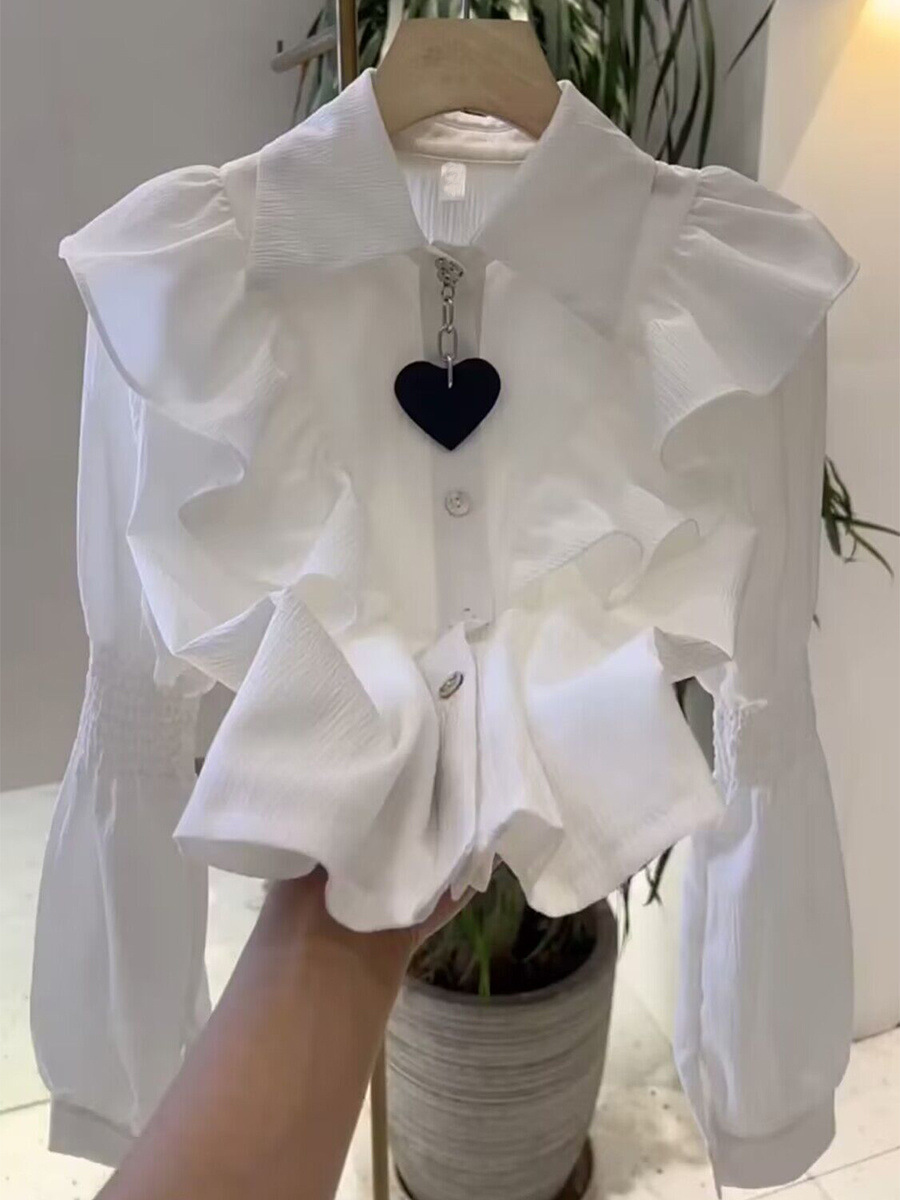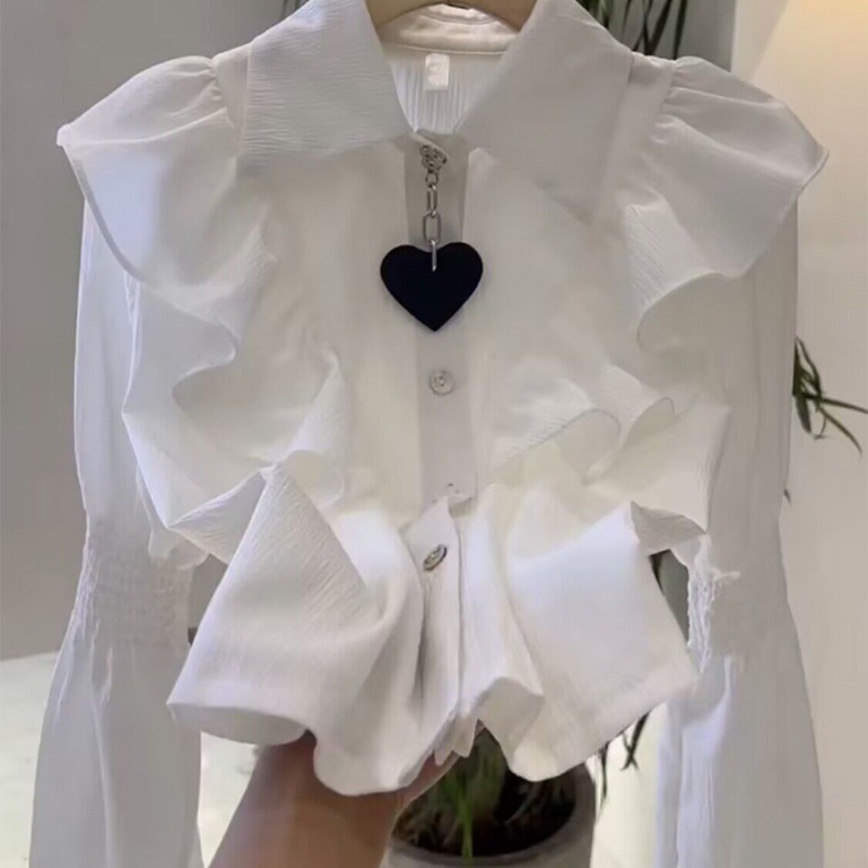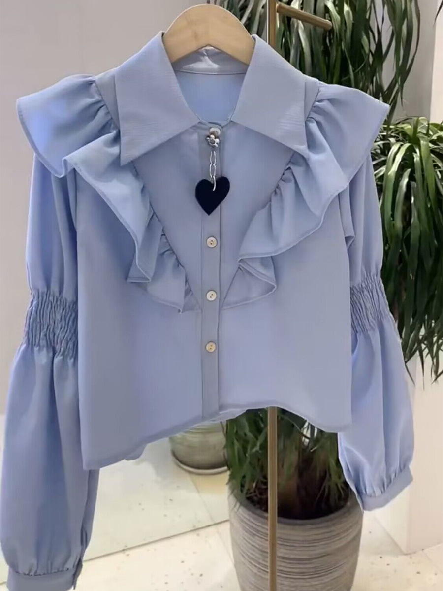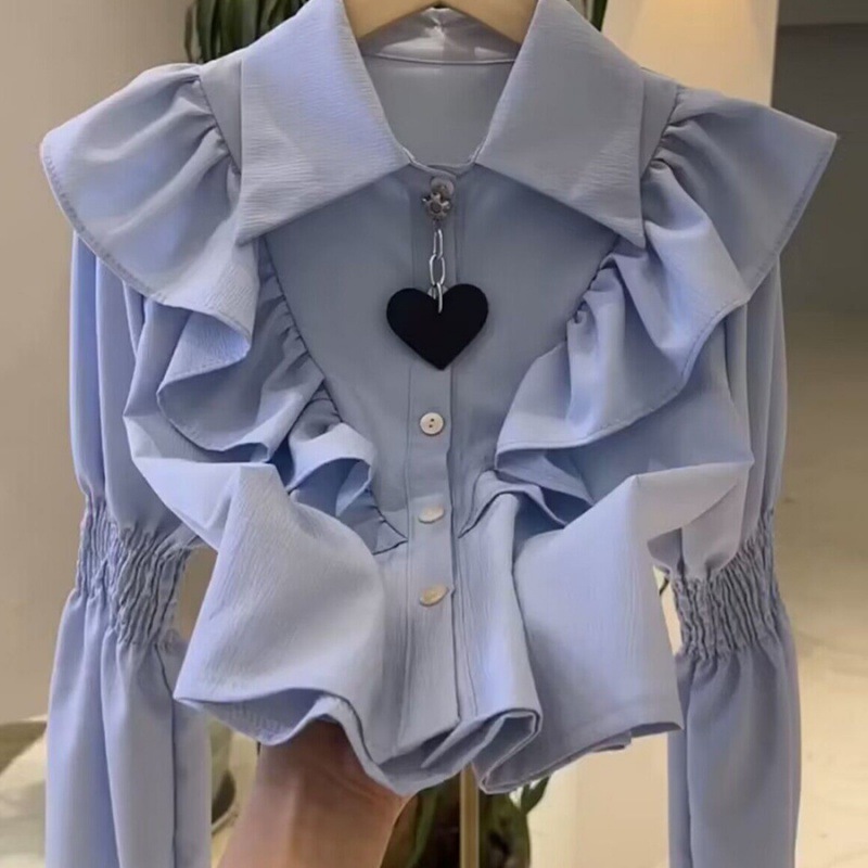 한국식 러플 퍼프 슬리브 해피 셔츠 여성의 2023 봄 하이 엔드 센스 디자인 센스 달콤한 긴팔 탑 트렌디