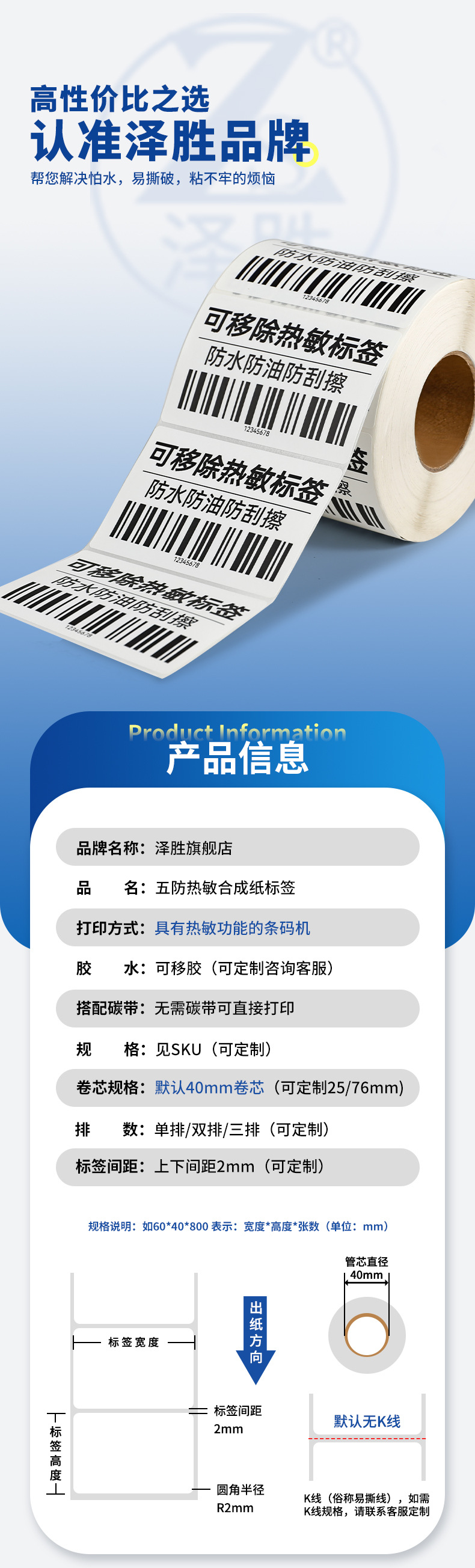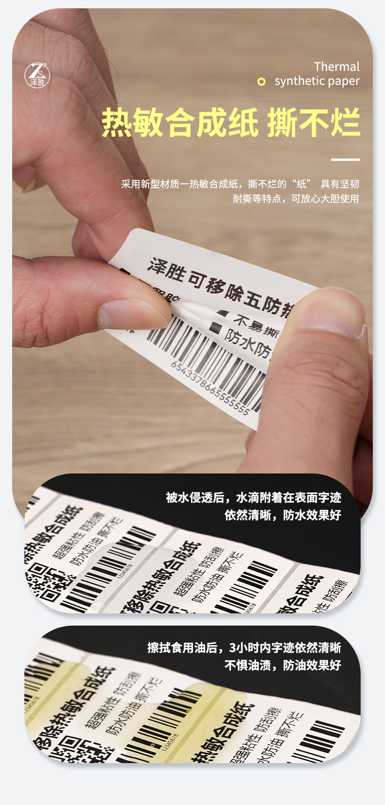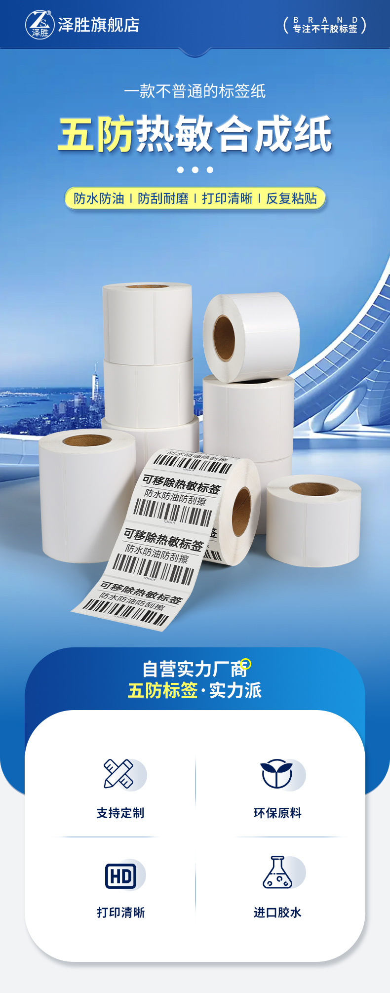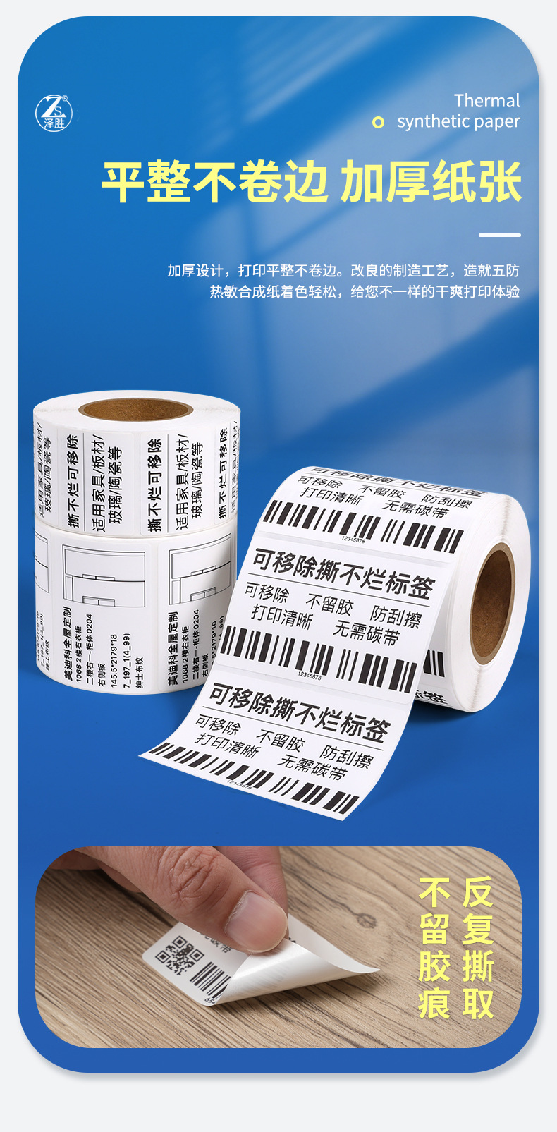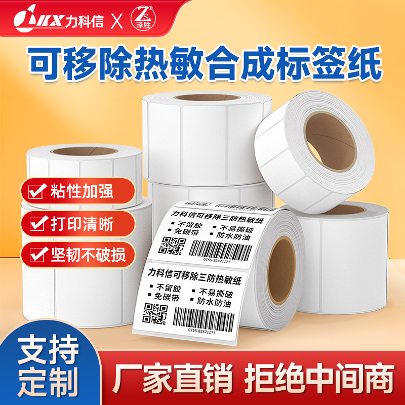 5 가지 방지 감열지 의류 시트 접착 라벨 접착제를 남기지 않고 찢어지기 쉬운 탈착식 눈물 열에 민감한 합성 종이스토어 가기