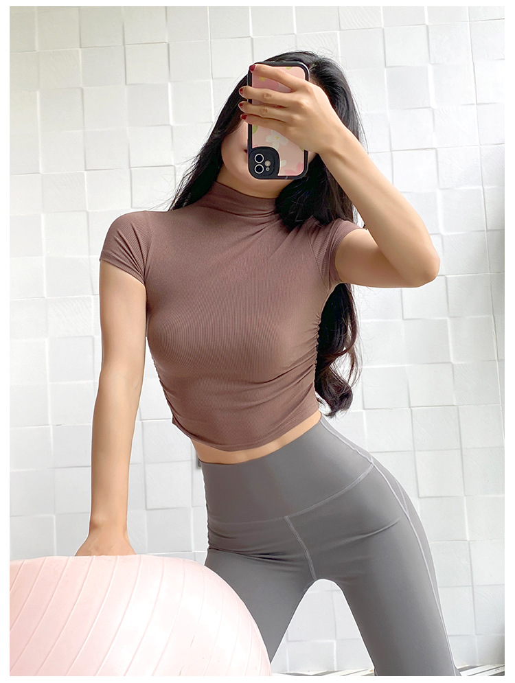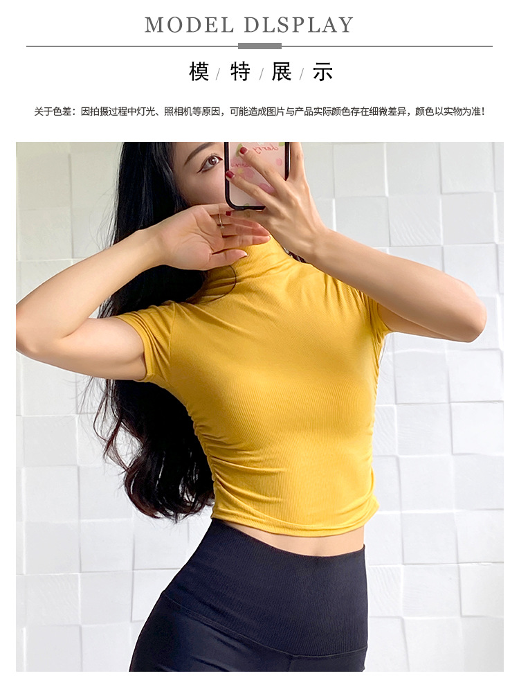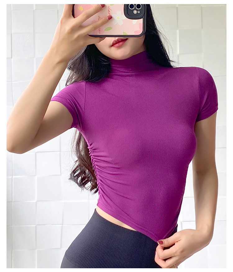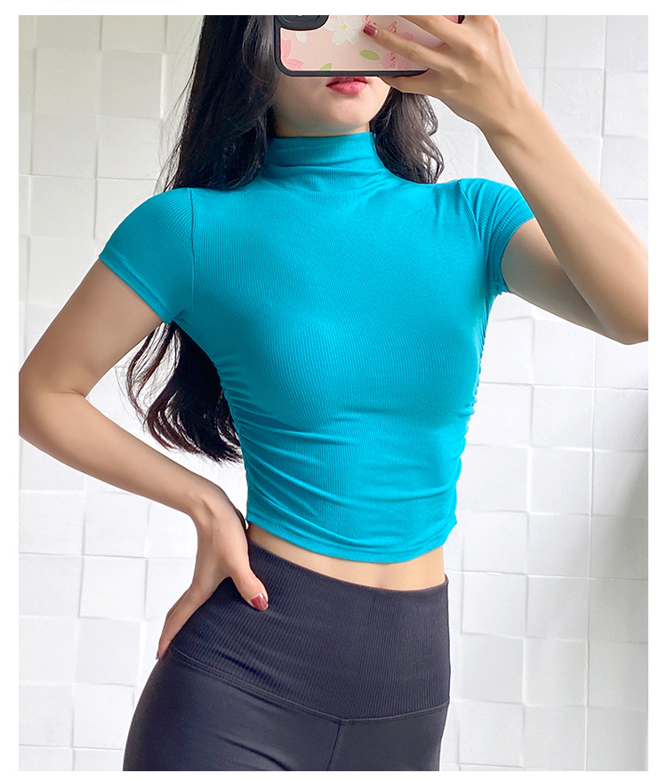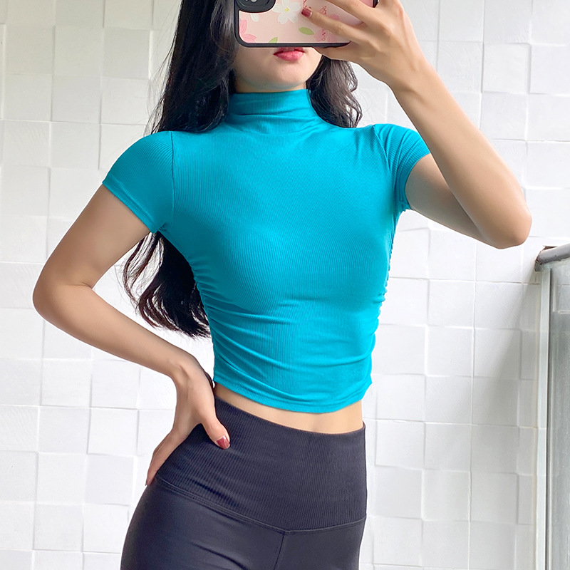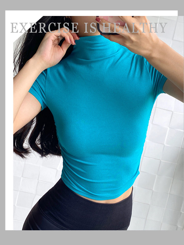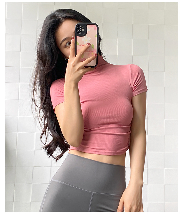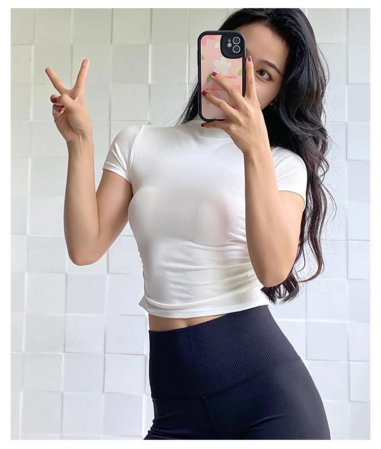 여성용 마이크로 하이넥 스포츠 탑 2024년 신상 여름 요가복 반팔 몸매를 가려주는 타이트 티셔츠 러닝 피트니스복스토어 가기