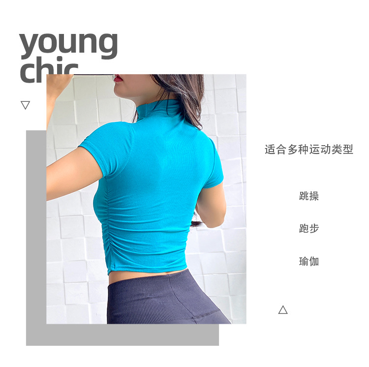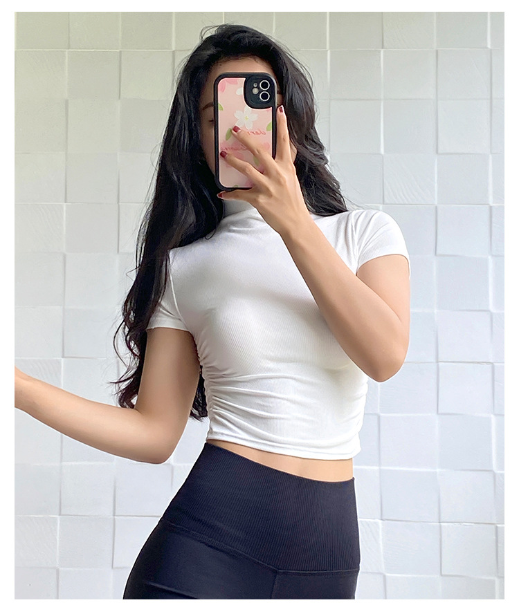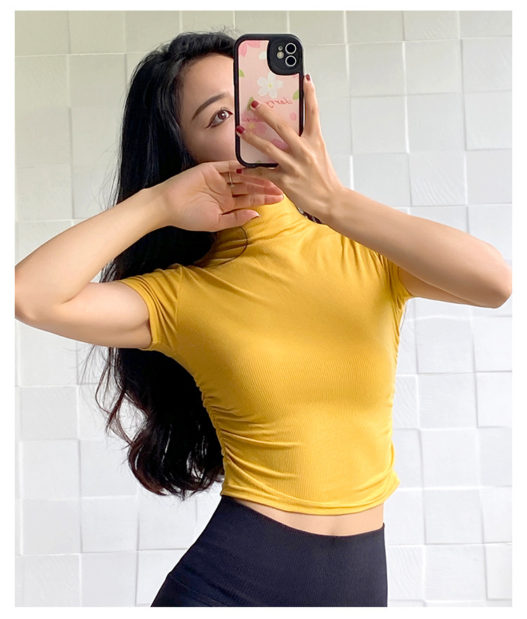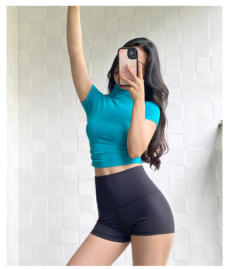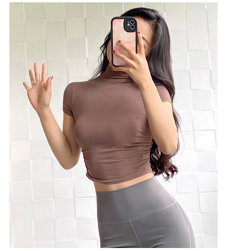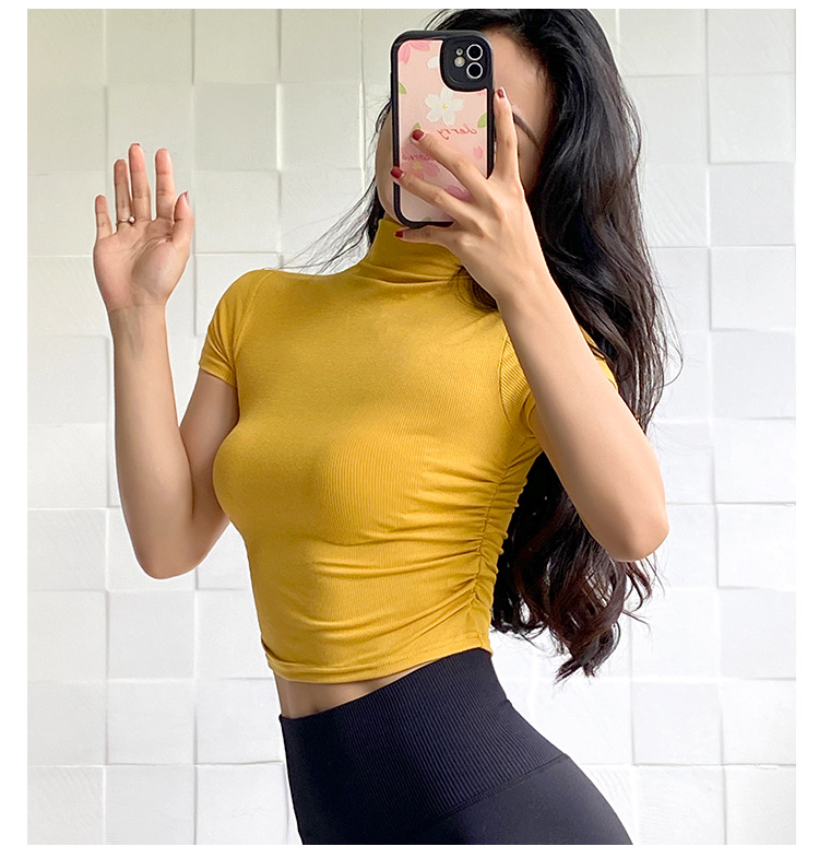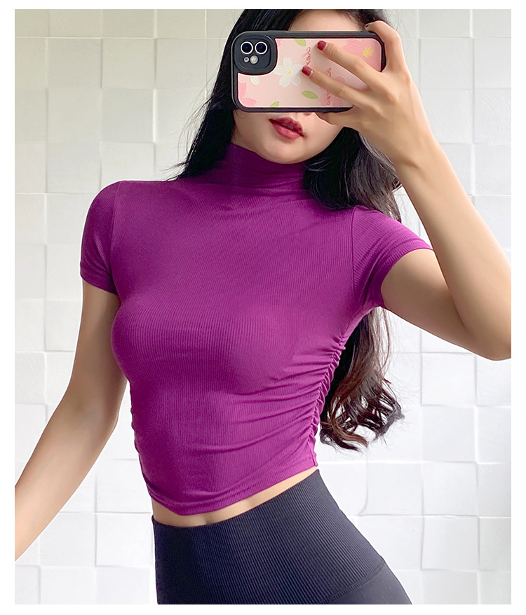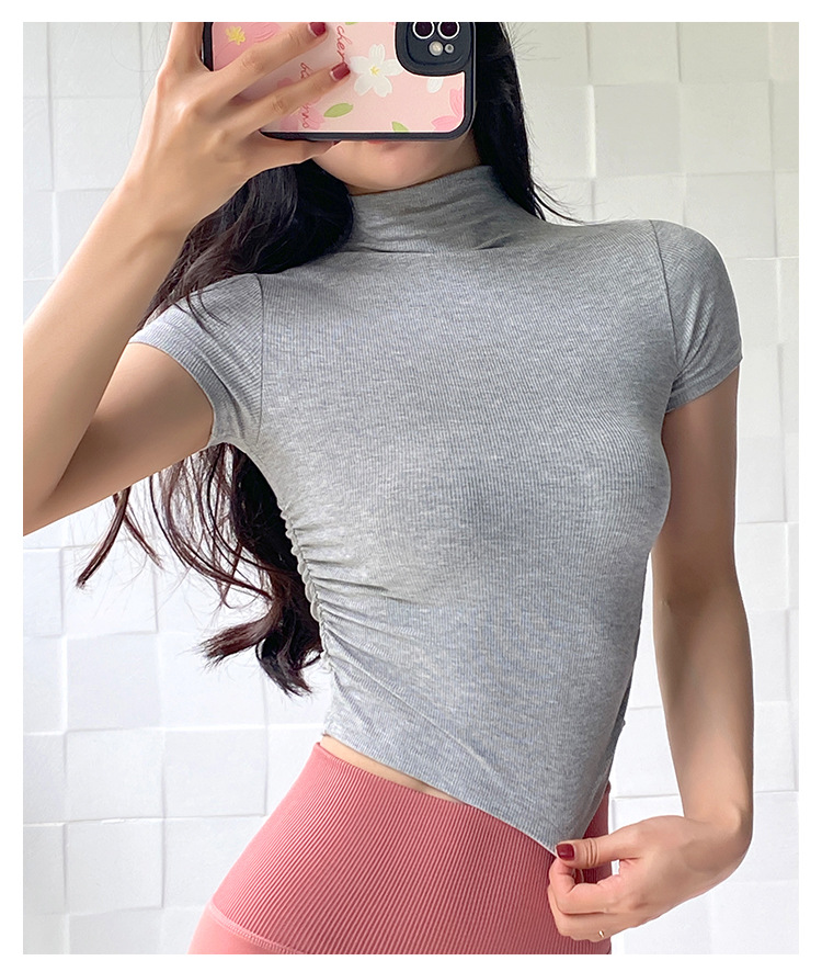 여성용 마이크로 하이넥 스포츠 탑 2024년 신상 여름 요가복 반팔 몸매를 가려주는 타이트 티셔츠 러닝 피트니스복스토어 가기