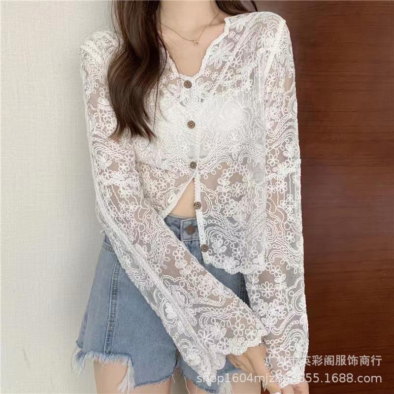 양식화 된 V-넥 크로 셰 뜨개질 중공 긴팔 레이스 베이스 셔츠 여성의 가을 새로운 한국식 루즈한 모든 매치 틈새 탑스토어 가기