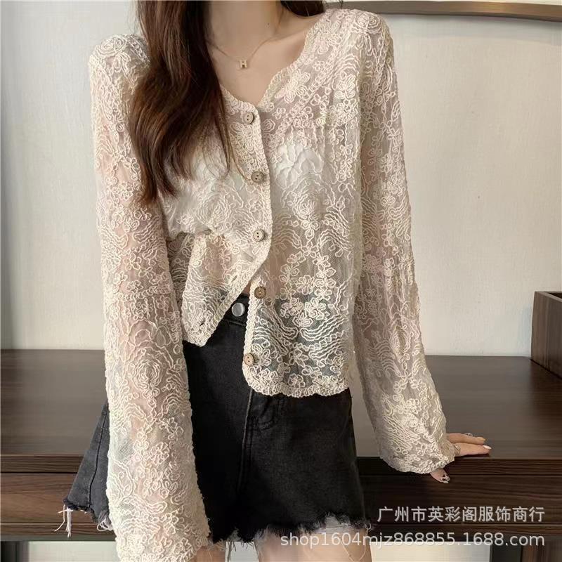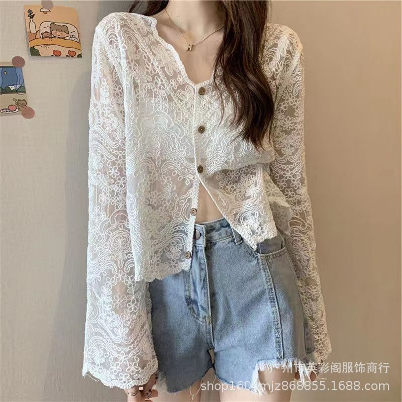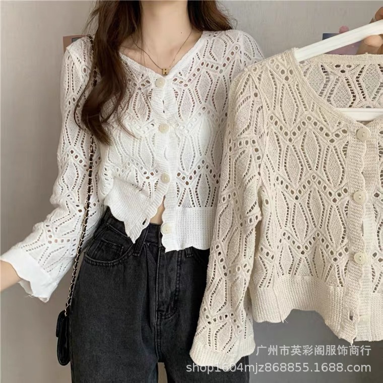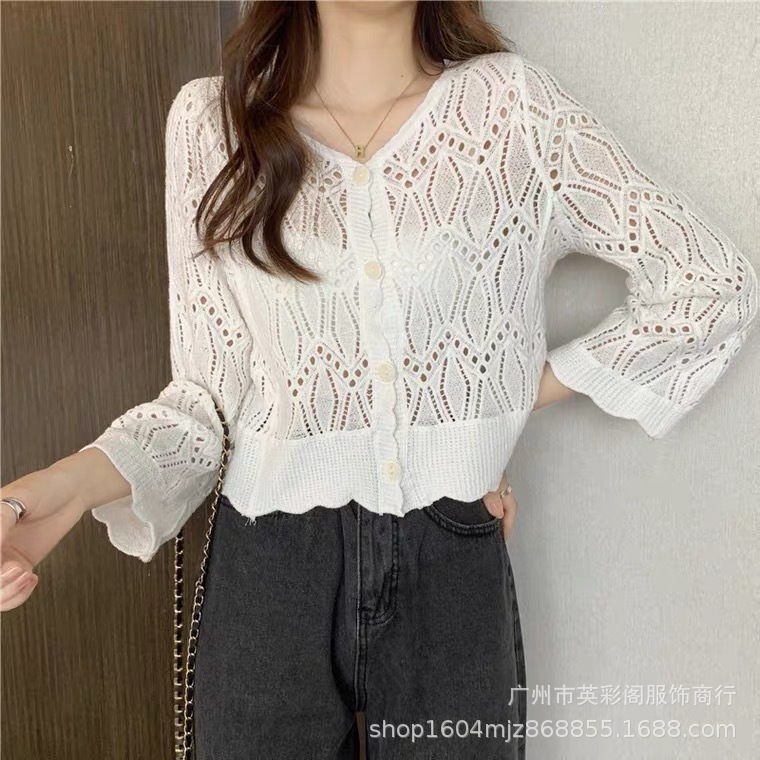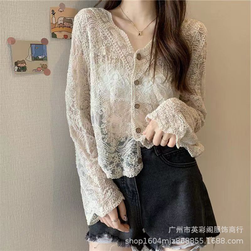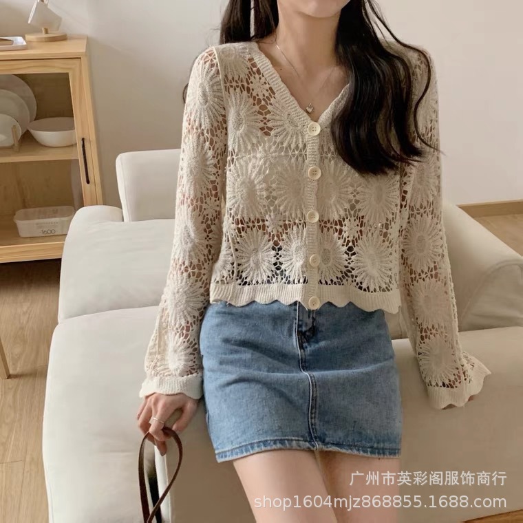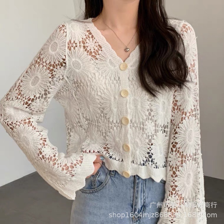 양식화 된 V-넥 크로 셰 뜨개질 중공 긴팔 레이스 베이스 셔츠 여성의 가을 새로운 한국식 루즈한 모든 매치 틈새 탑
