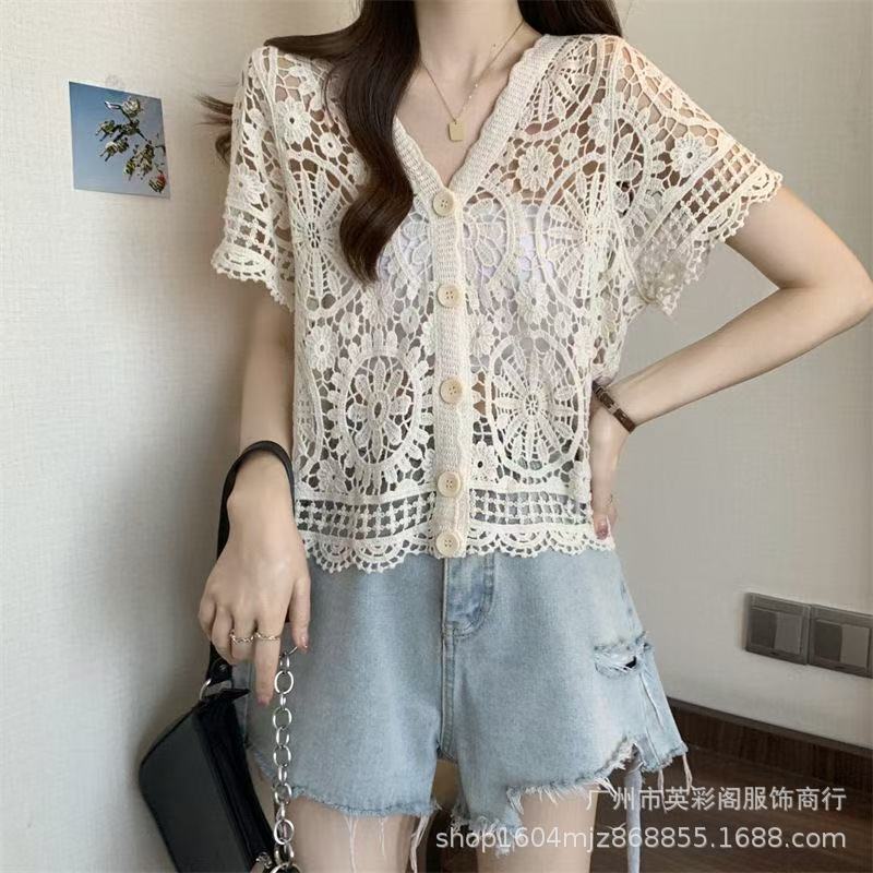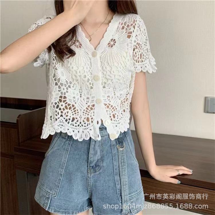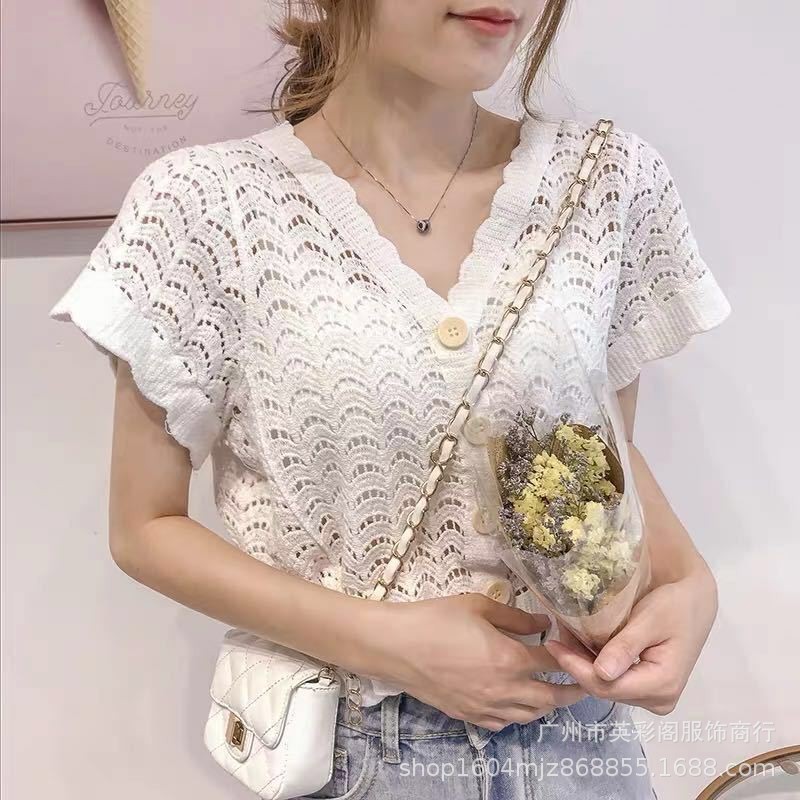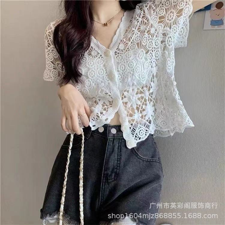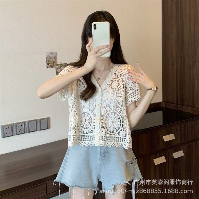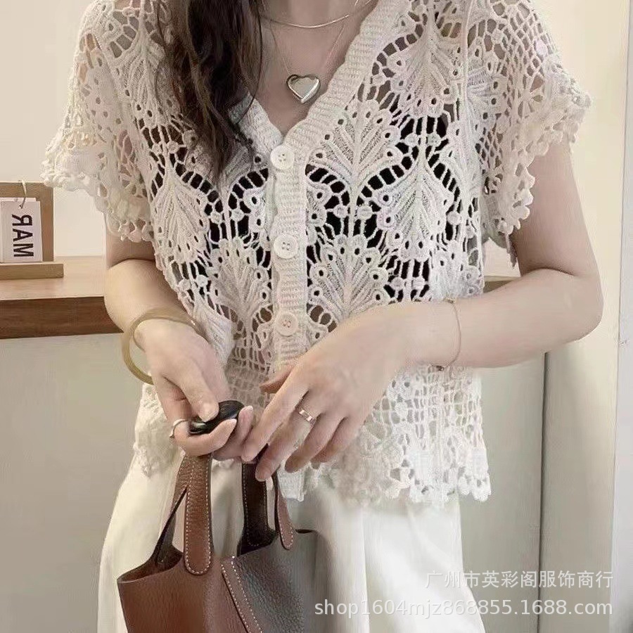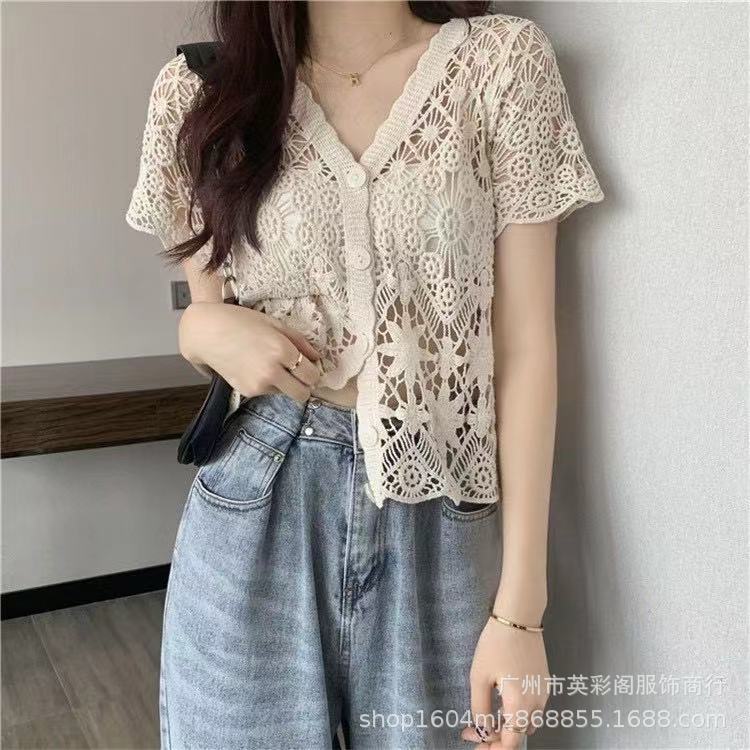 양식화 된 V-넥 크로 셰 뜨개질 중공 긴팔 레이스 베이스 셔츠 여성의 가을 새로운 한국식 루즈한 모든 매치 틈새 탑
