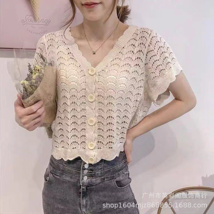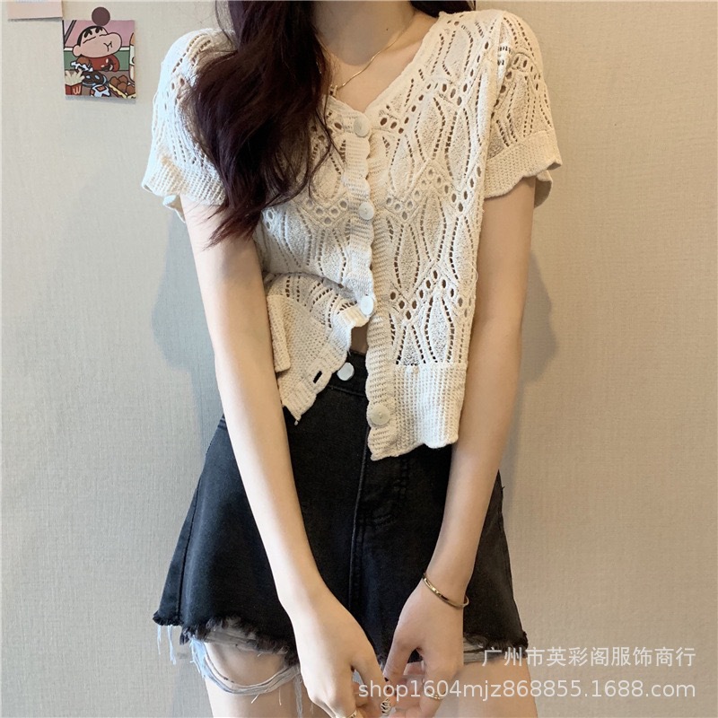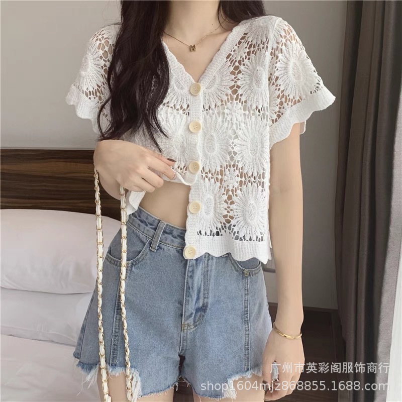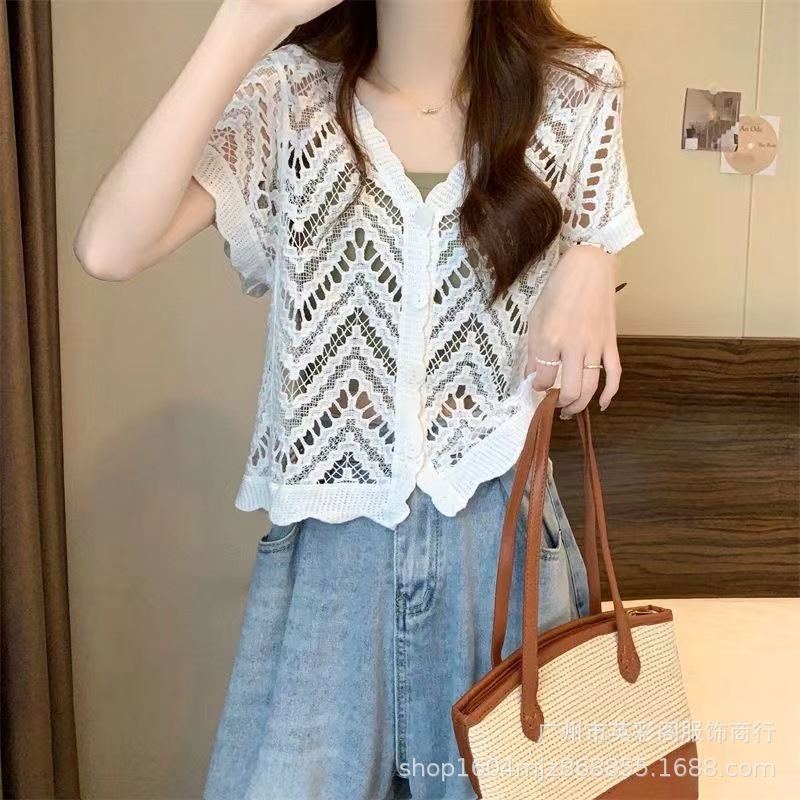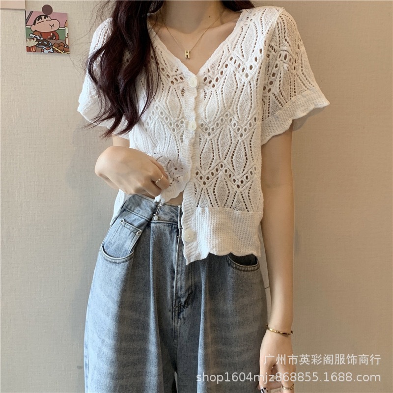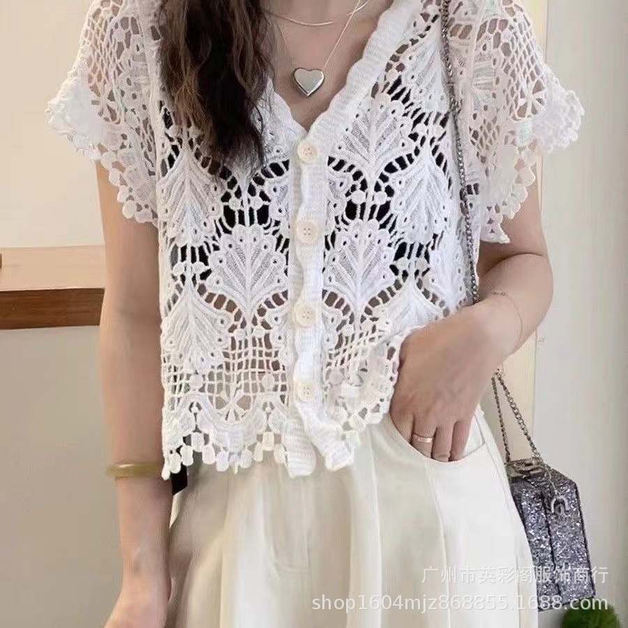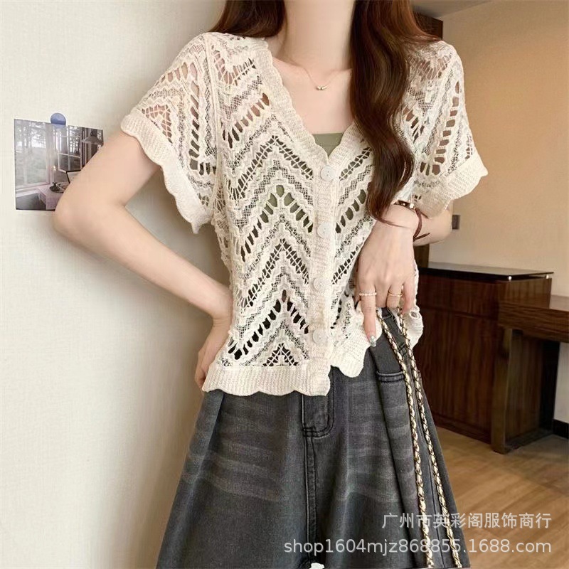 양식화 된 V-넥 크로 셰 뜨개질 중공 긴팔 레이스 베이스 셔츠 여성의 가을 새로운 한국식 루즈한 모든 매치 틈새 탑
