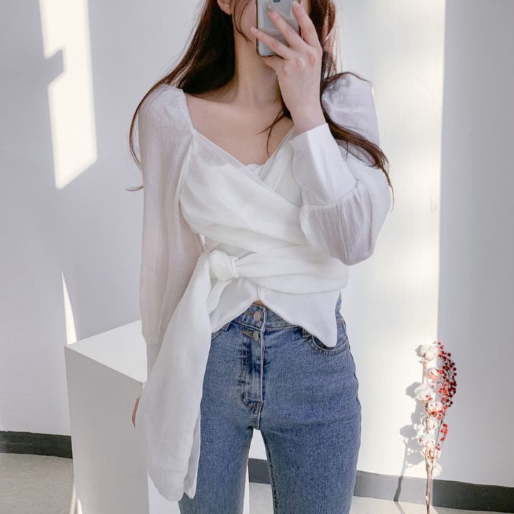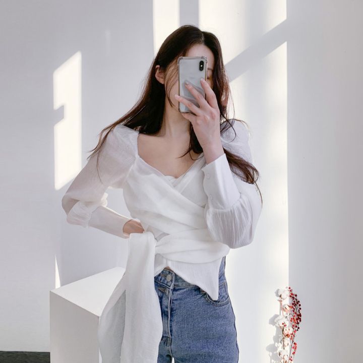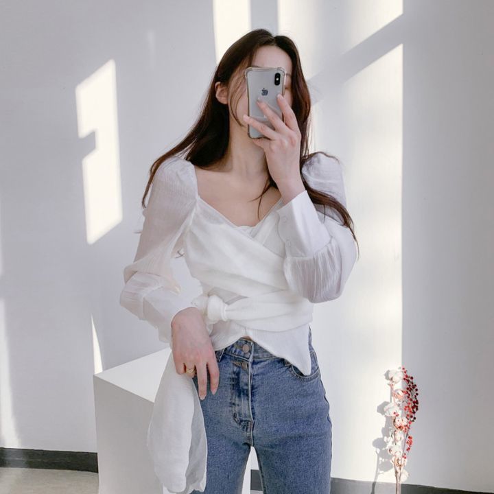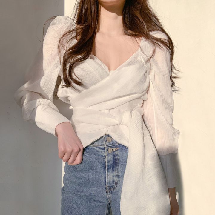 한국식 2023 봄과 가을 우아한 우아한 주름진 V 넥 크로스 스트랩 디자인 감각 틈새 쉬폰 셔츠 탑스토어 가기