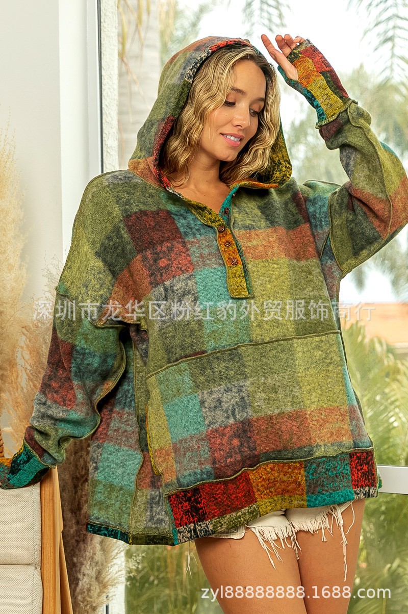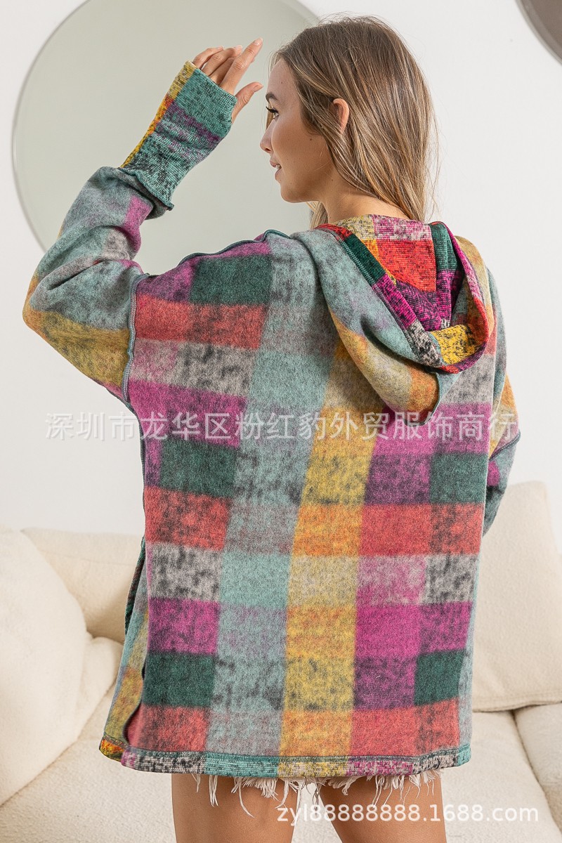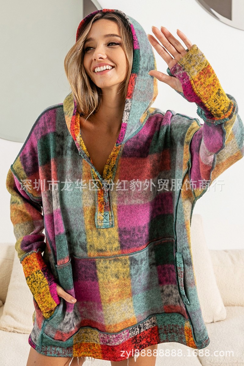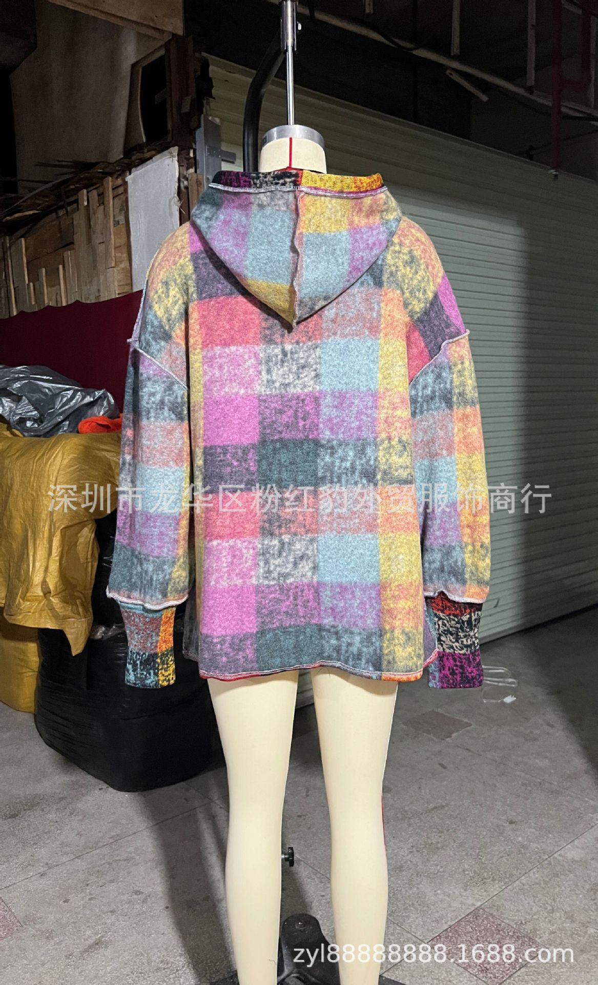 유럽과 미국의 폭발 이베이 아마존 가을/겨울 새로운 여성의 패션 다채로운 격자 후드 풀오버 양털 스웨터스토어 가기