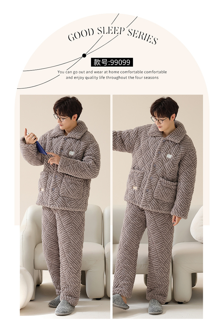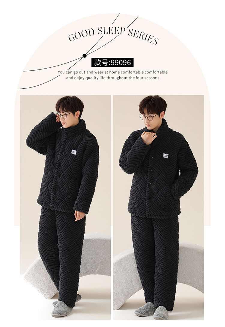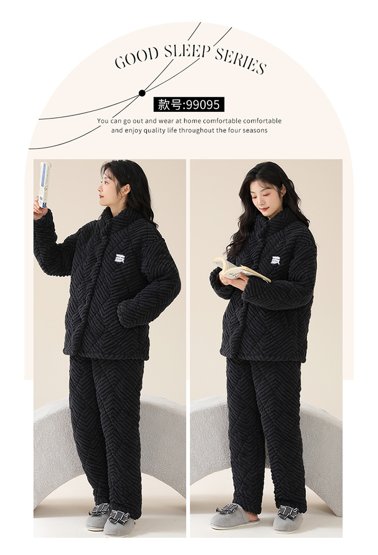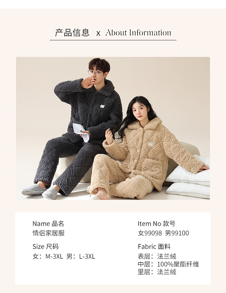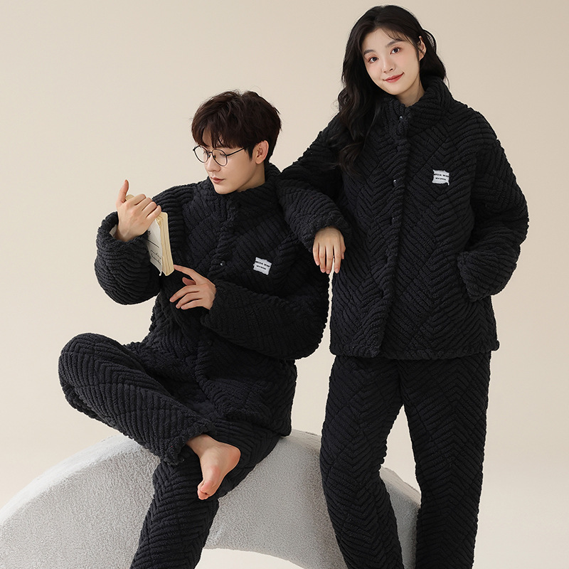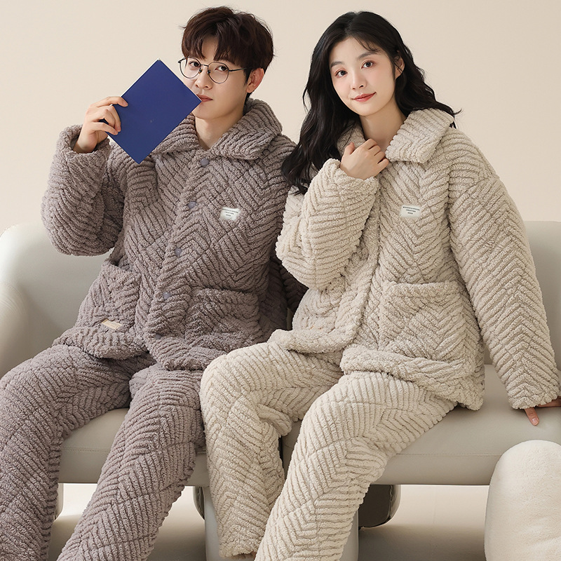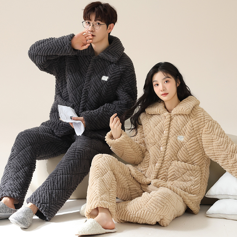 커플 잠옷 겨울 3 층 두꺼운 누비 이불 산호 양털 따뜻한 플란넬 카디건 남성과 여성의 가정 의류 세트