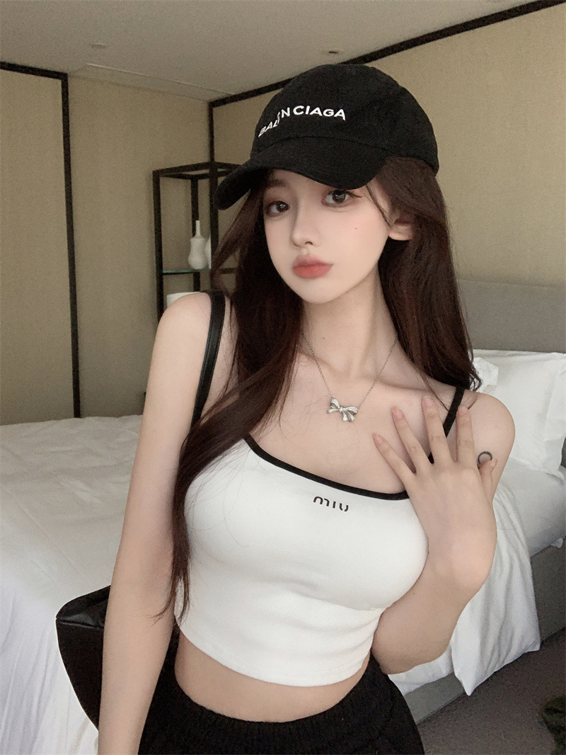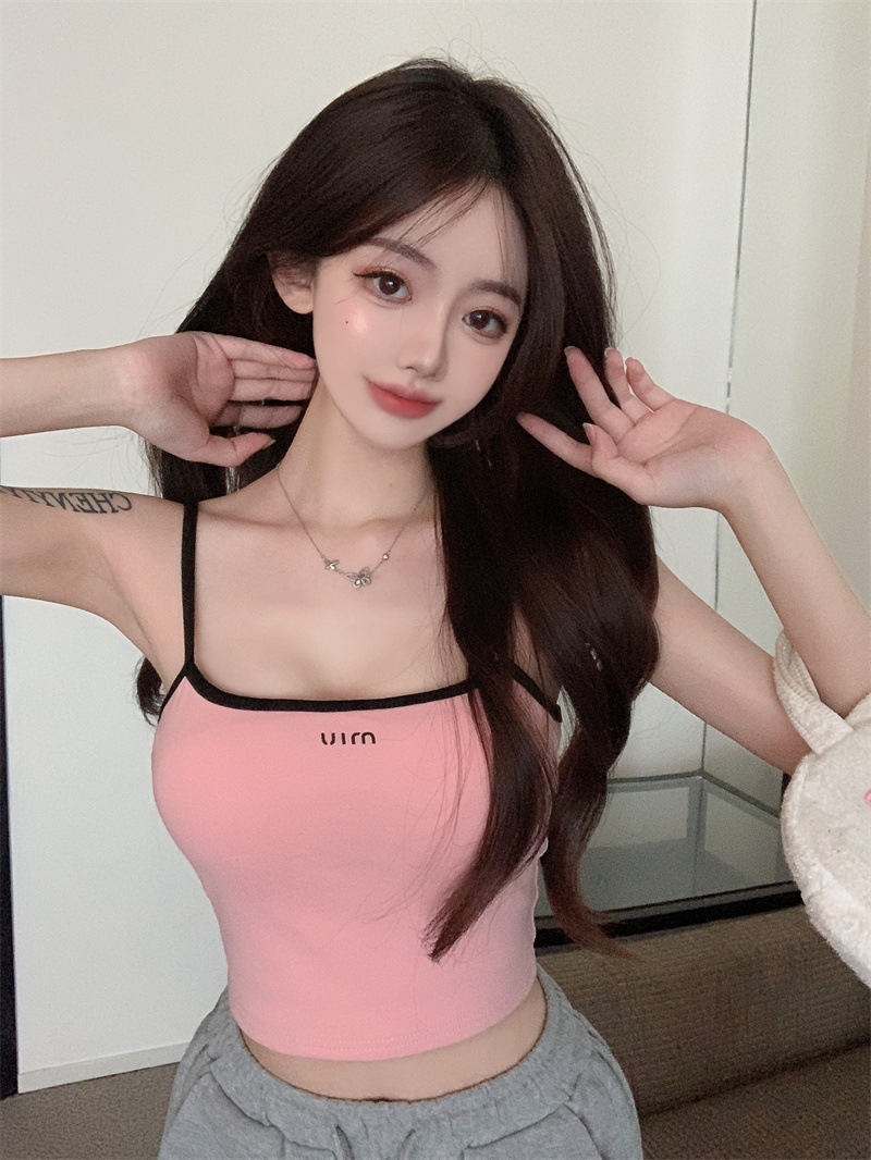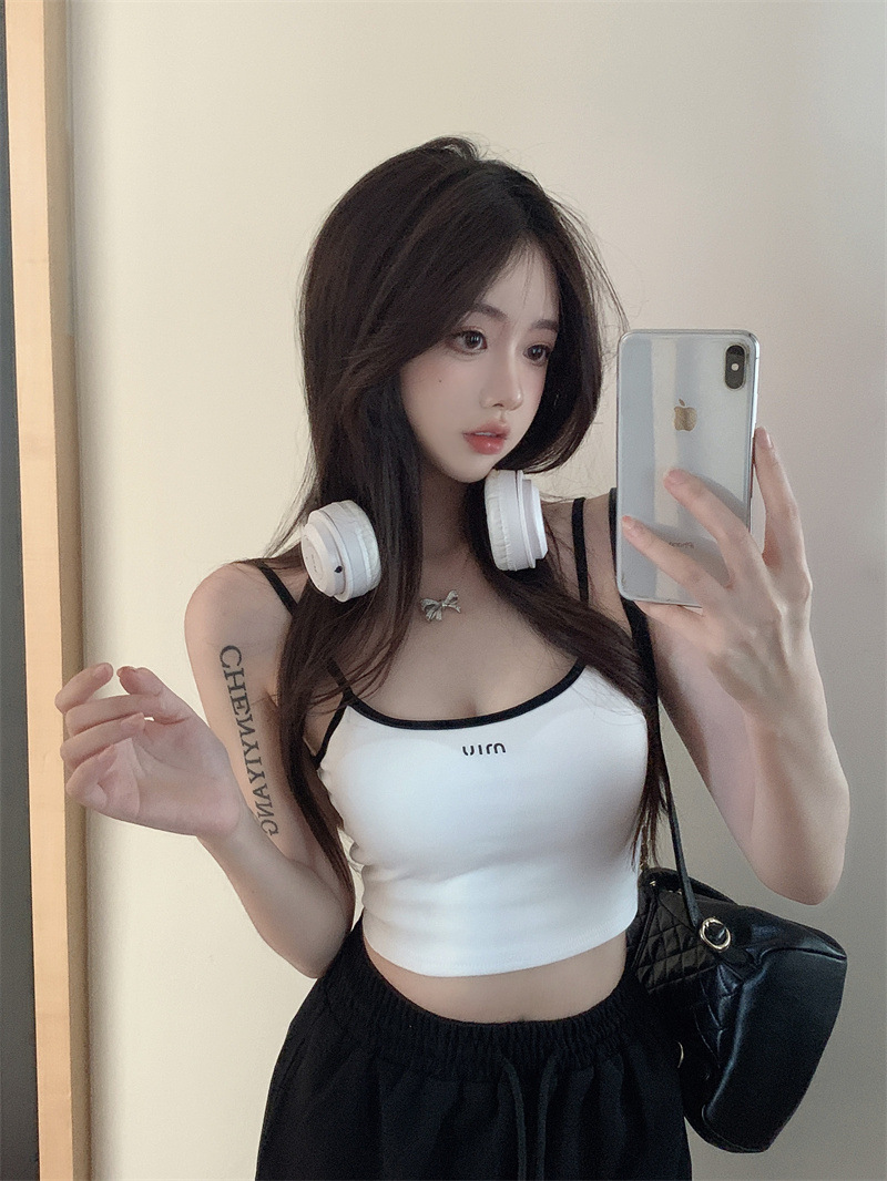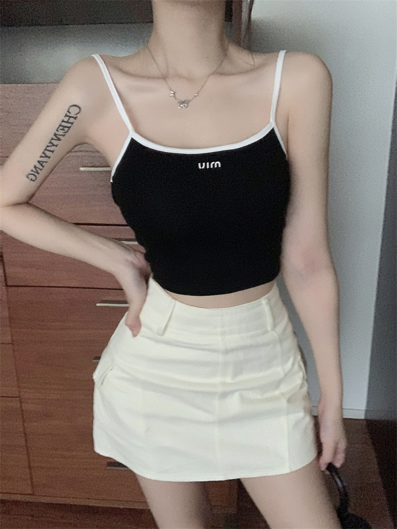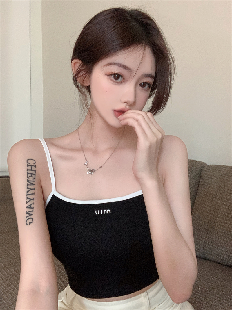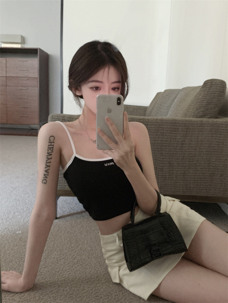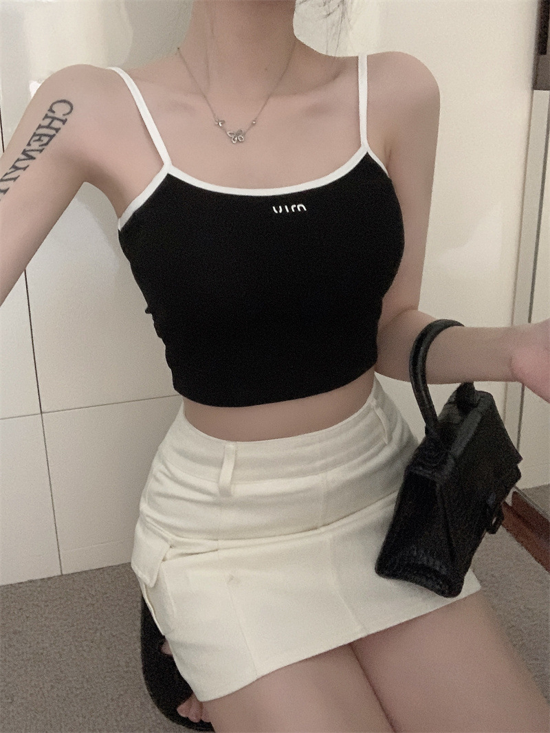 홍콩 스타일 스파이스 걸 대조 색상 캐미솔 여성용 봄 아우터 타이트 레터 프린트 가슴 패드가있는 짧은 내부 탑