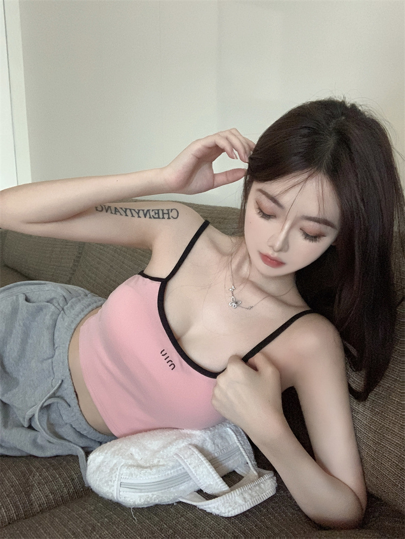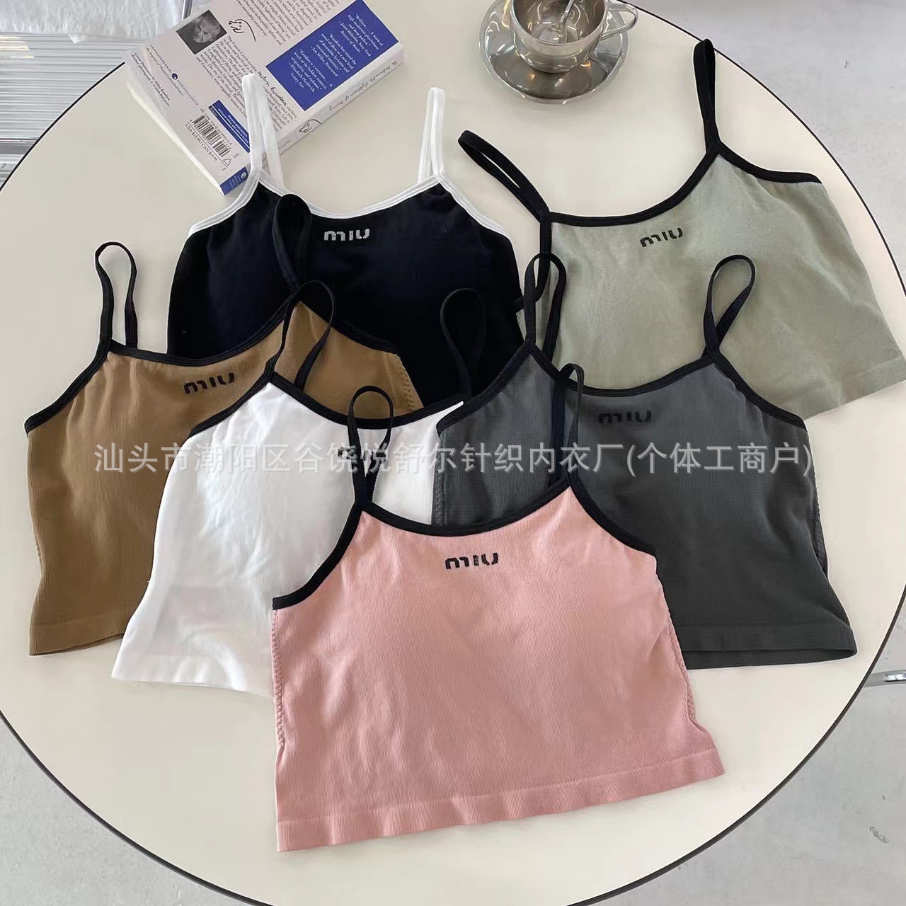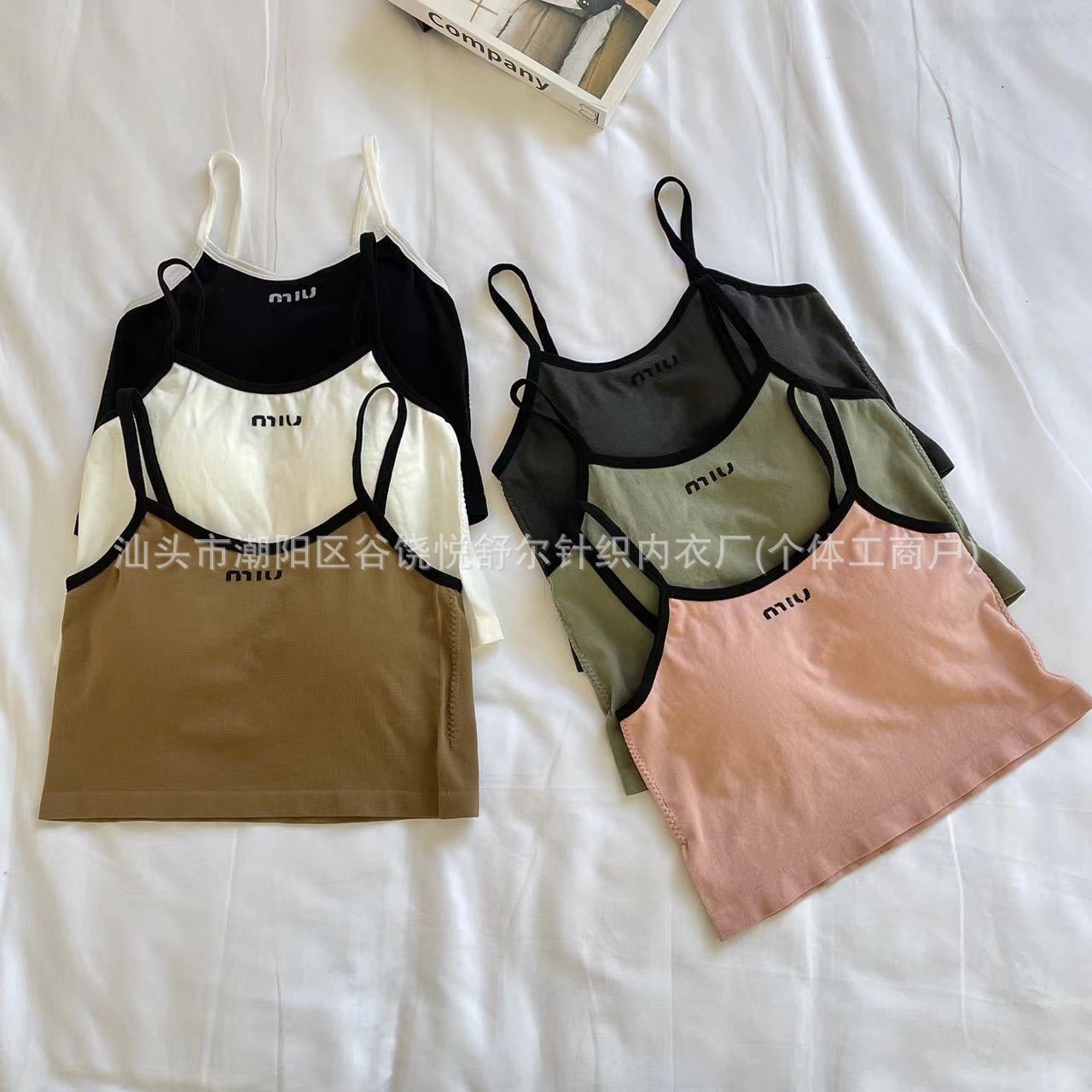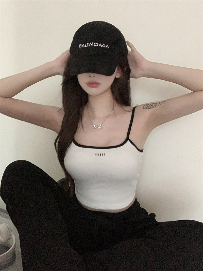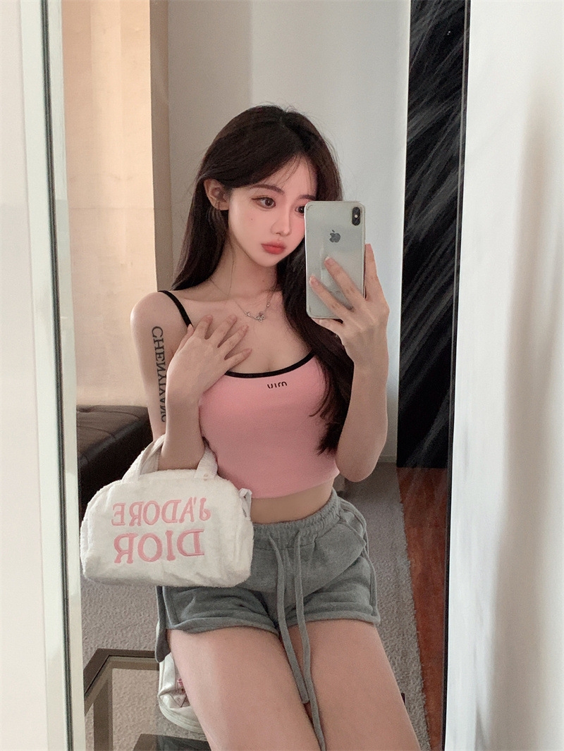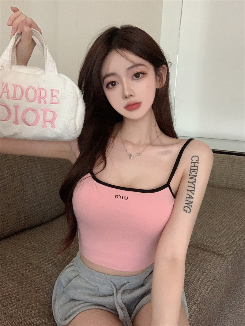 홍콩 스타일 스파이스 걸 대조 색상 캐미솔 여성용 봄 아우터 타이트 레터 프린트 가슴 패드가있는 짧은 내부 탑