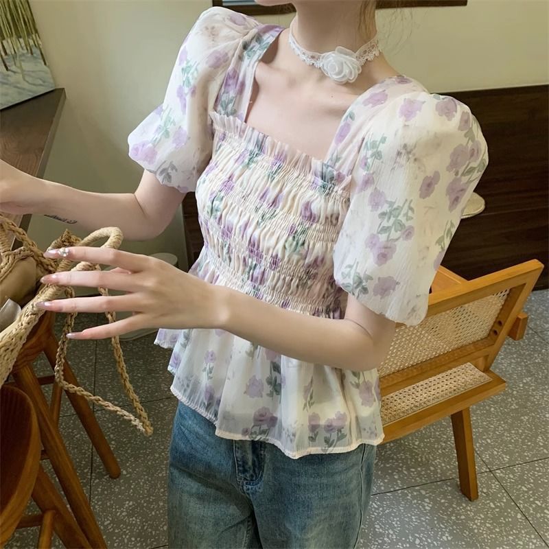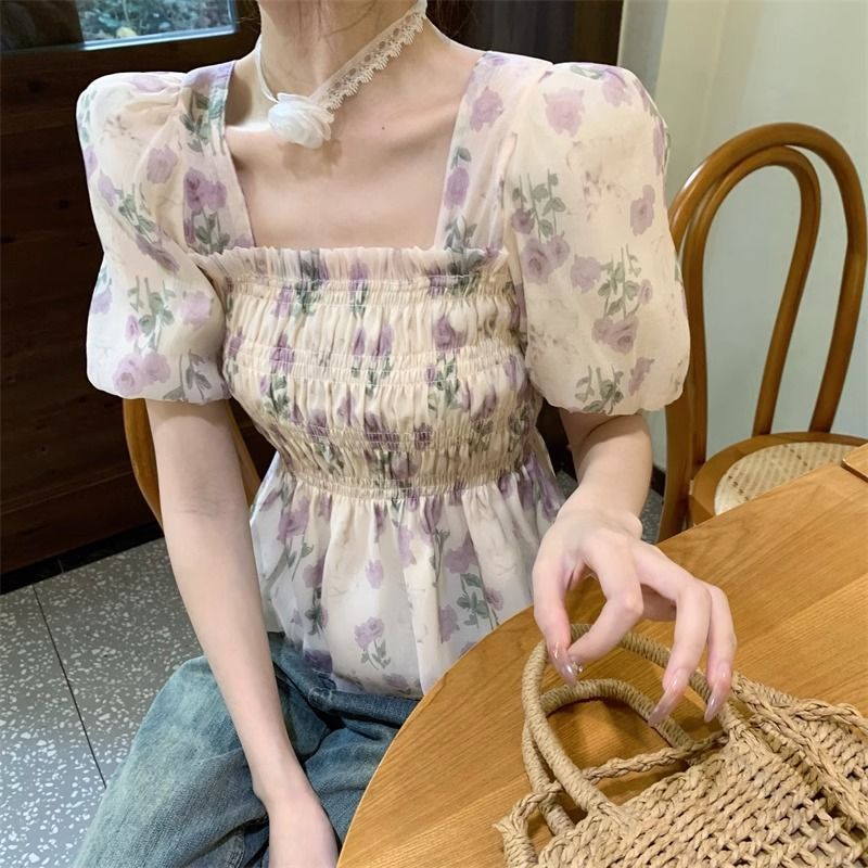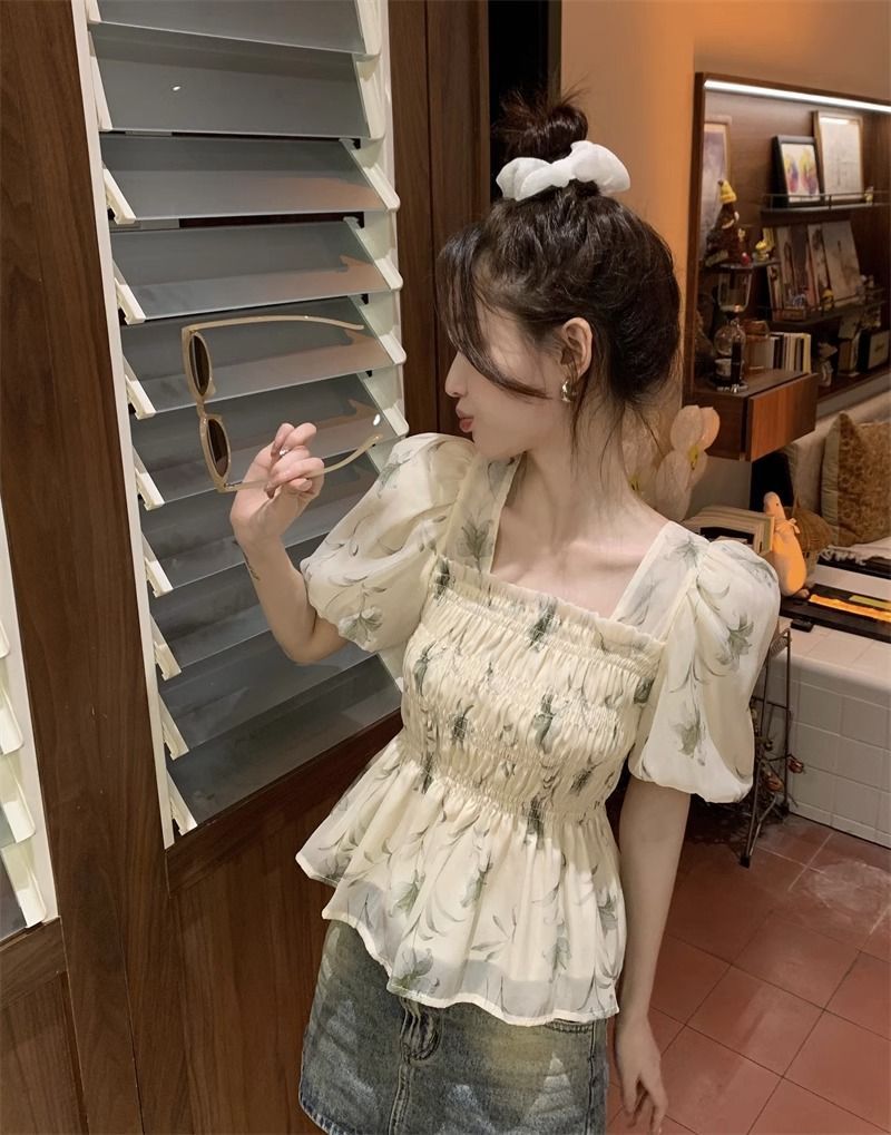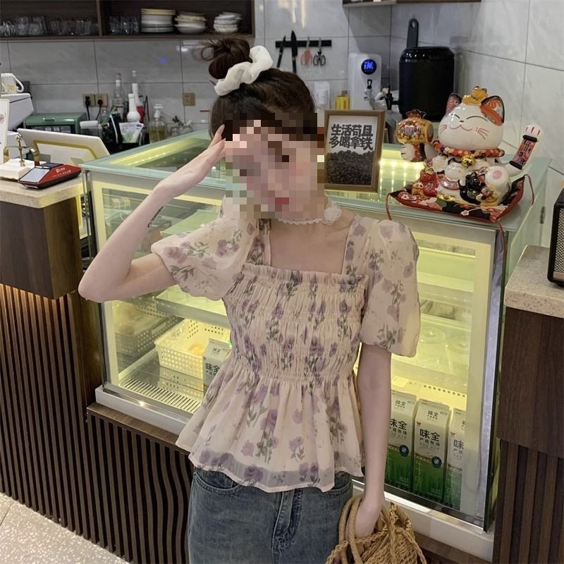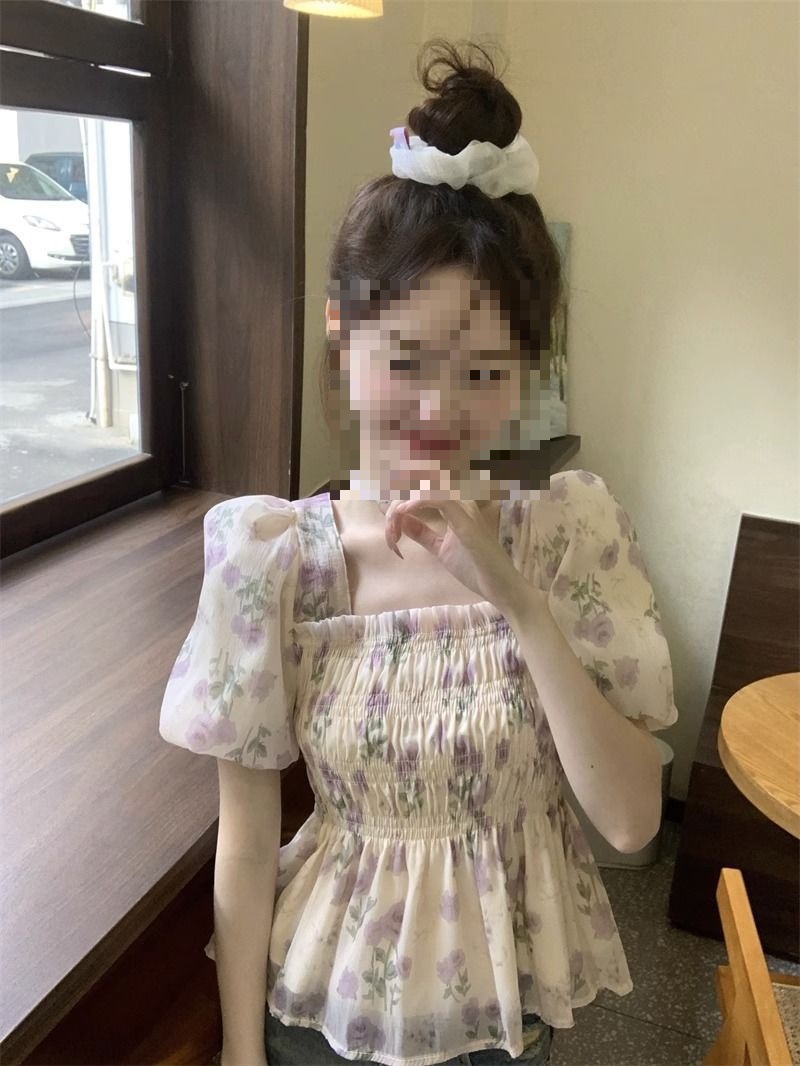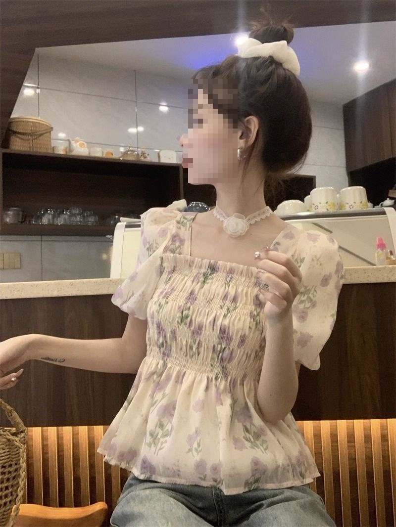 한국 스타일 달콤한 꽃 쉬폰 탑 여름 느슨한 스퀘어 칼라 퍼프 슬리브 디자인 틈새 선 스크린 셔츠 여성용스토어 가기